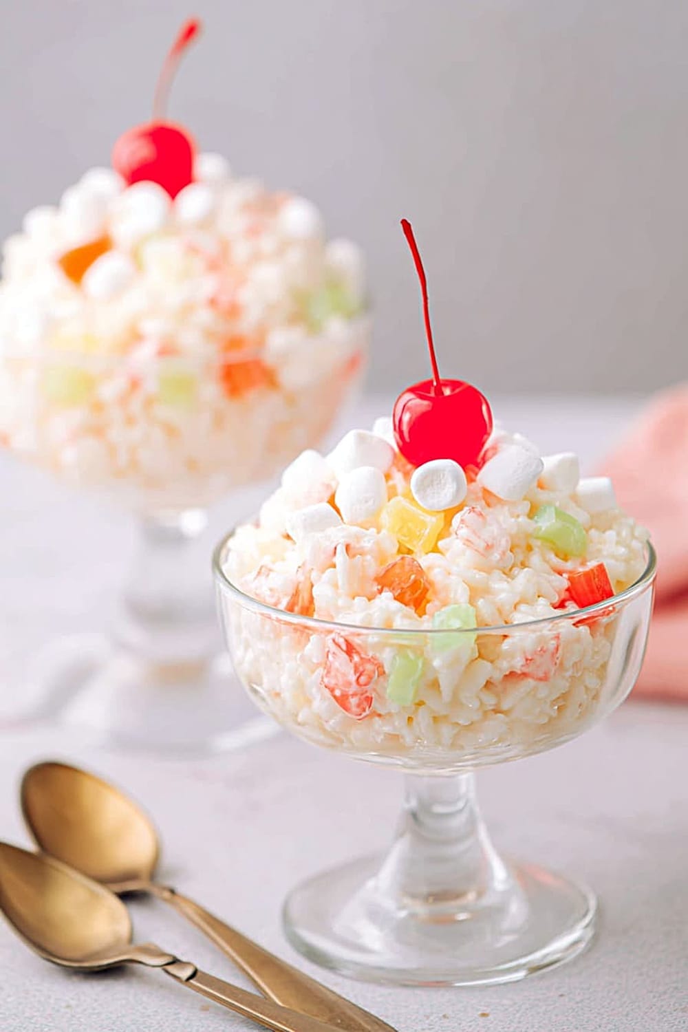 Prepare up to 24 hours ahead – flavors actually improve with time as they meld together. Store covered in refrigerator for up to 3 days, though texture is best within 48 hours. Don’t freeze – Cool Whip separates and rice becomes mushy when thawed. Refresh before serving with a gentle stir and fresh cherry garnishes.
