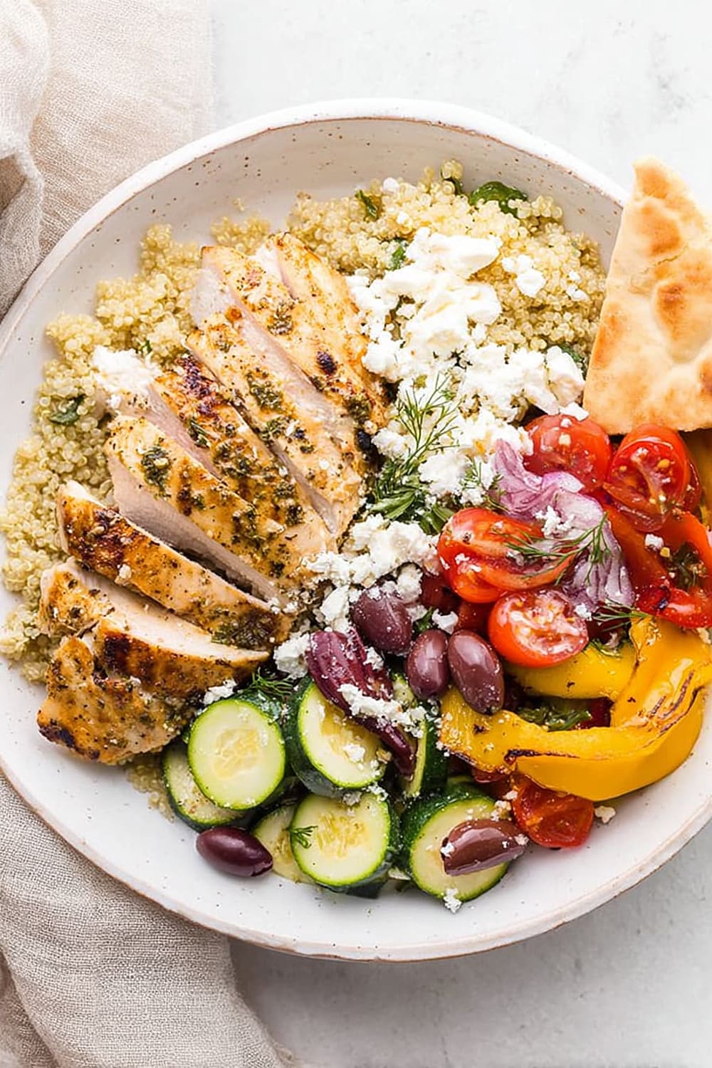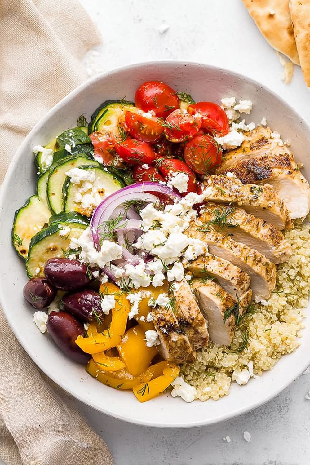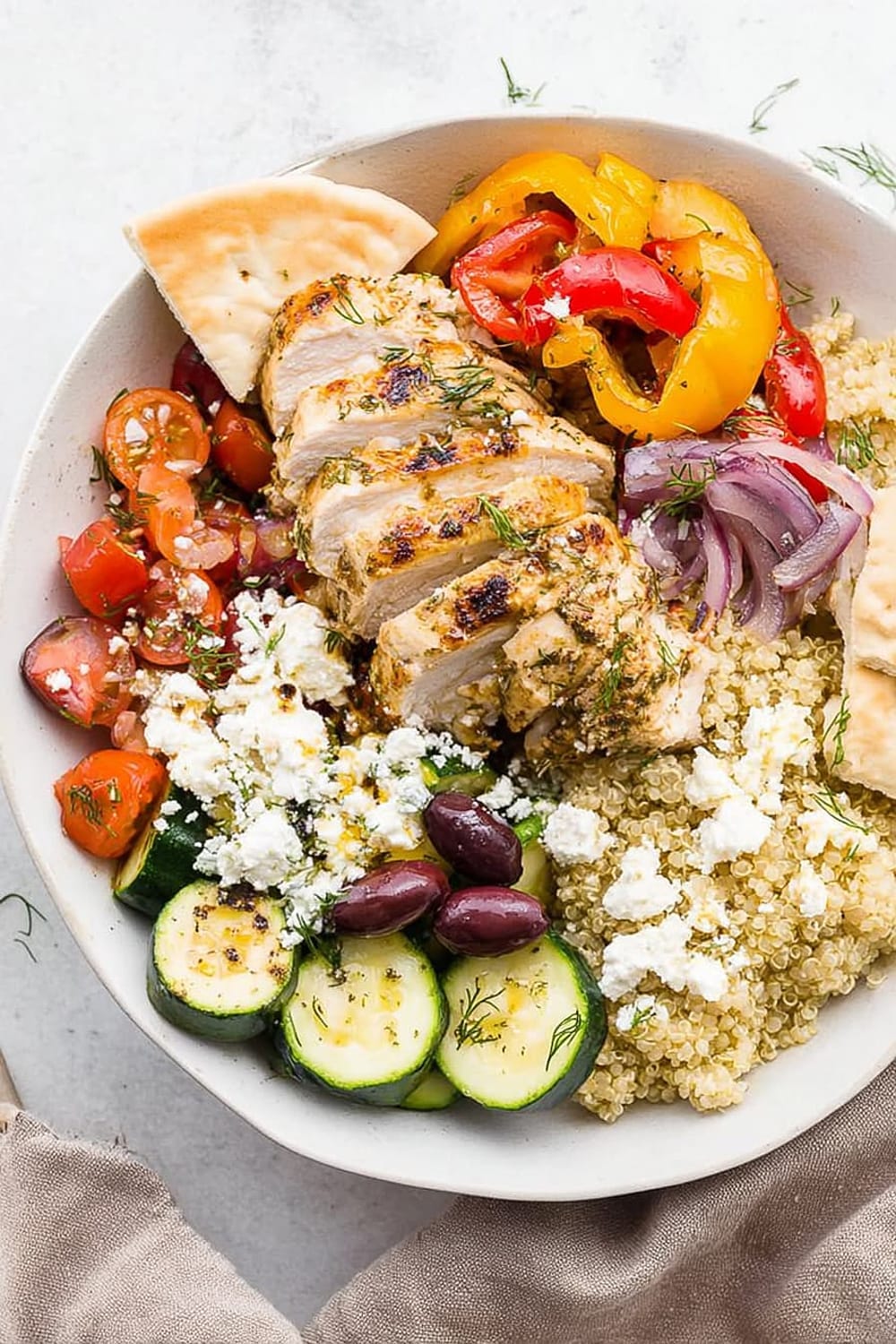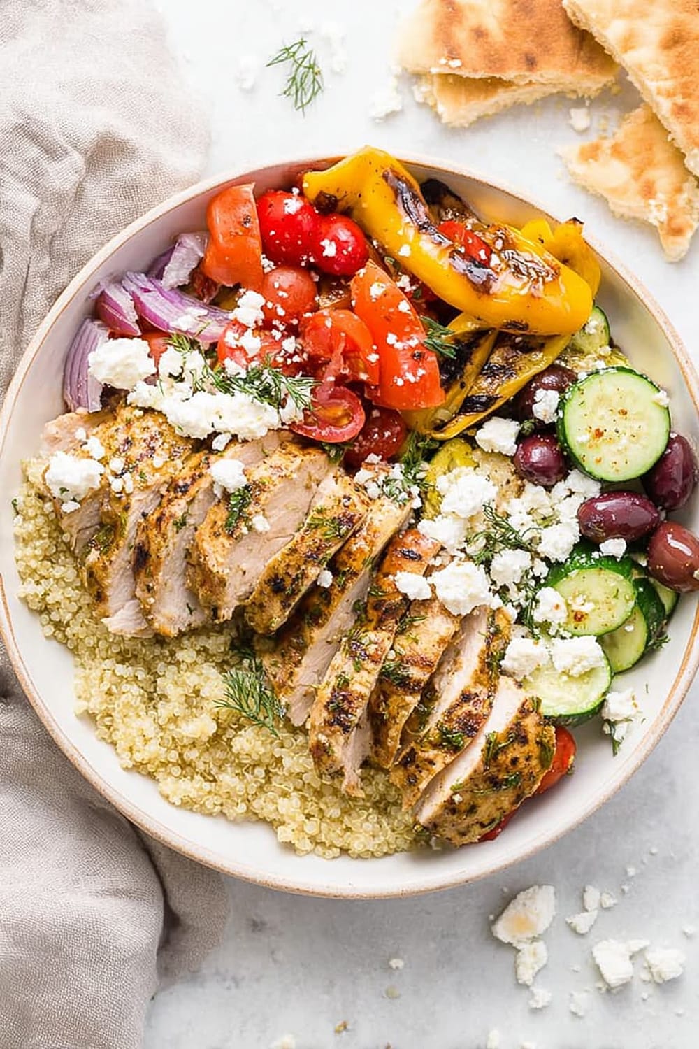 The chicken breast provides all nine essential amino acids, supporting muscle maintenance and satiety. Quinoa is a complete protein grain rich in magnesium, iron, and folate, making this bowl particularly nutritious. The colorful bell peppers and tomatoes are loaded with vitamin C and lycopene, powerful antioxidants that support immune function and heart health. Kalamata olives contribute monounsaturated fats and vitamin E, while feta cheese adds calcium and probiotics for bone and digestive health.