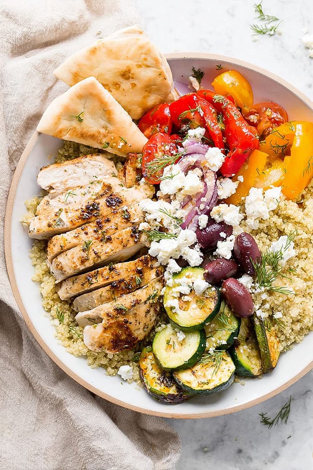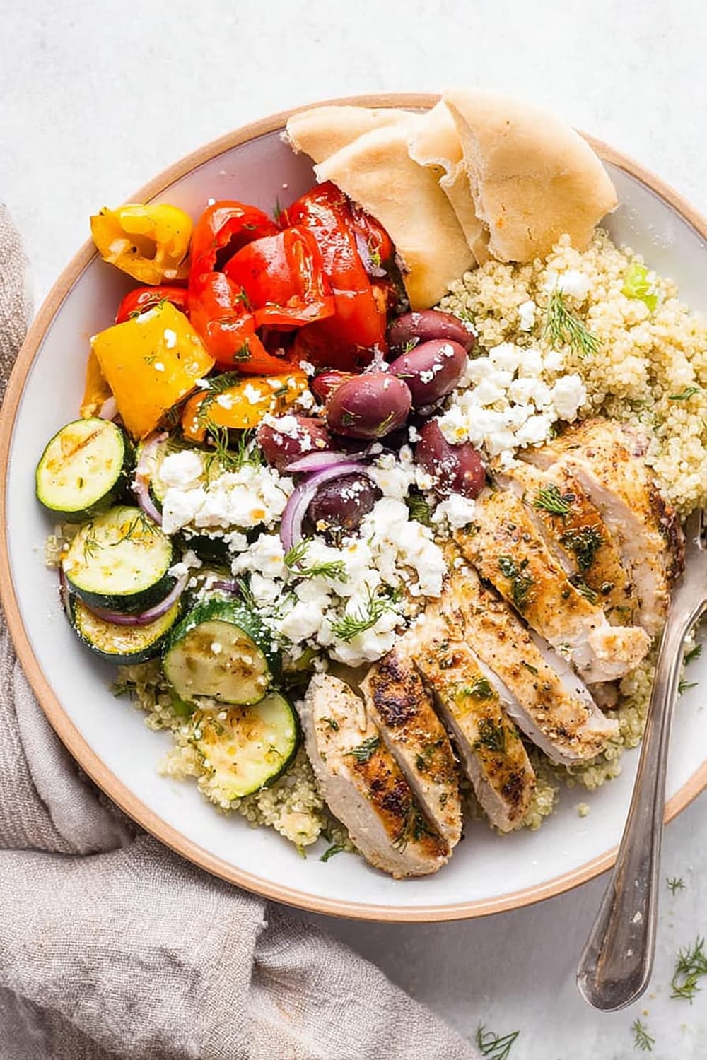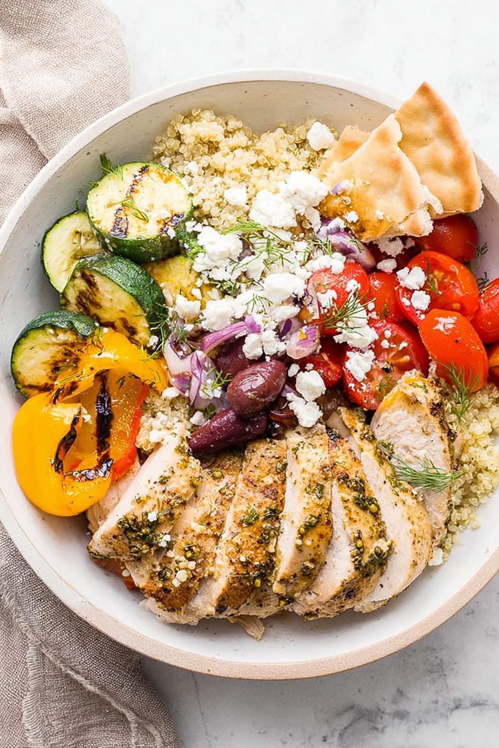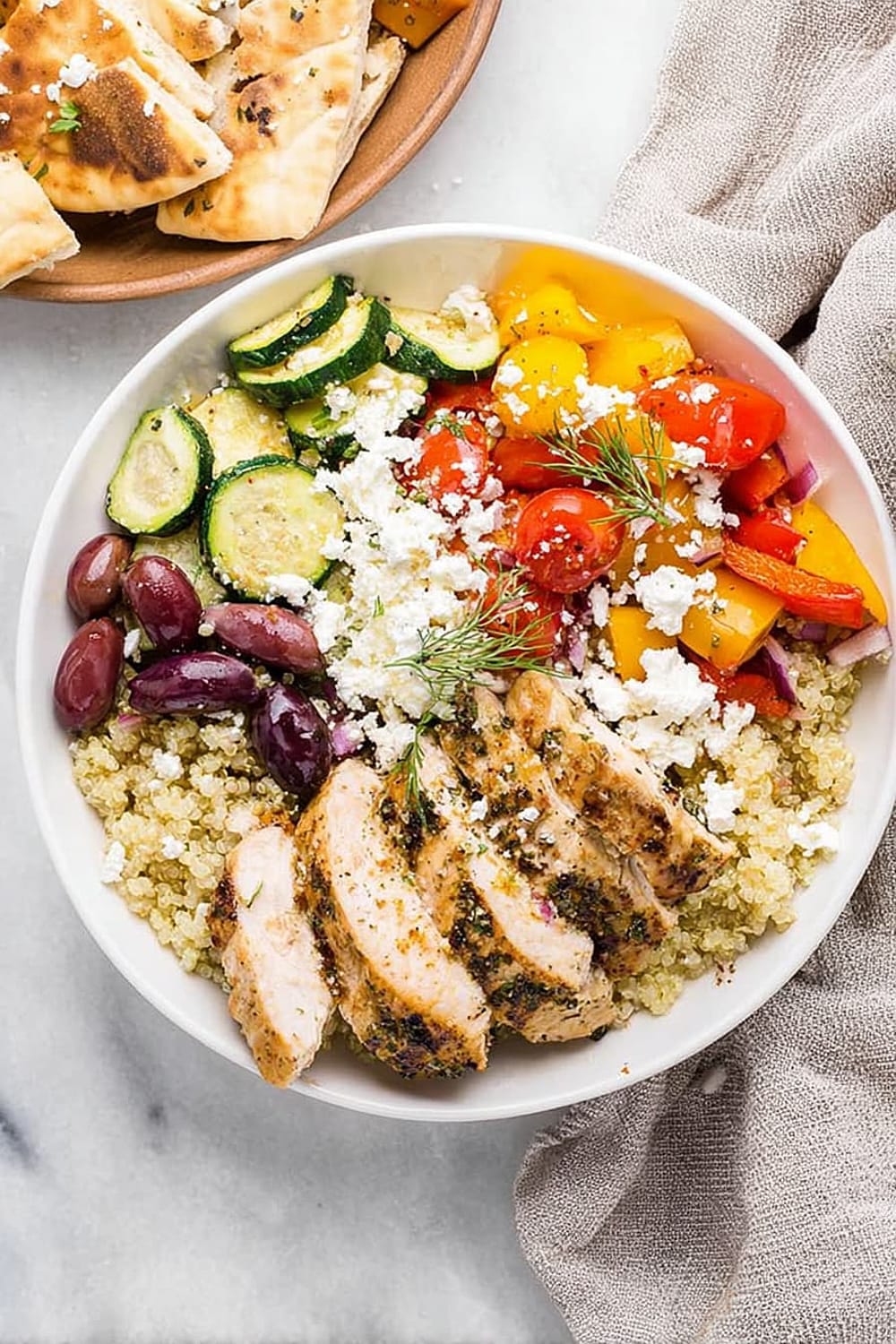 The chicken breast provides all nine essential amino acids, supporting muscle maintenance and satiety. Quinoa is a complete protein grain rich in magnesium, iron, and folate, making this bowl particularly nutritious. The colorful bell peppers and tomatoes are loaded with vitamin C and lycopene, powerful antioxidants that support immune function and heart health. Kalamata olives contribute monounsaturated fats and vitamin E, while feta cheese adds calcium and probiotics for bone and digestive health.