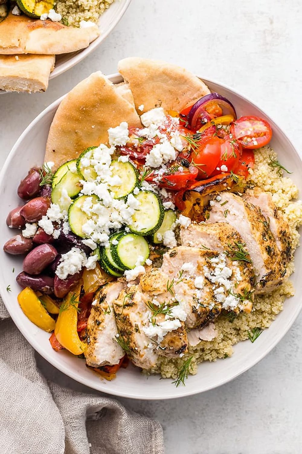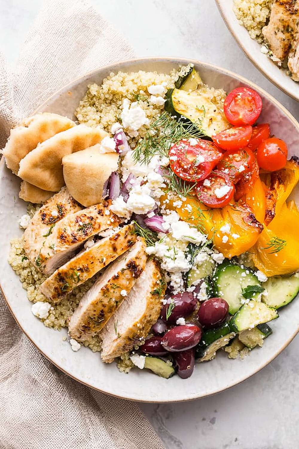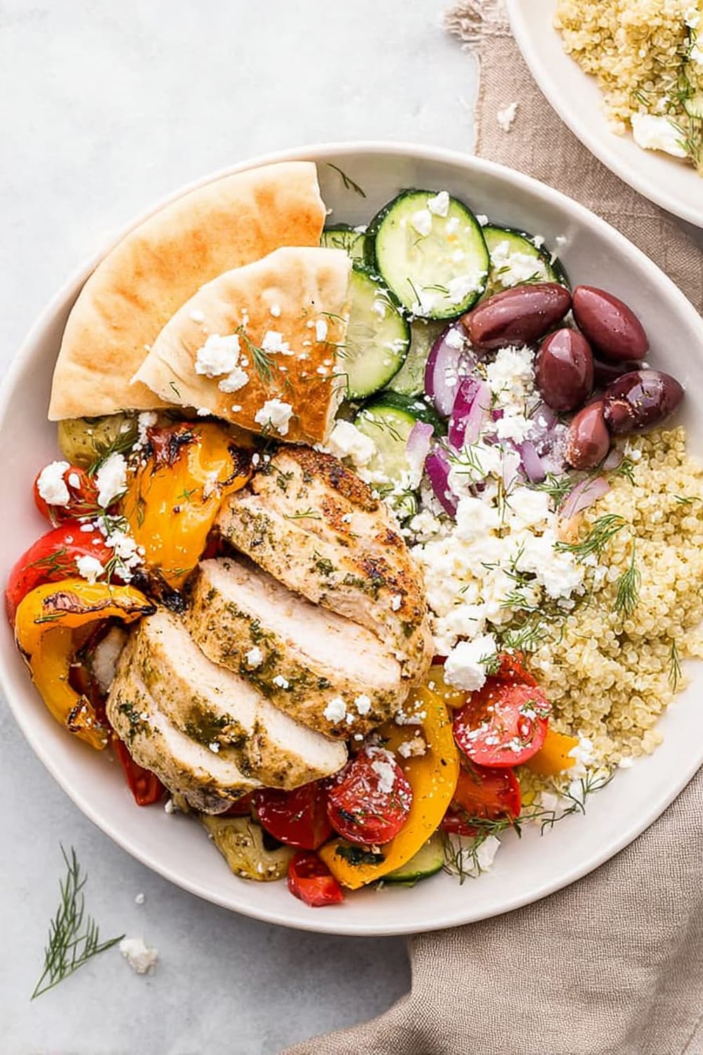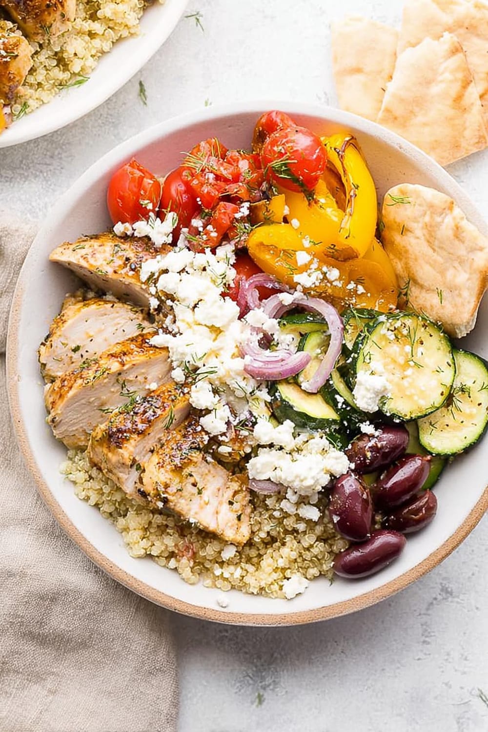 The chicken breast provides all nine essential amino acids, supporting muscle maintenance and satiety. Quinoa is a complete protein grain rich in magnesium, iron, and folate, making this bowl particularly nutritious. The colorful bell peppers and tomatoes are loaded with vitamin C and lycopene, powerful antioxidants that support immune function and heart health. Kalamata olives contribute monounsaturated fats and vitamin E, while feta cheese adds calcium and probiotics for bone and digestive health.