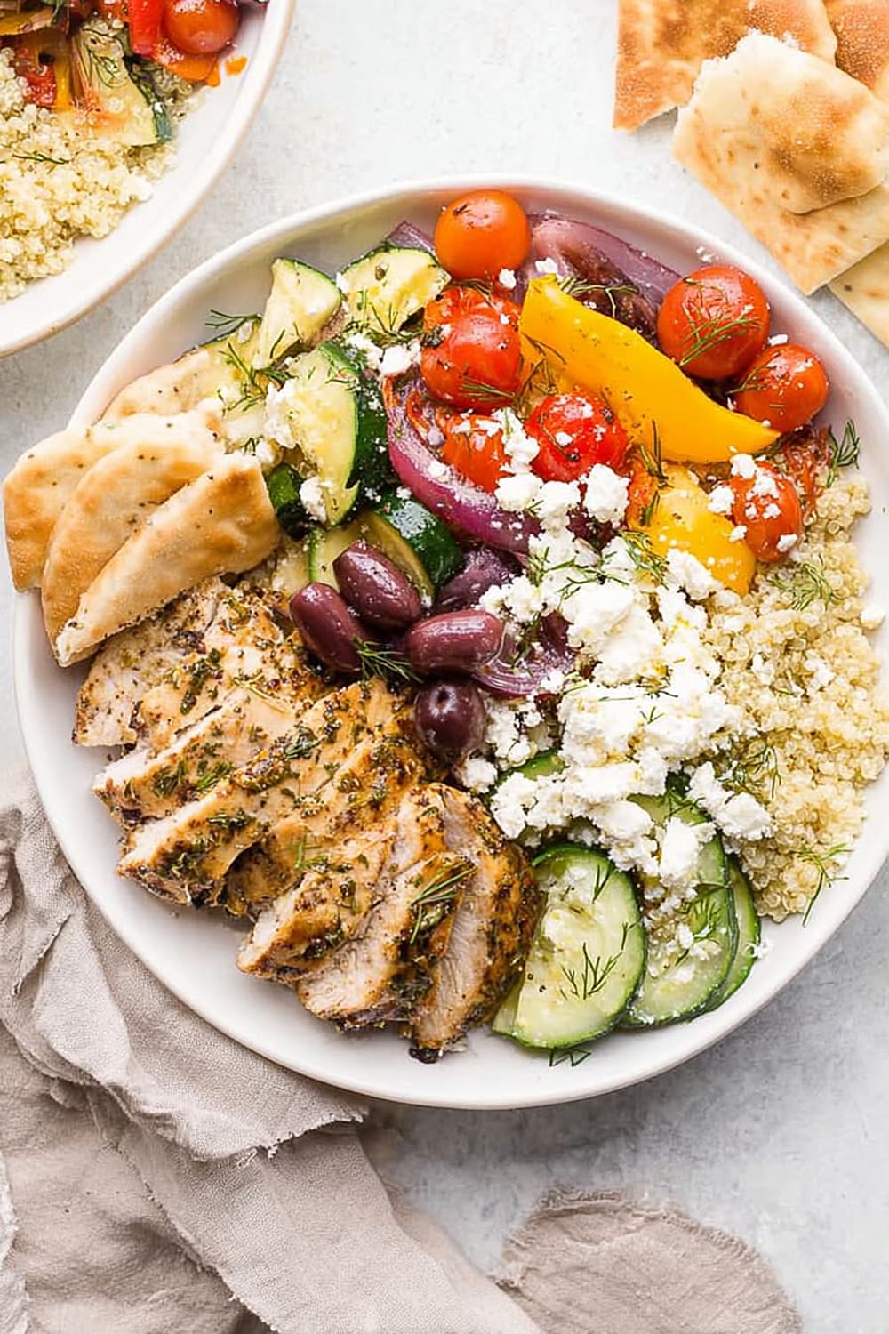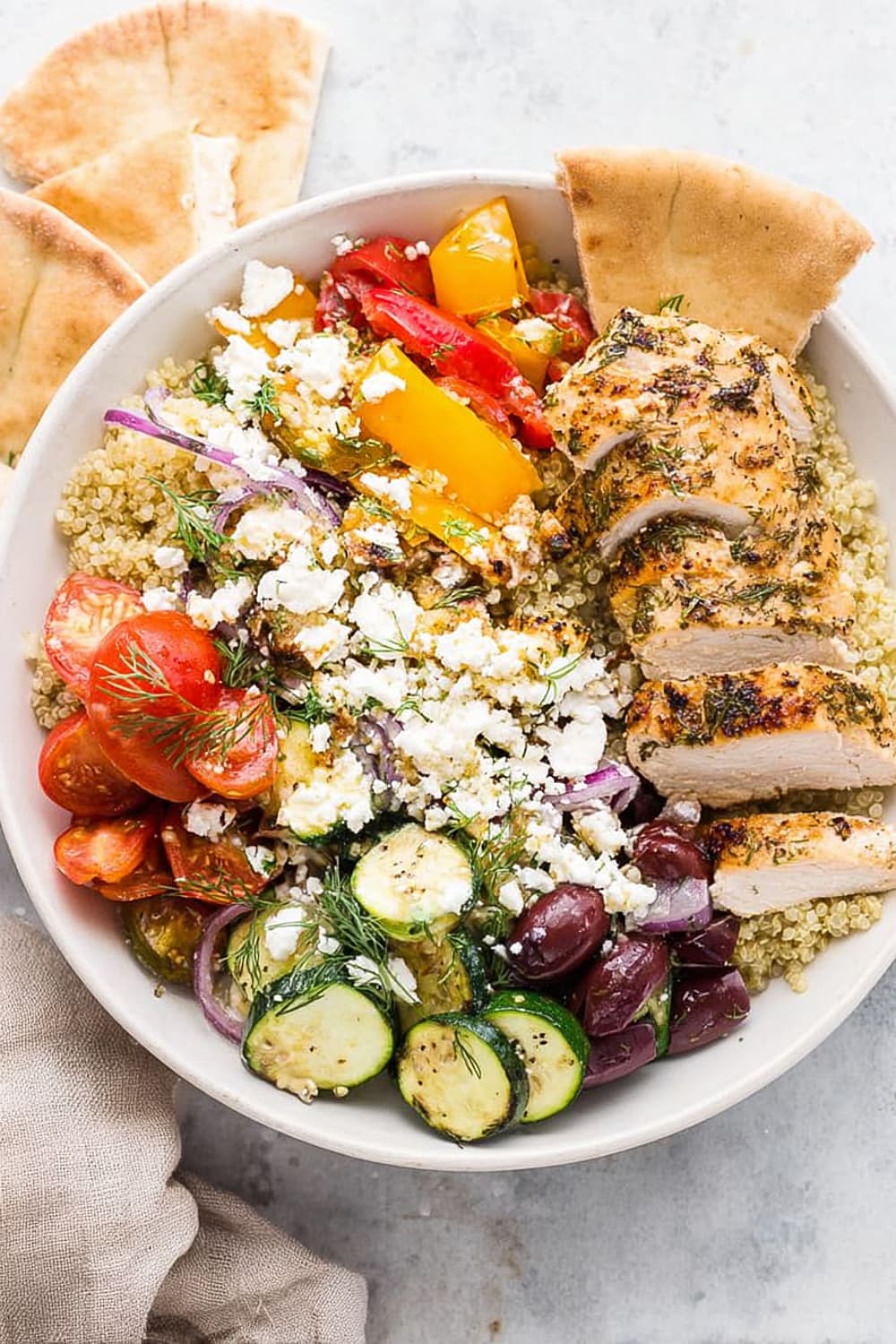 Picture tender, marinated chicken with that perfect char-kissed flavor sitting on a bed of fluffy quinoa, surrounded by roasted vegetables that smell like they came straight from a Greek taverna.