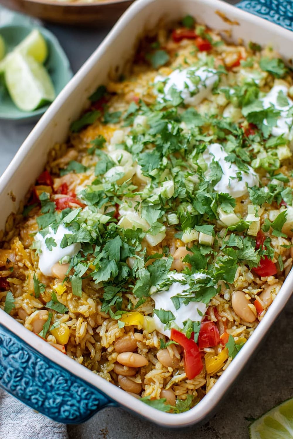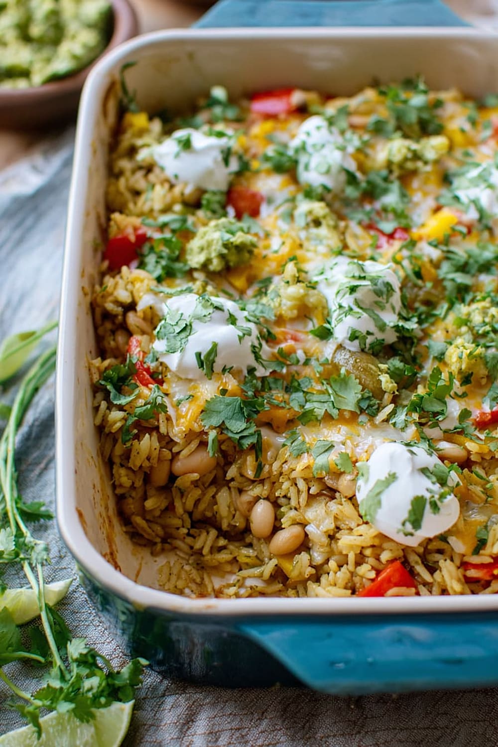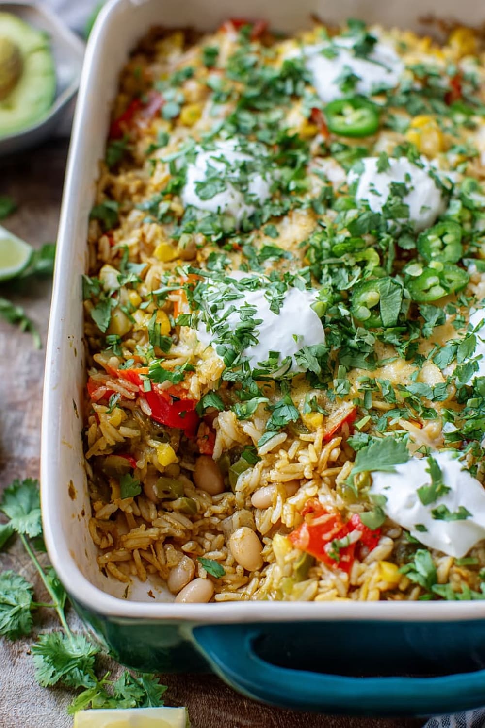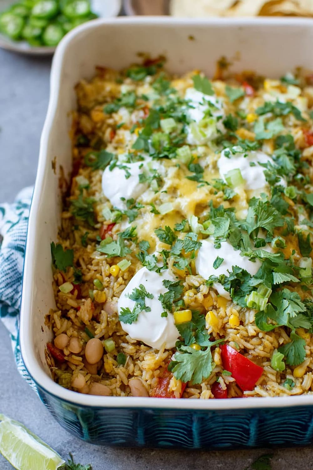 Start with black bean and corn salsa as an appetizer, serve the rice bake as the main course, and finish with key lime sorbet or tres leches cake for dessert. For casual entertaining, set up a DIY taco bar using the rice bake as filling, alongside refried beans, Mexican rice, and fresh salsas.