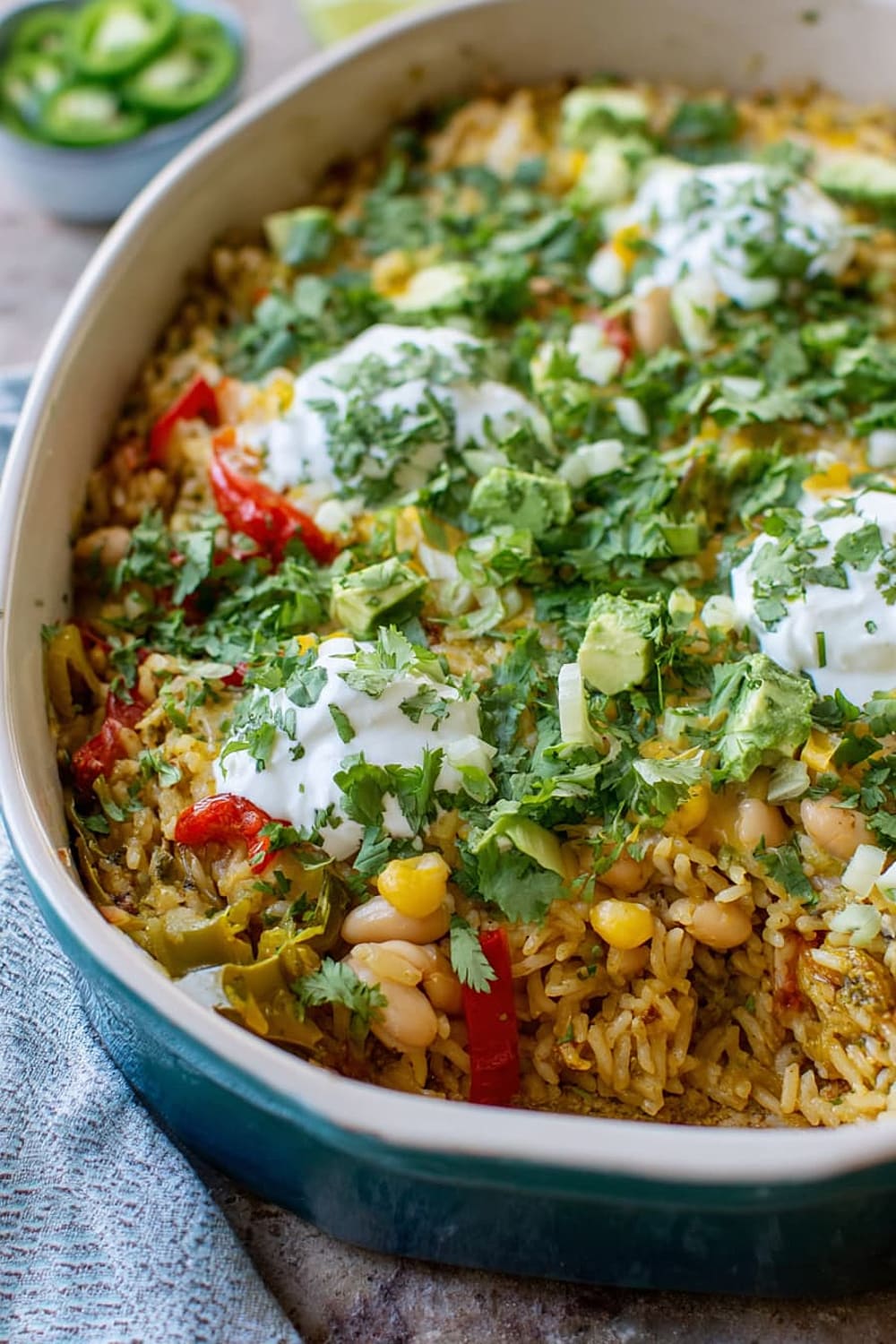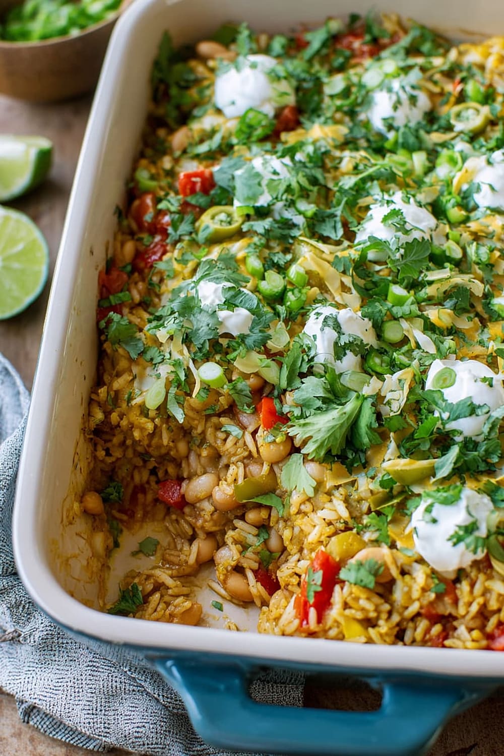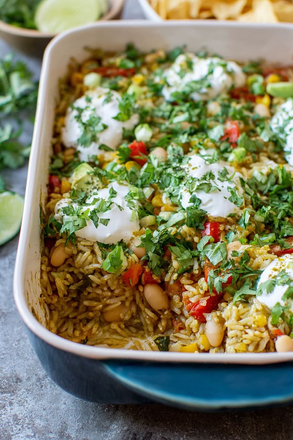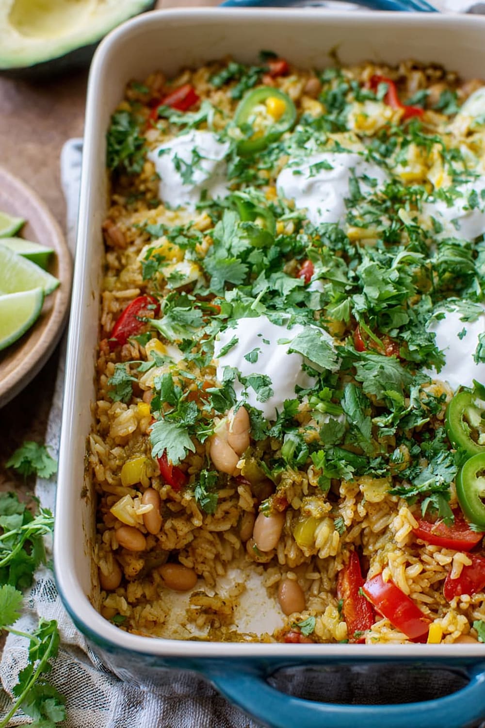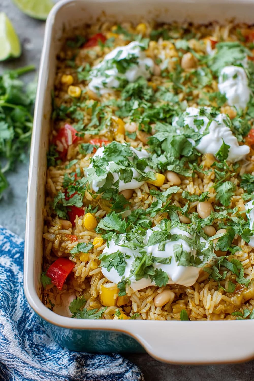 Start with black bean and corn salsa as an appetizer, serve the rice bake as the main course, and finish with key lime sorbet or tres leches cake for dessert. For casual entertaining, set up a DIY taco bar using the rice bake as filling, alongside refried beans, Mexican rice, and fresh salsas.