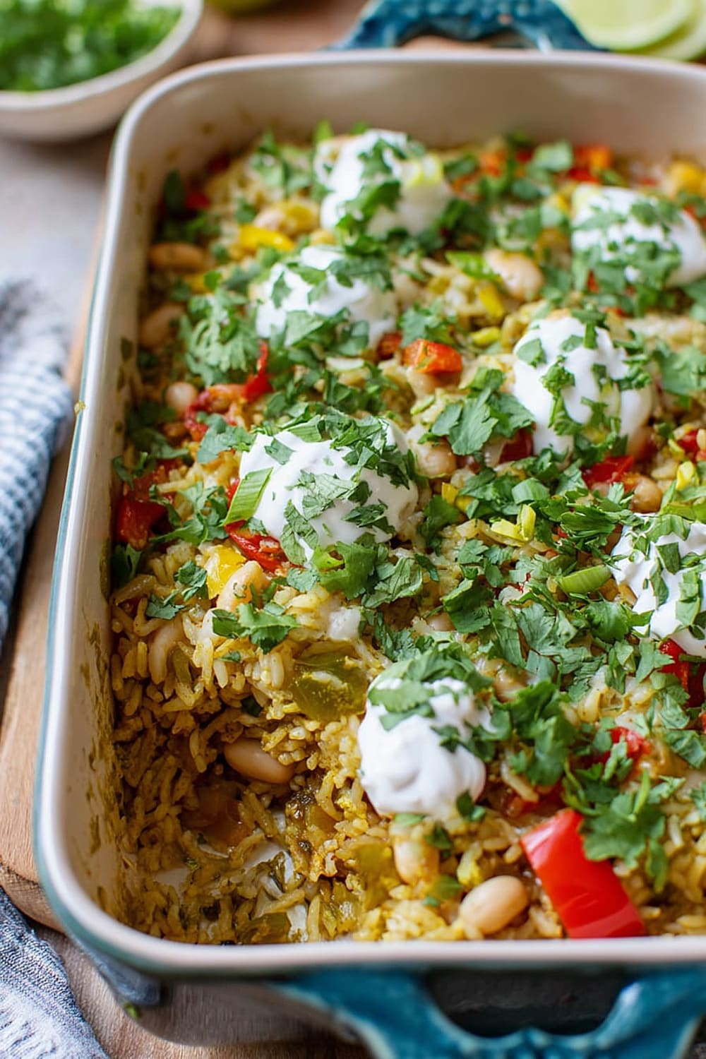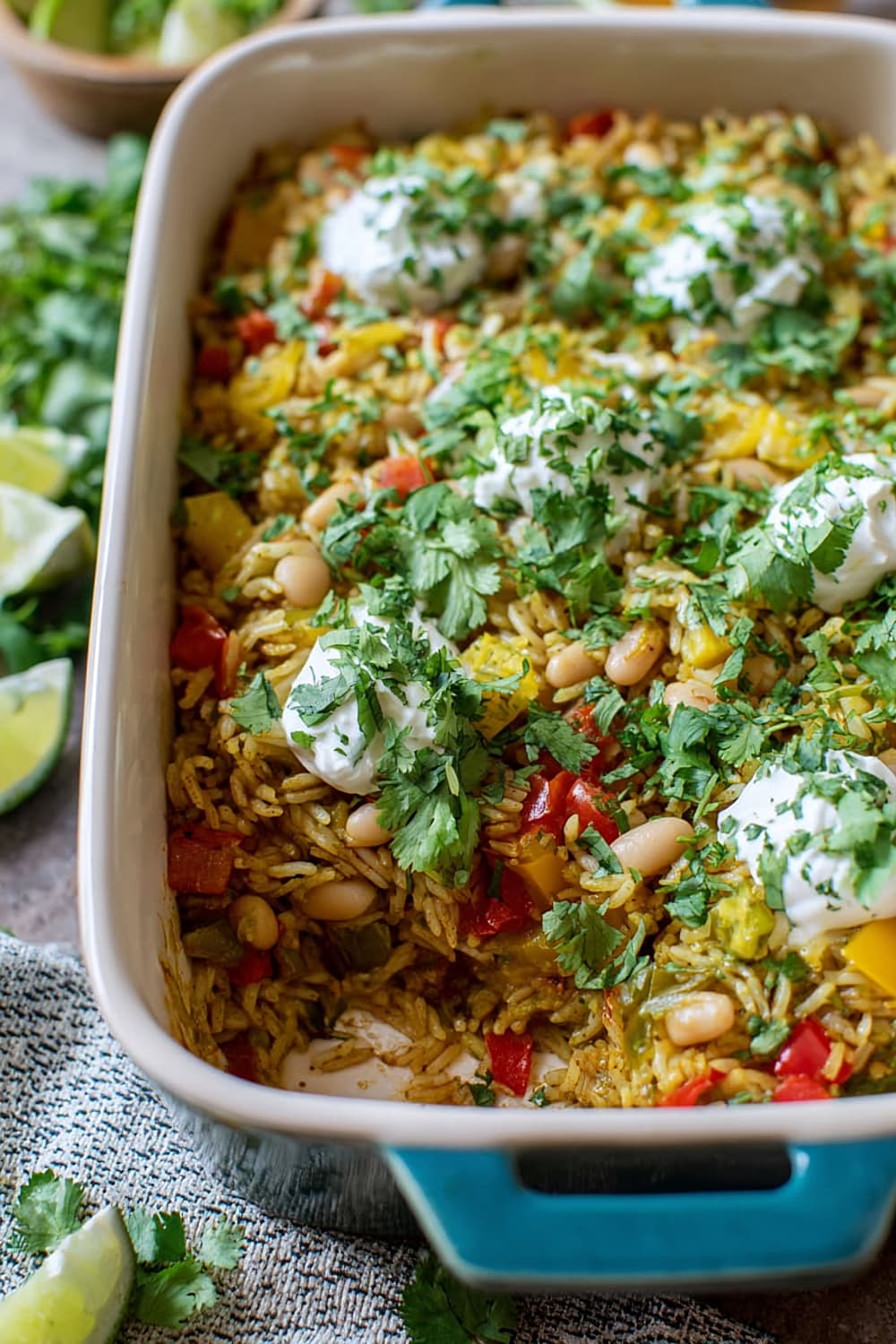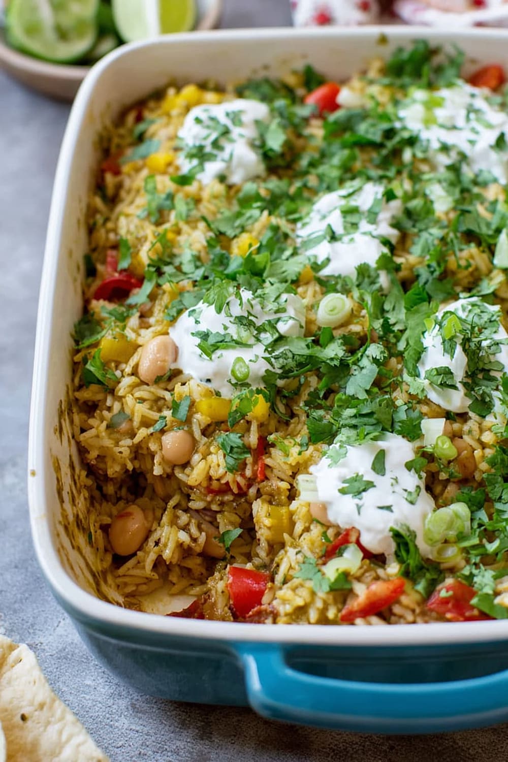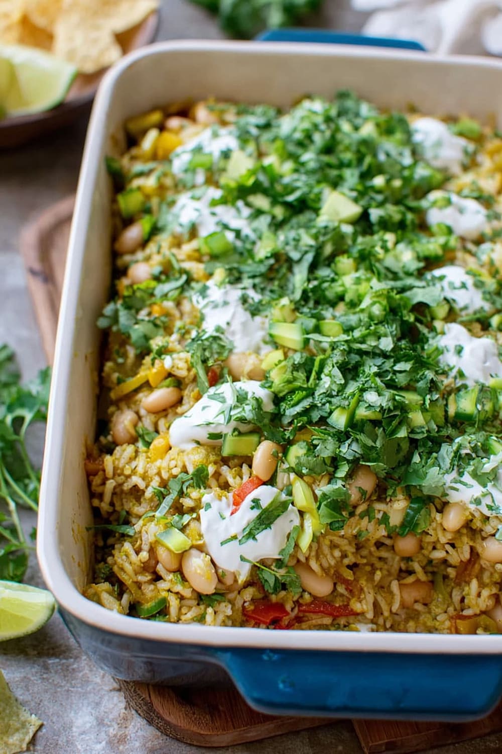 Start with black bean and corn salsa as an appetizer, serve the rice bake as the main course, and finish with key lime sorbet or tres leches cake for dessert. For casual entertaining, set up a DIY taco bar using the rice bake as filling, alongside refried beans, Mexican rice, and fresh salsas.