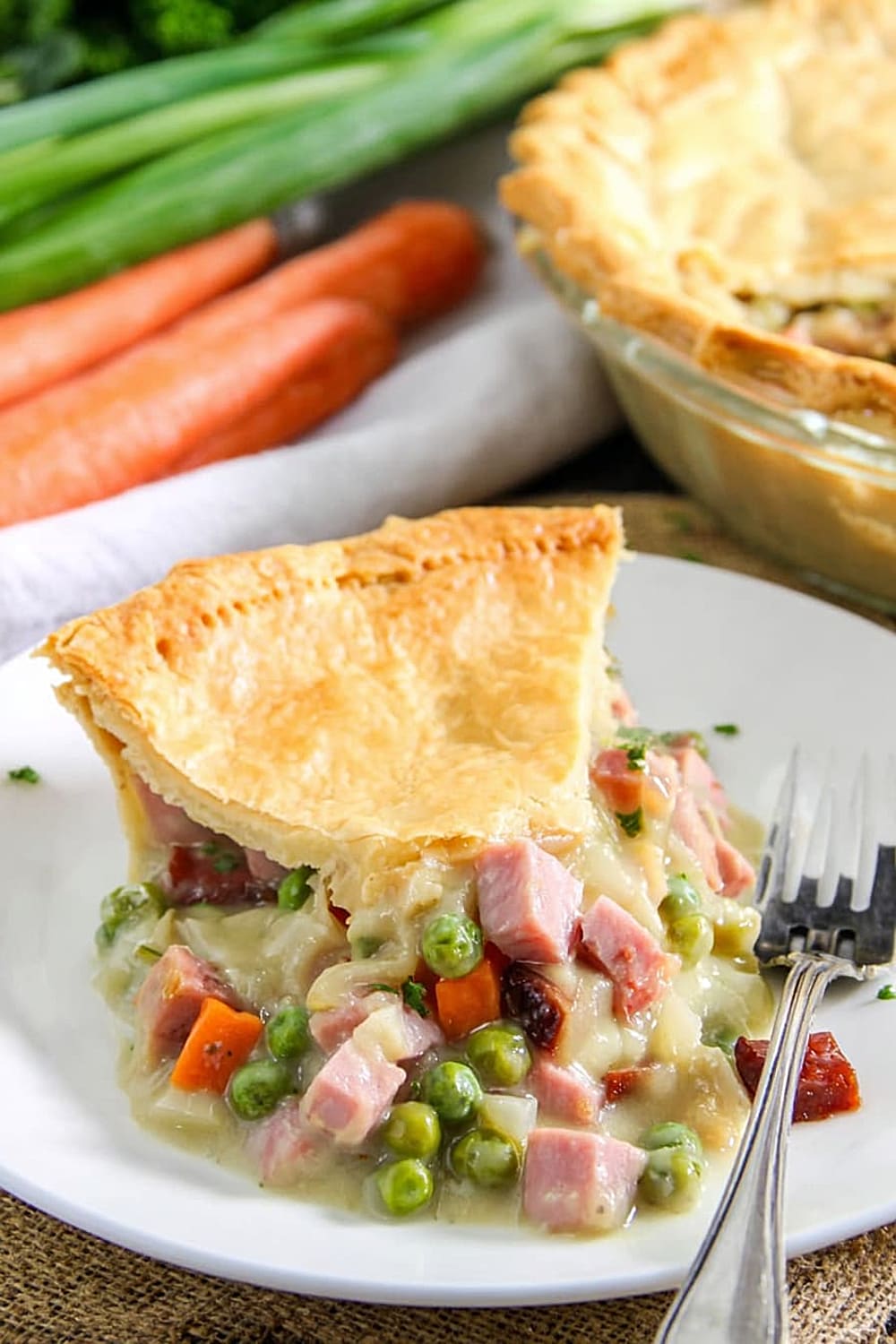 - 6 Roll out one pie crust on a lightly floured surface and carefully place it in the bottom of your 9-inch pie dish, pressing gently to fit without stretching. Pour the ham and vegetable filling into the crust, spreading it evenly to ensure consistent baking.