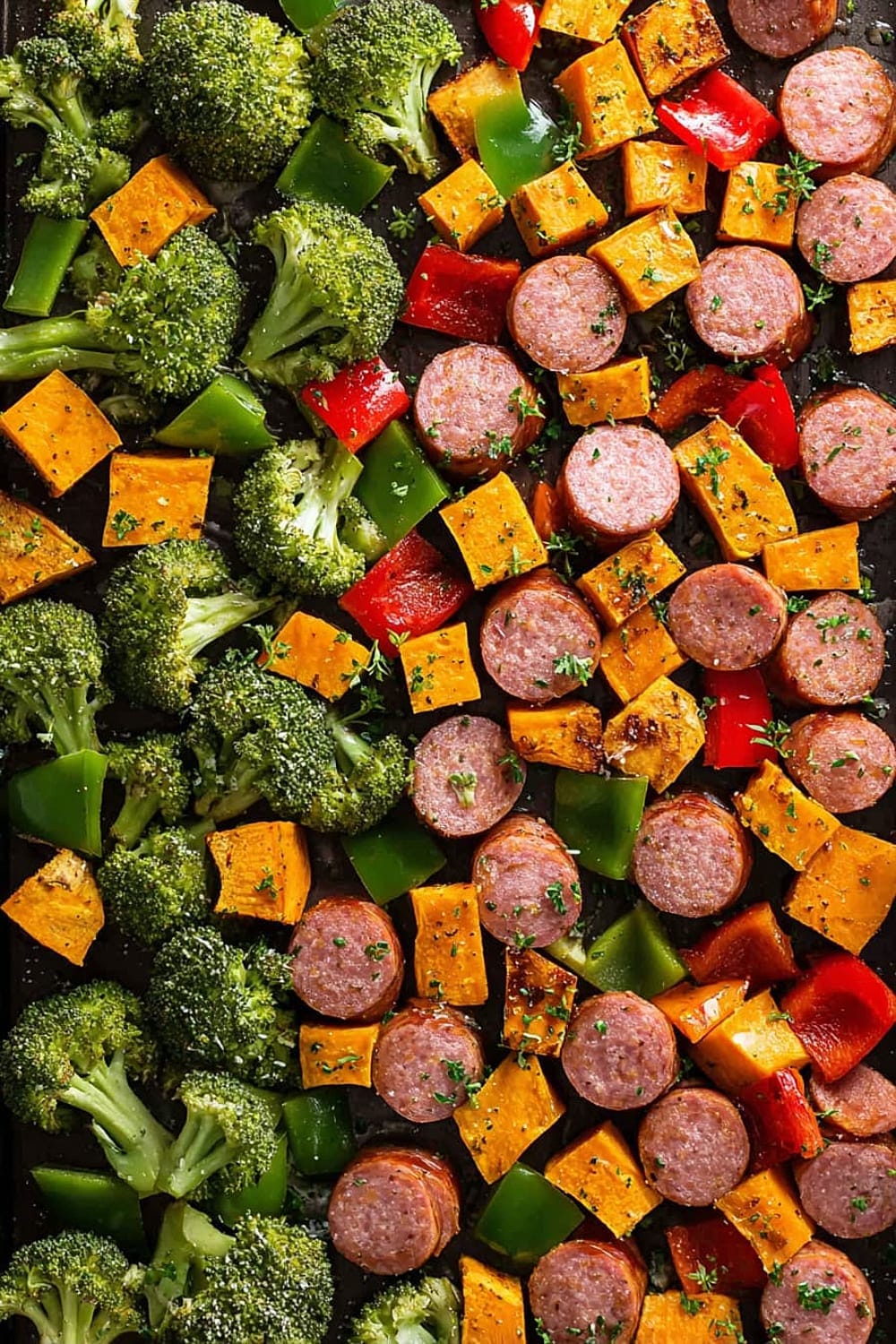 - 4 Add the sliced sausage, diced sweet potatoes, broccoli florets, chopped bell peppers, and minced garlic to your prepared sheet pan.