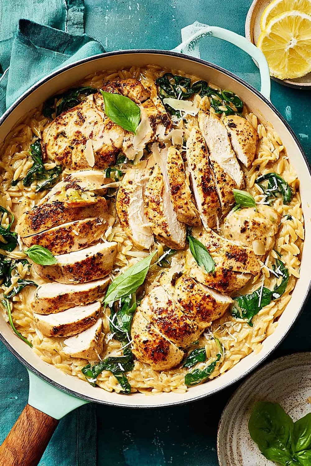 - 7 Slice the rested chicken cutlets into strips and arrange them on top of the orzo mixture in a single layer. Cover the skillet and let stand until the chicken is warmed through, about 3 minutes. Garnish with additional lemon zest and torn fresh basil leaves if desired before serving immediately.