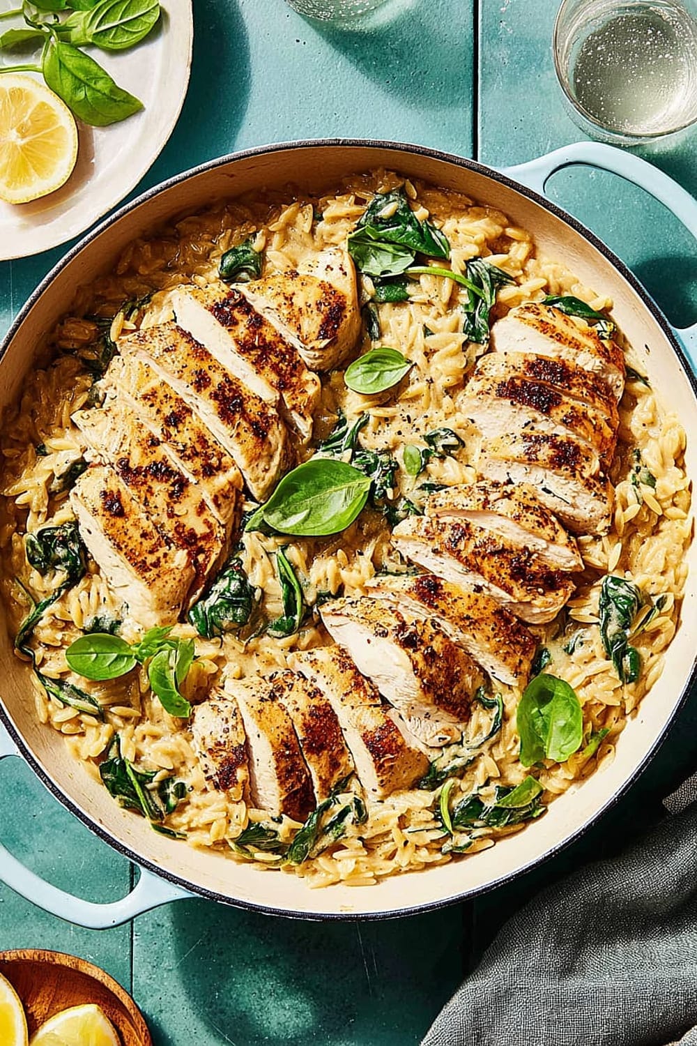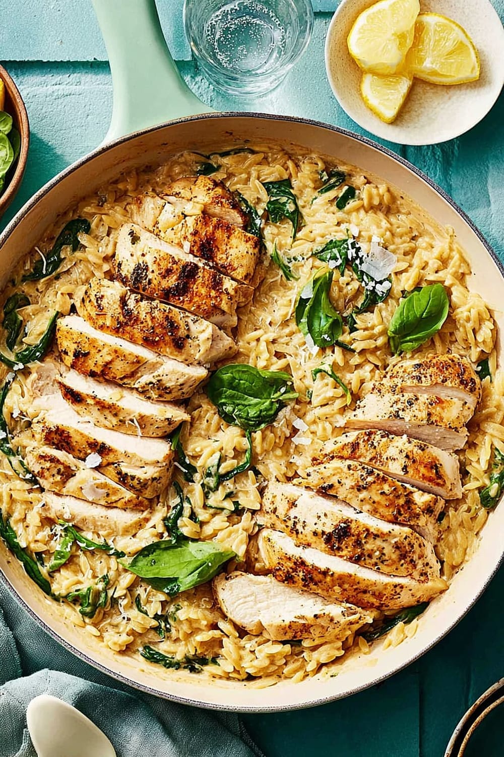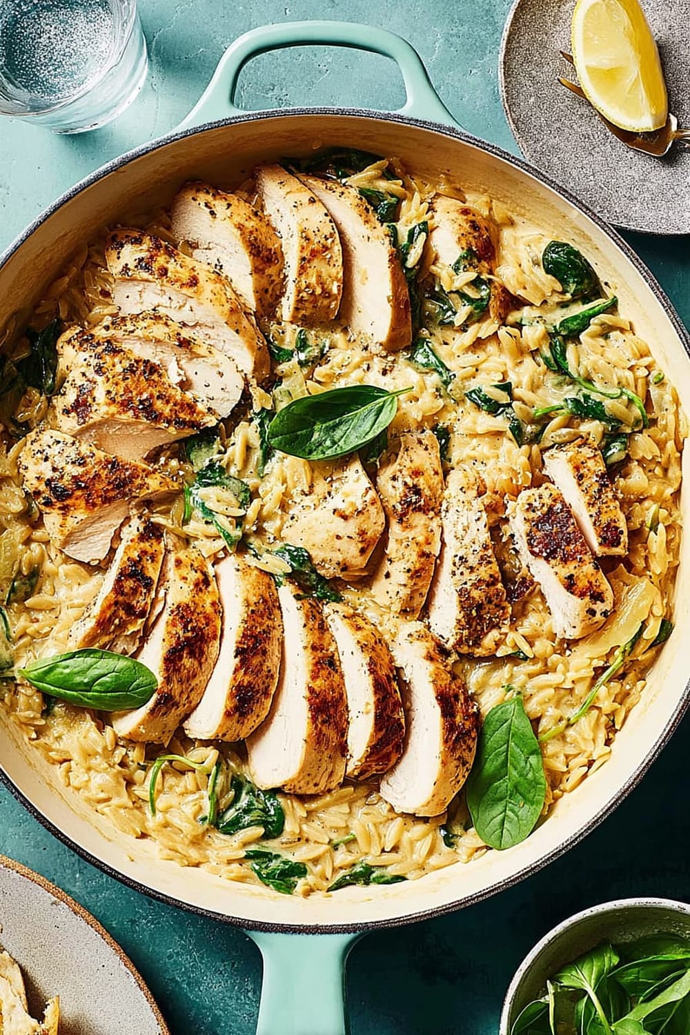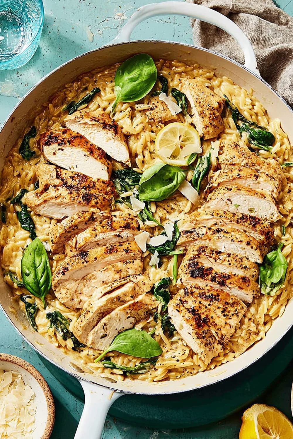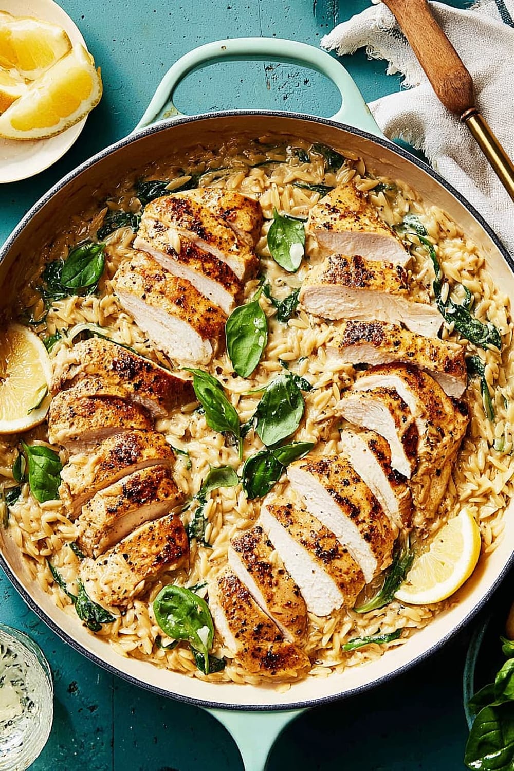 Picture tender chicken cutlets nestled over creamy, lemony orzo that’s been cooked to perfection in aromatic chicken broth, with fresh spinach wilting into every bite.