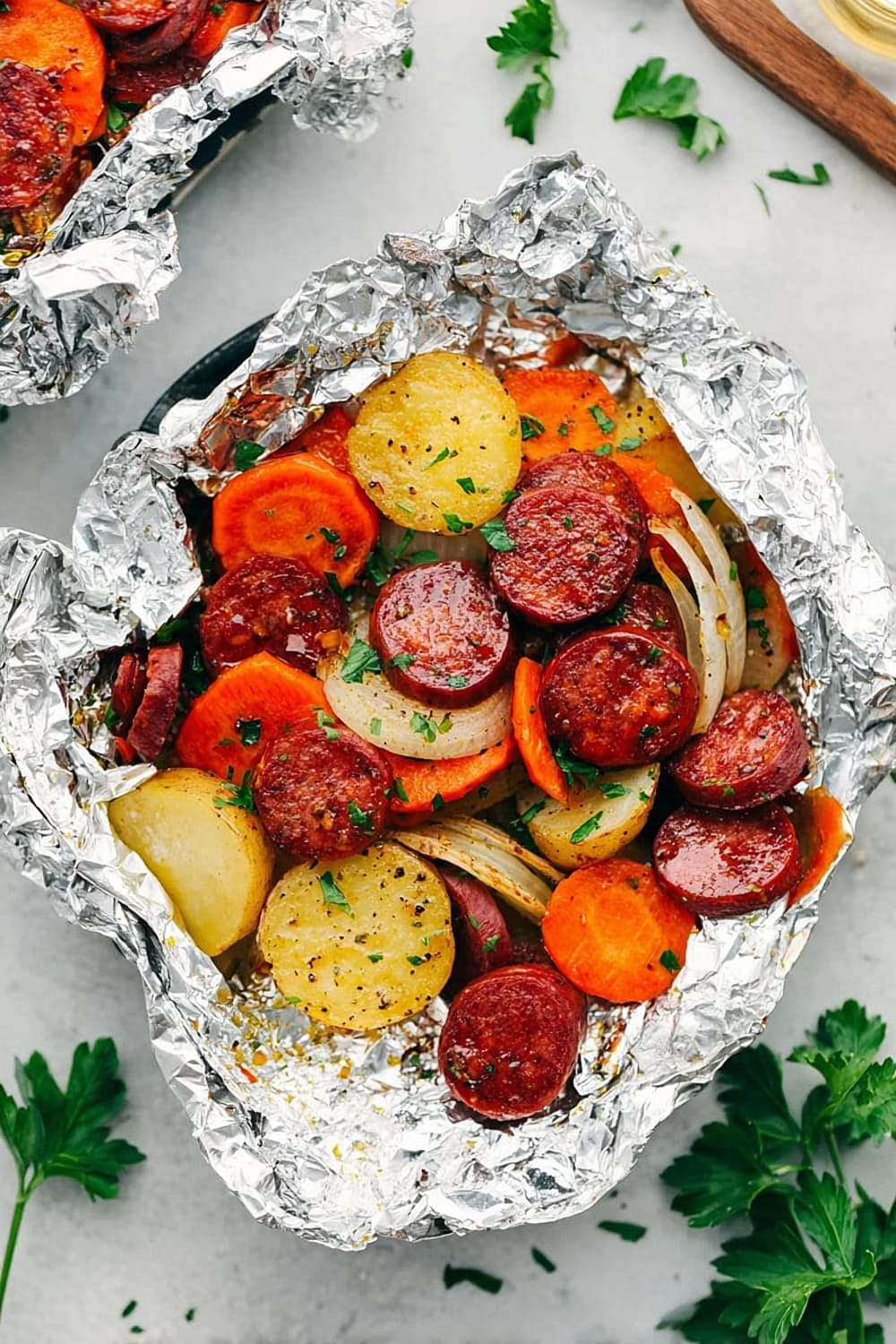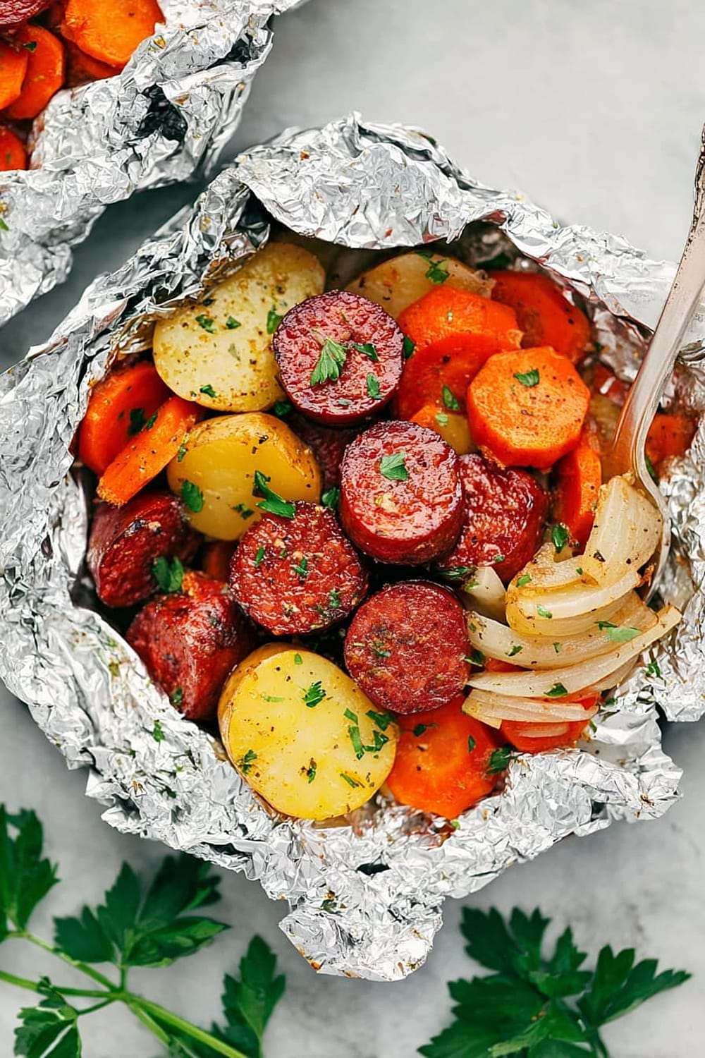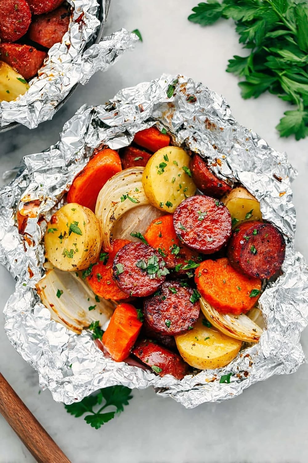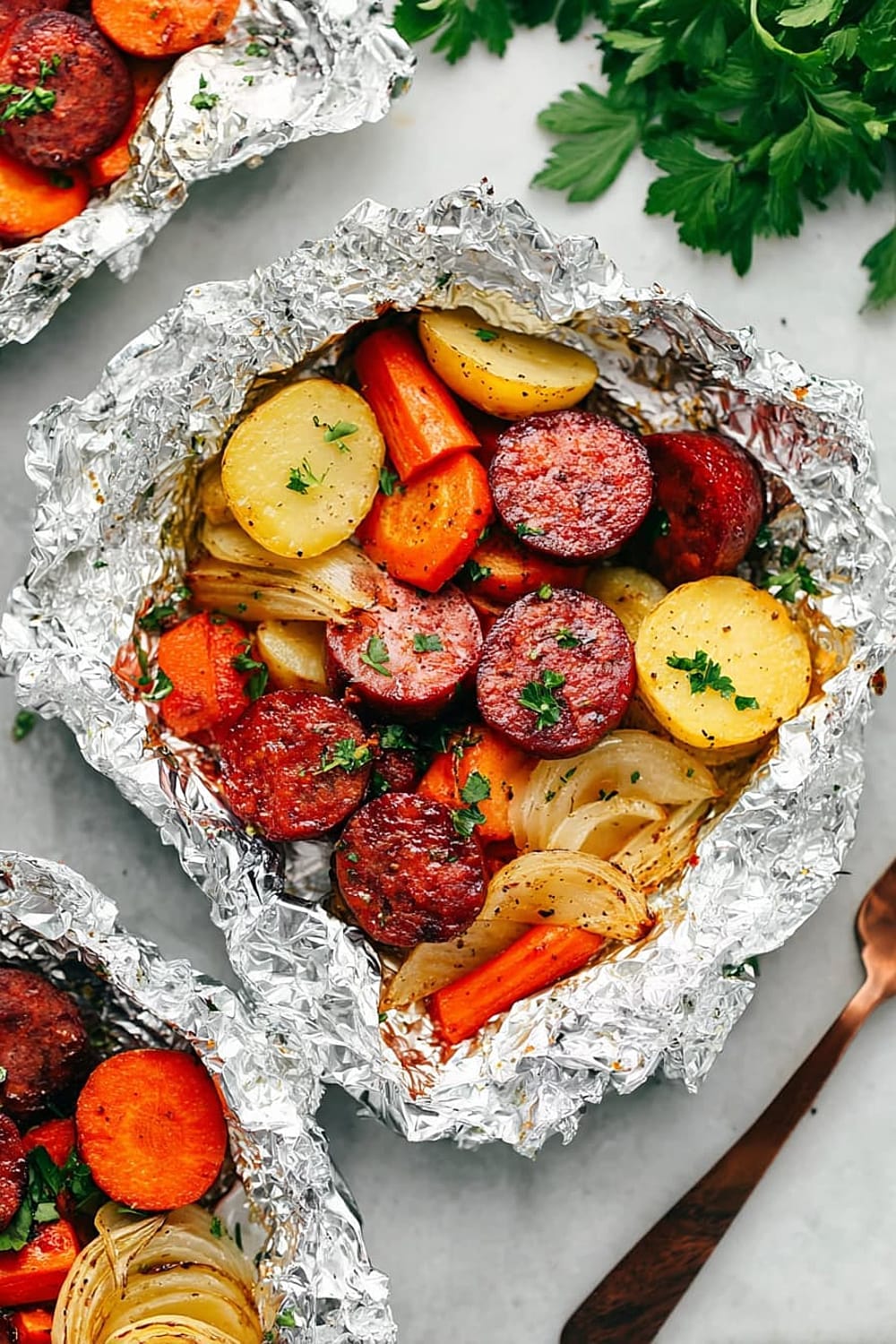 Picture this: tender potatoes, smoky sausage, and perfectly seasoned vegetables all steaming together in their own little aluminum cocoon, creating the most satisfying one-packet meal you’ve ever experienced.