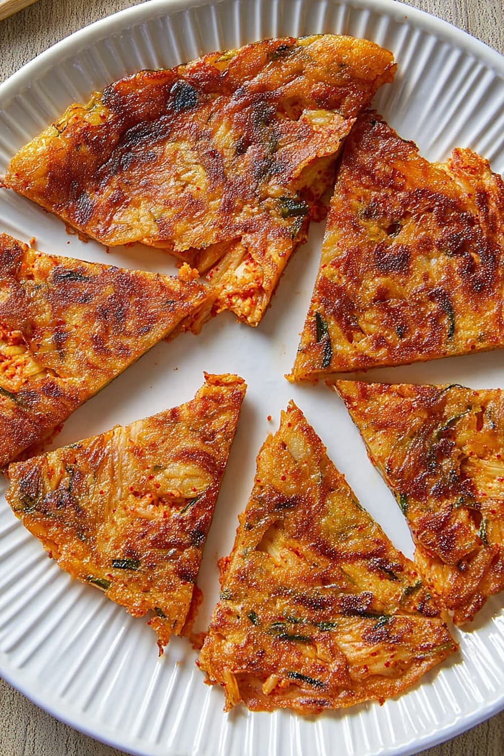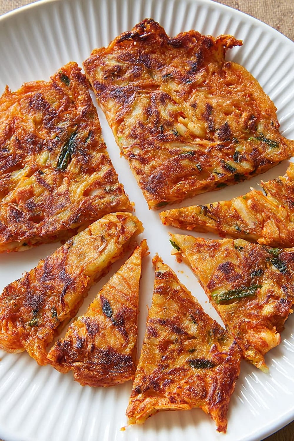 The key to restaurant-quality kimchi pancakes is maintaining proper oil temperature – too hot and the outside burns before the inside cooks; too cool and they absorb excess oil and become greasy. Test with a small drop of batter first – it should sizzle immediately but not violently. Rest the batter for 5-10 minutes after mixing to allow the starches to fully hydrate, creating better texture. Don’t press down on the pancakes while cooking – let them develop their natural crispy crust undisturbed.