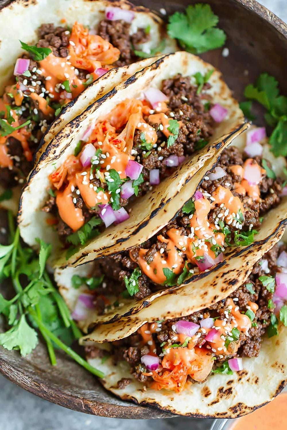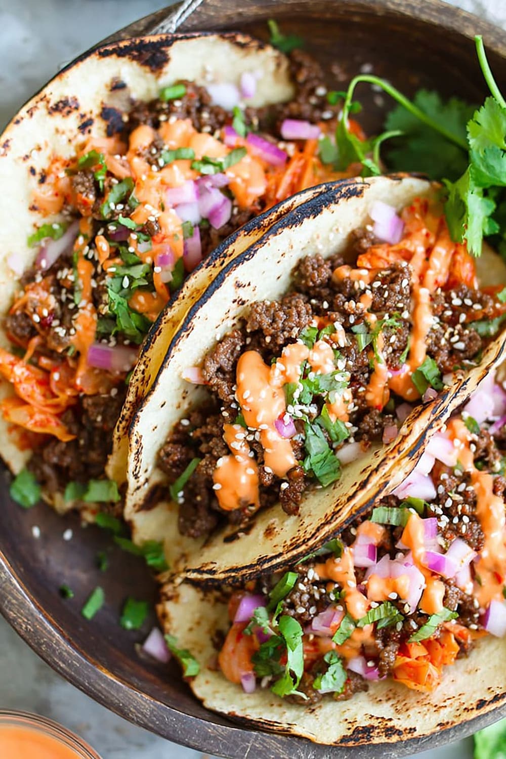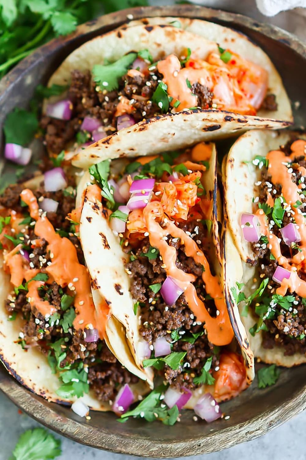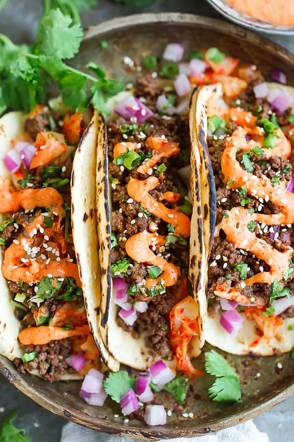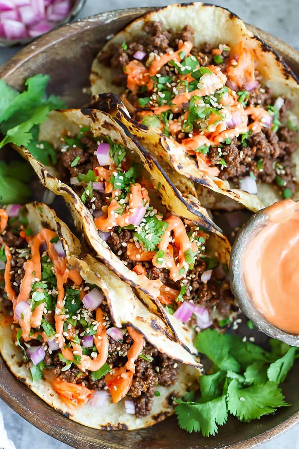- 10 Serve the ground beef mixture in the warmed tortillas, topped with the caramelized kimchi, ¼ cup diced red onion, 2 tablespoons chopped fresh cilantro leaves, and ¼ teaspoon sesame seeds, then drizzle generously with the Sriracha mayonnaise. Serve immediately while everything is warm.