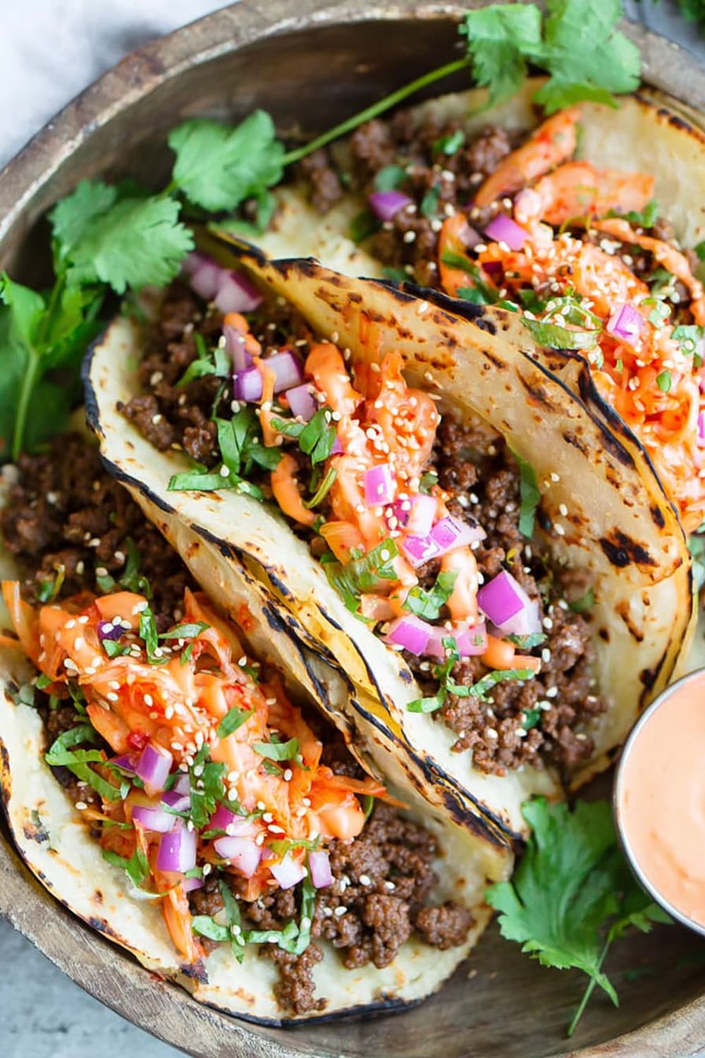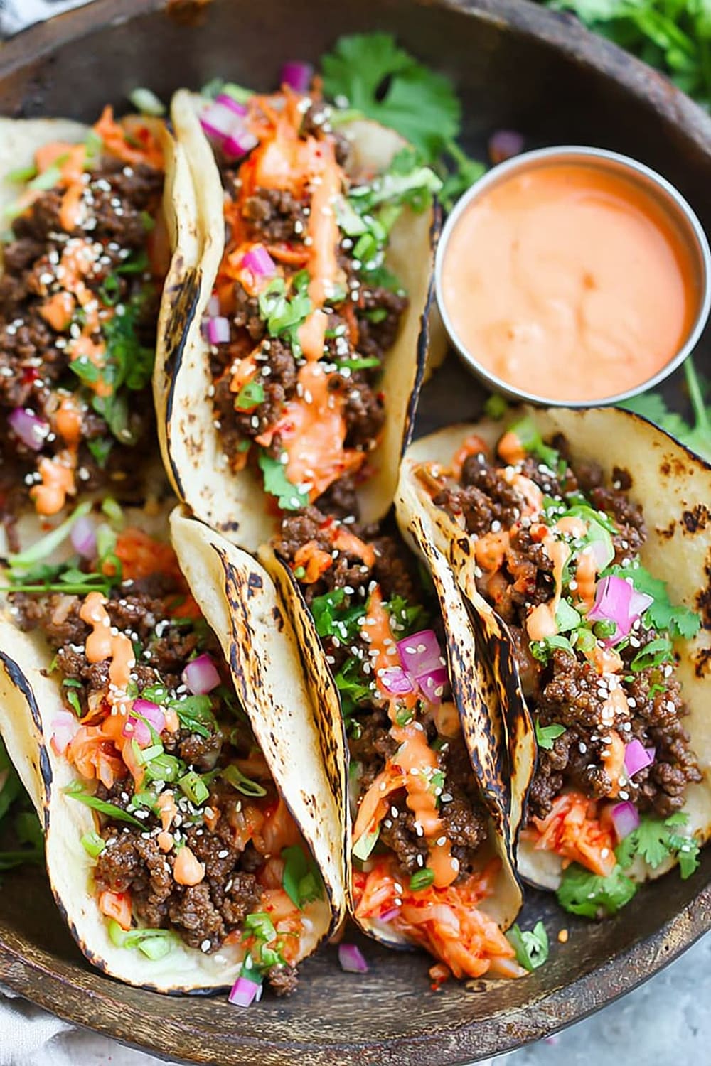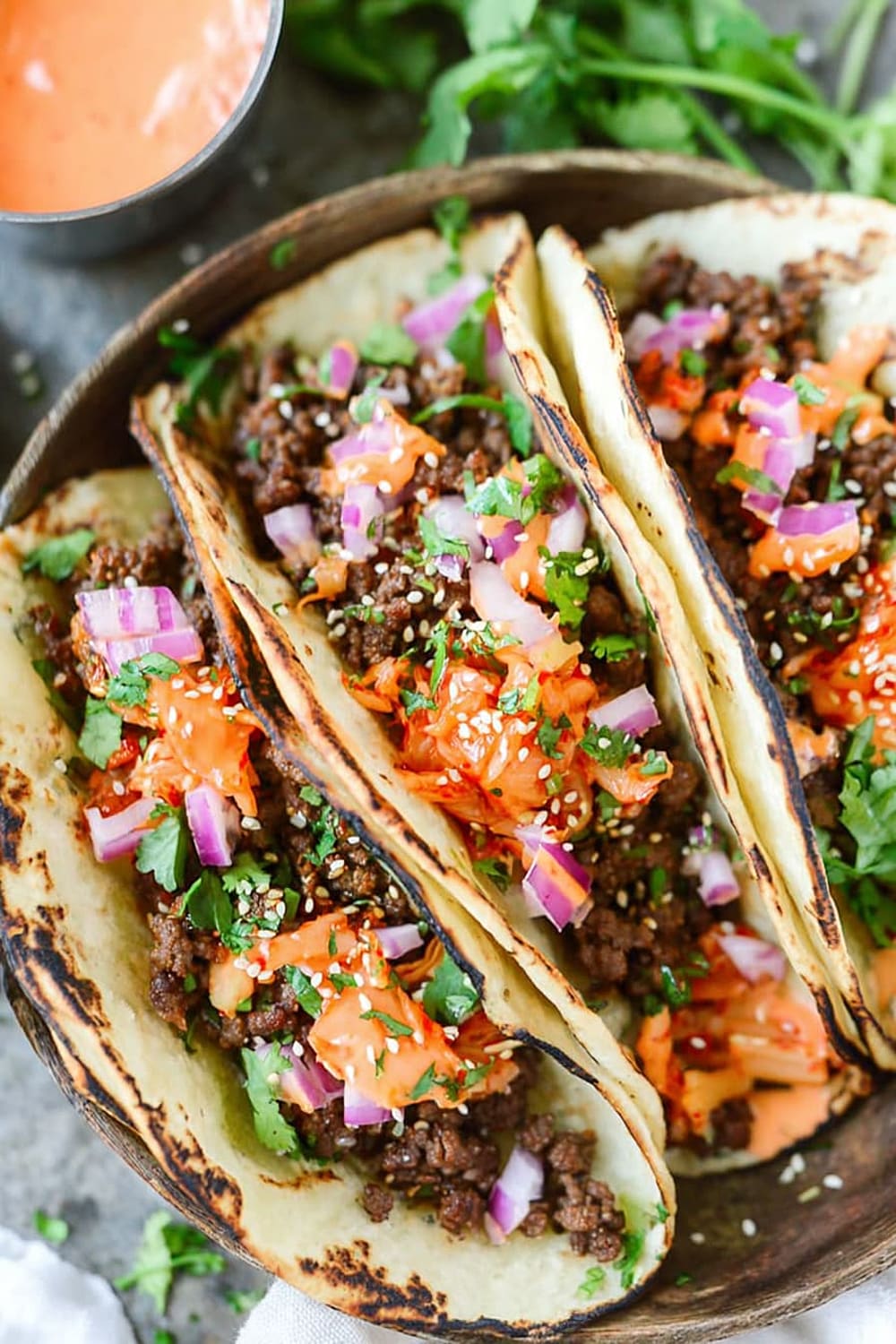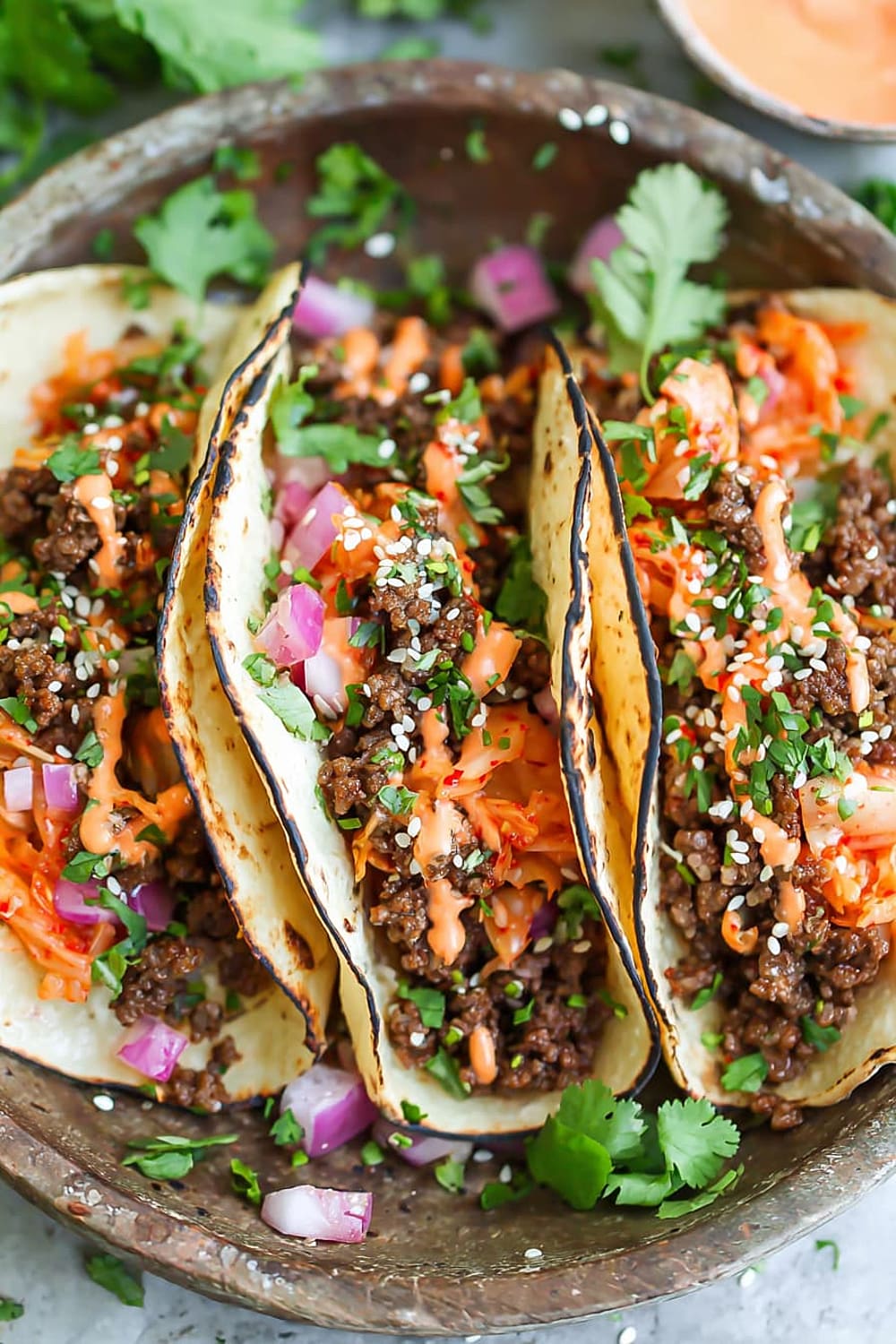 - 10 Serve the ground beef mixture in the warmed tortillas, topped with the caramelized kimchi, ¼ cup diced red onion, 2 tablespoons chopped fresh cilantro leaves, and ¼ teaspoon sesame seeds, then drizzle generously with the Sriracha mayonnaise. Serve immediately while everything is warm.