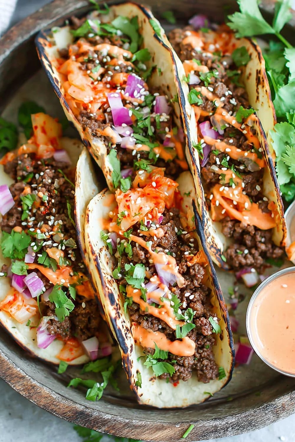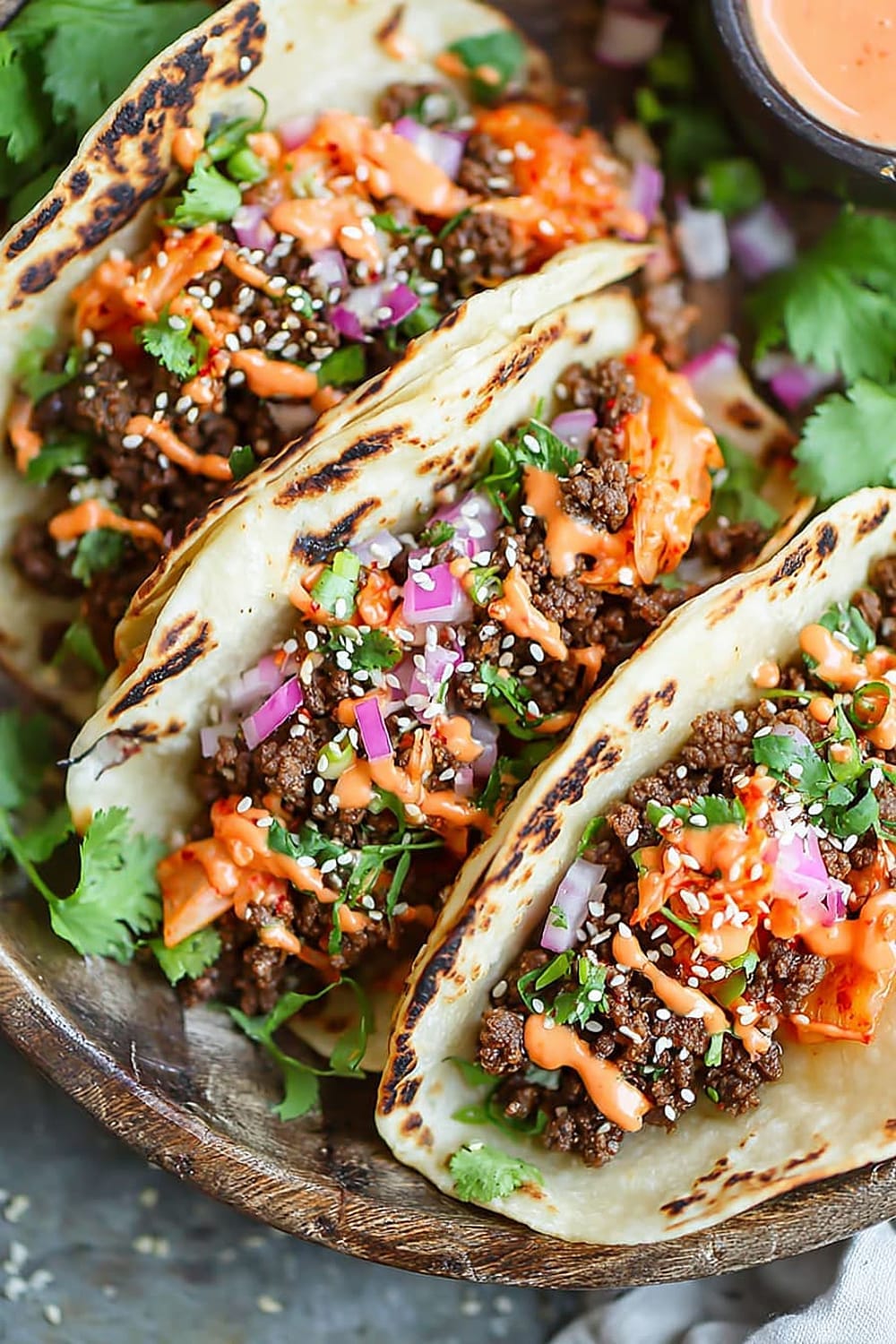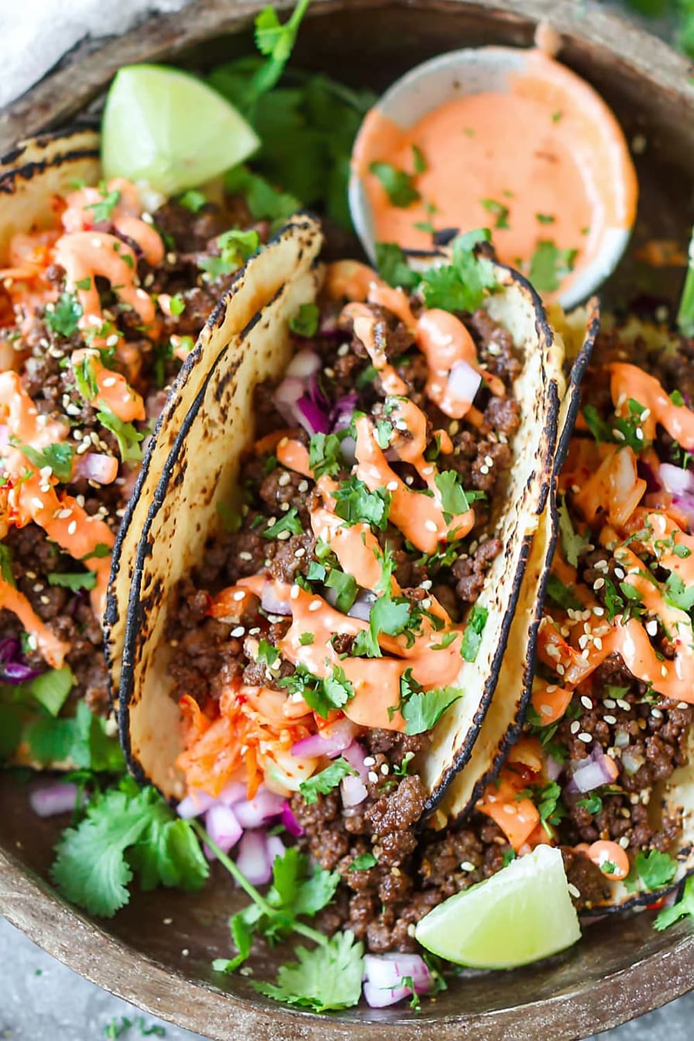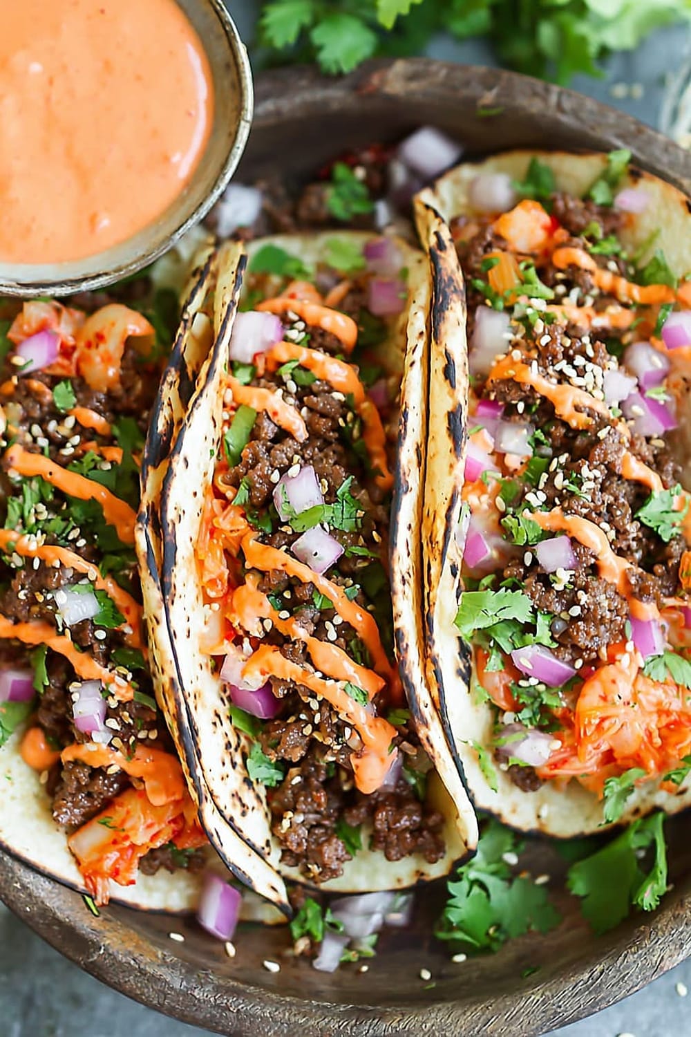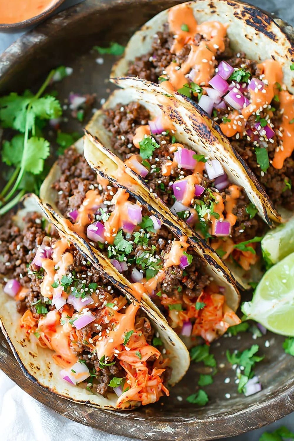 - 10 Serve the ground beef mixture in the warmed tortillas, topped with the caramelized kimchi, ¼ cup diced red onion, 2 tablespoons chopped fresh cilantro leaves, and ¼ teaspoon sesame seeds, then drizzle generously with the Sriracha mayonnaise. Serve immediately while everything is warm.