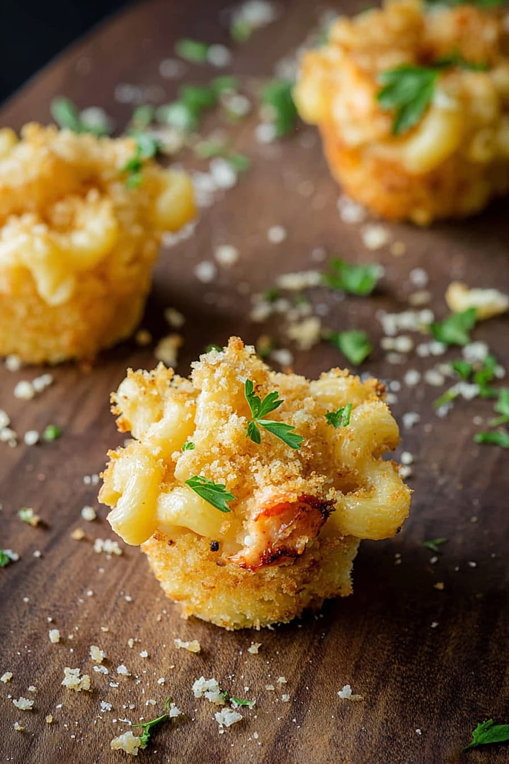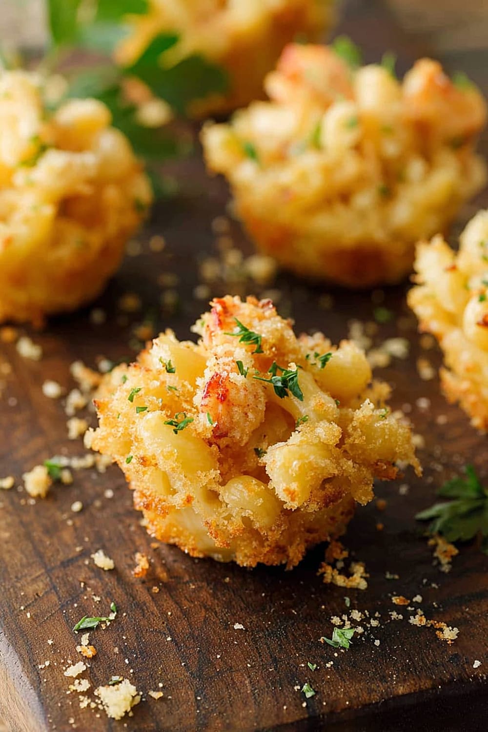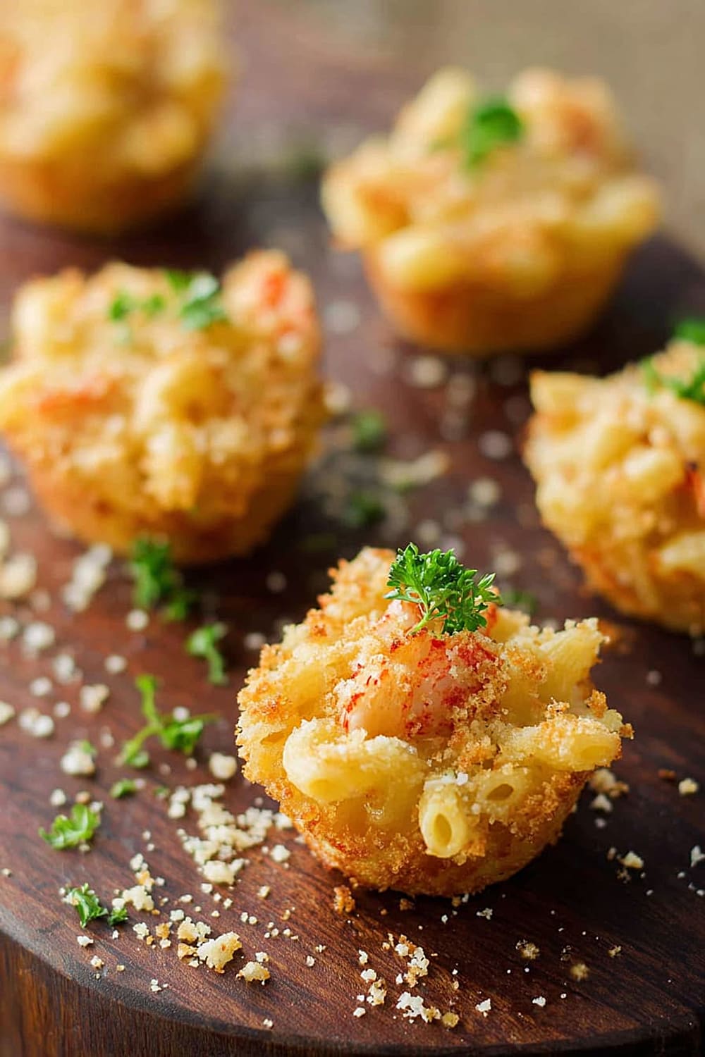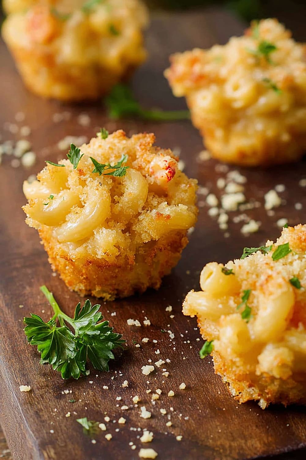 Each bite-sized portion delivers that perfect combination of rich, velvety cheese sauce, perfectly cooked macaroni, and sweet lobster chunks, all topped with a delightfully crispy panko breadcrumb crust.