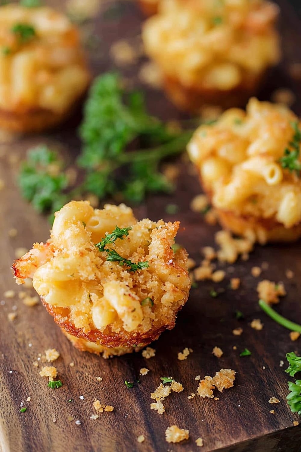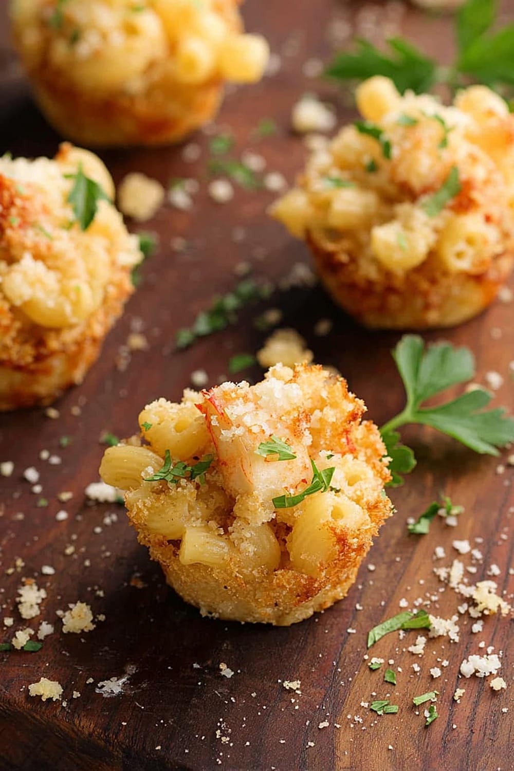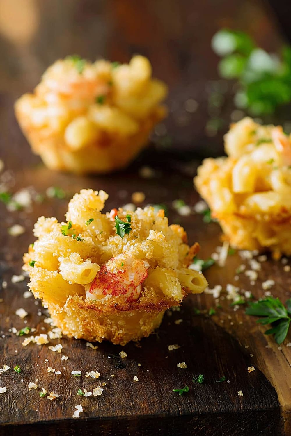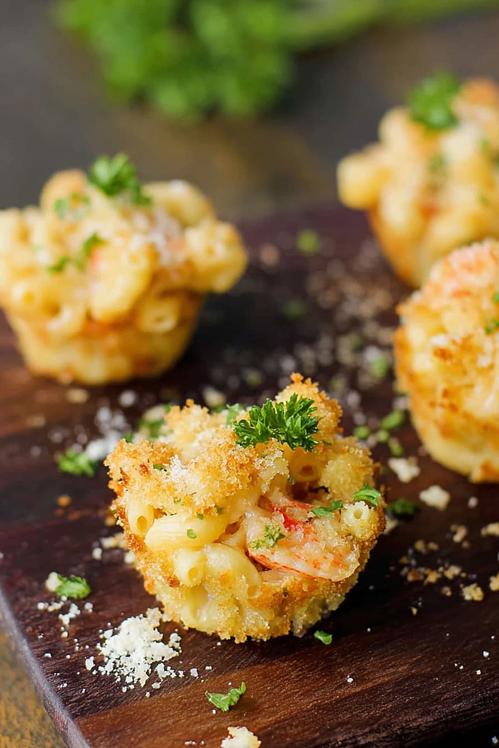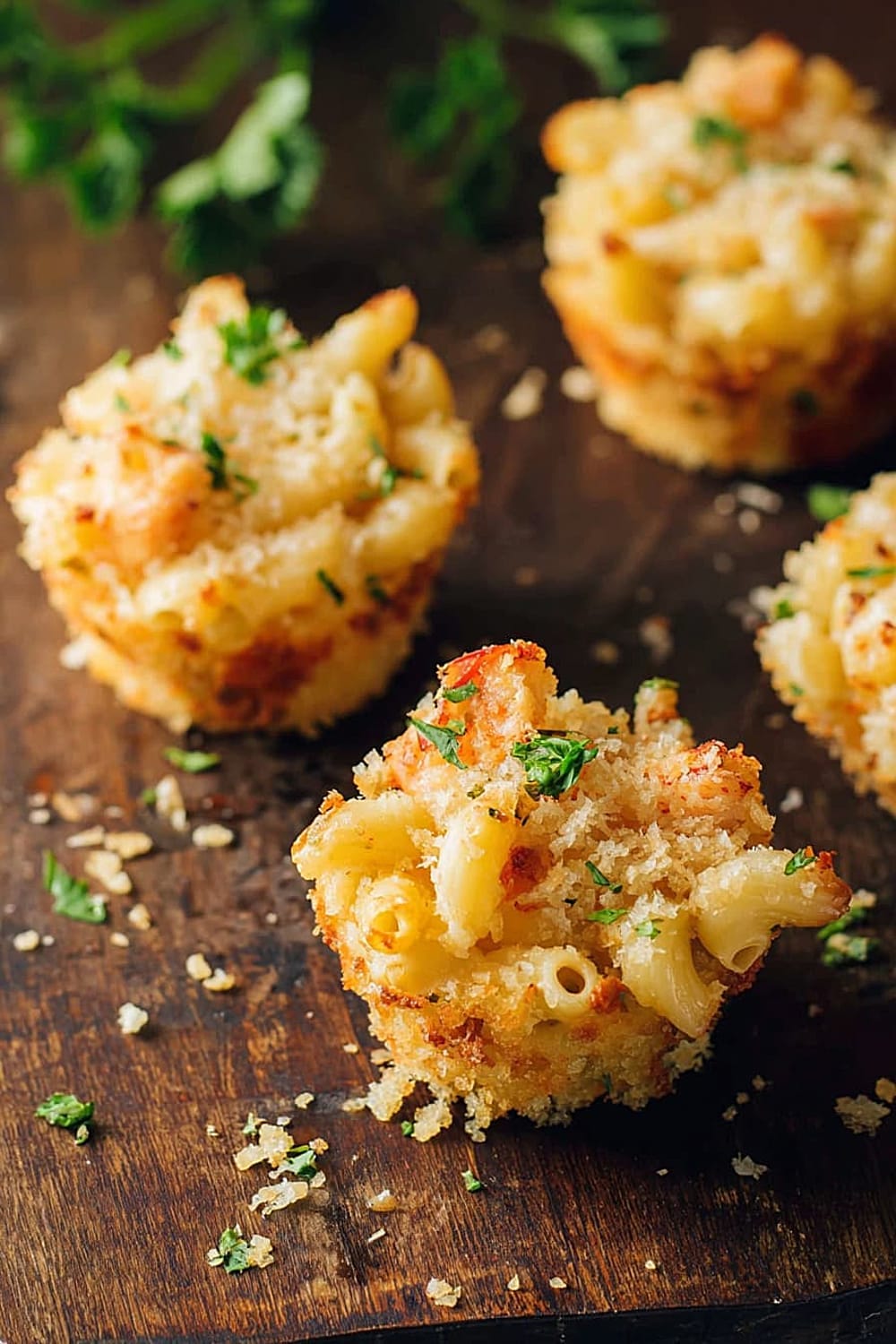 Each bite-sized portion delivers that perfect combination of rich, velvety cheese sauce, perfectly cooked macaroni, and sweet lobster chunks, all topped with a delightfully crispy panko breadcrumb crust.