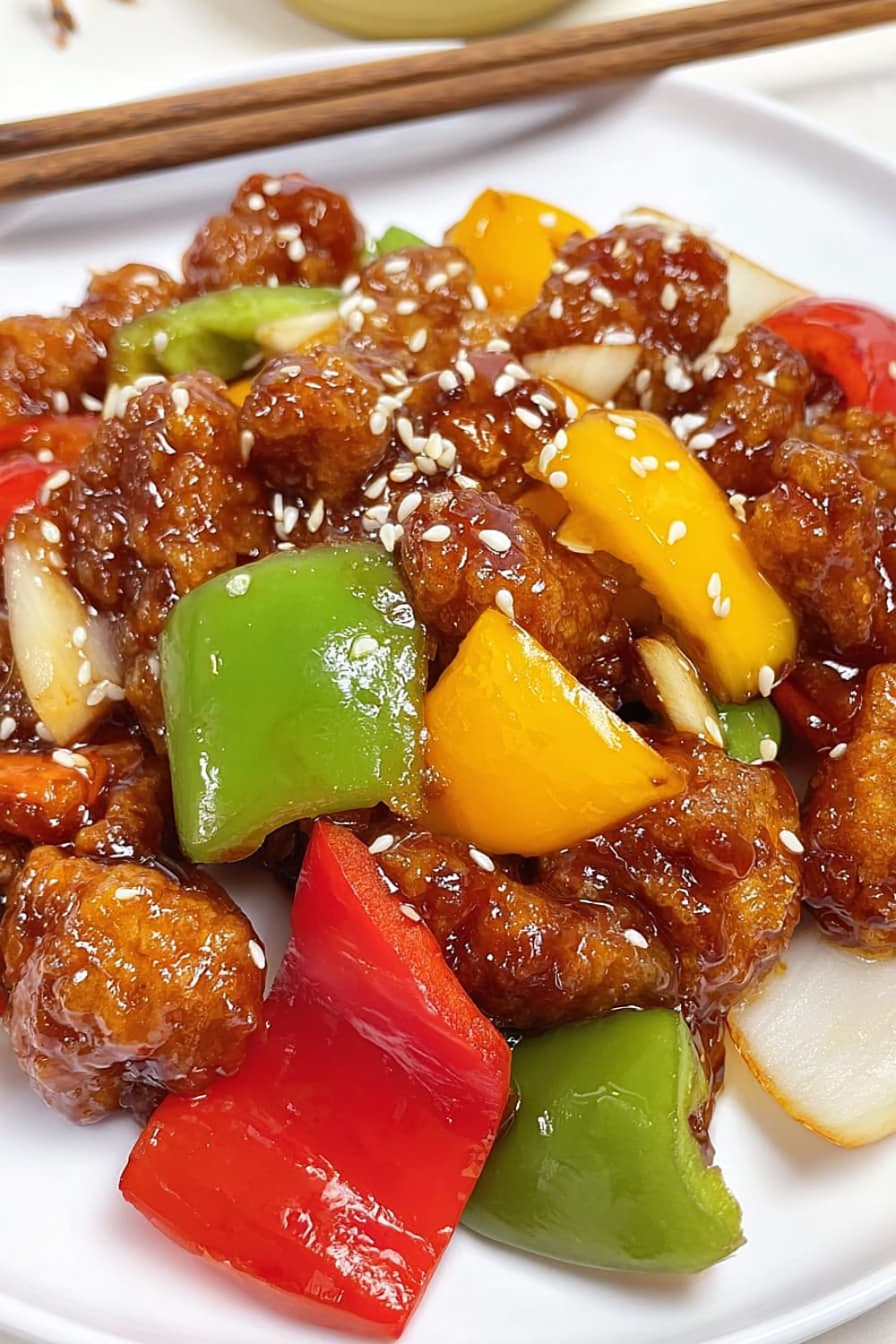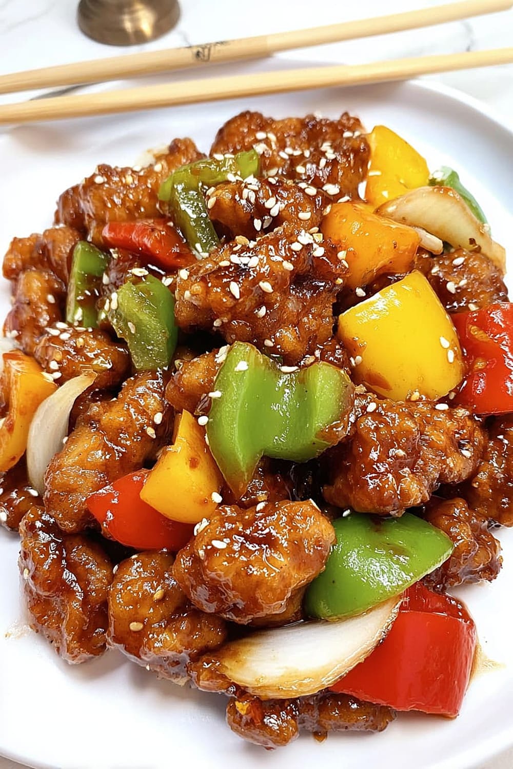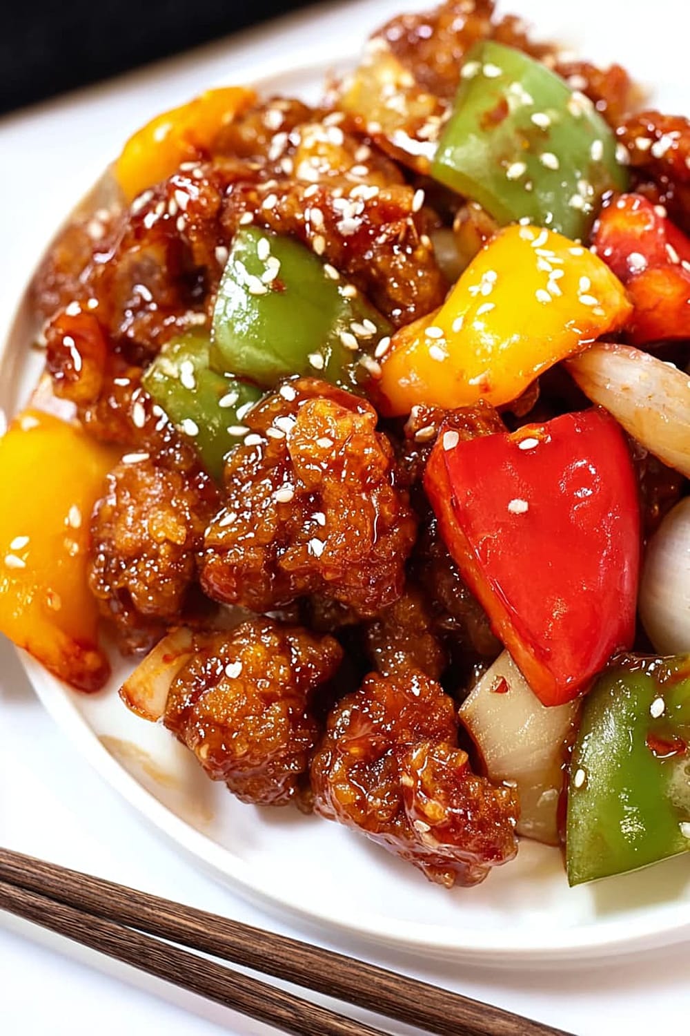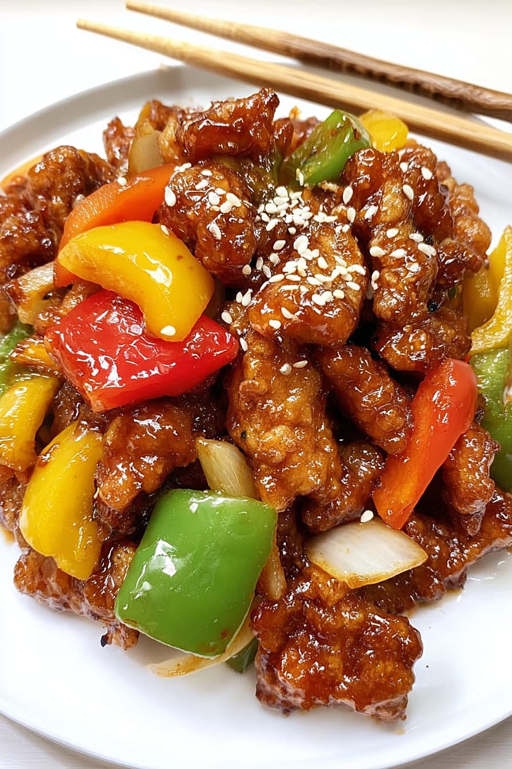 - 7 Add the stir-fried vegetables and crispy fried pork to the sauce. Quickly toss for 15-30 seconds until all pieces are fully coated in the glossy sauce. Work fast here – you want everything hot and the pork to maintain its crispiness. Serve immediately and top with sesame seeds for extra flavor and visual appeal.
