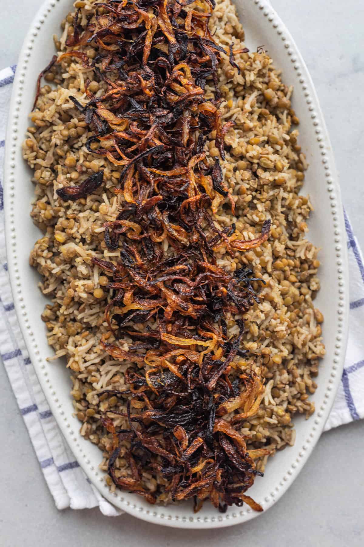 Mujadara is a comforting Middle Eastern dish made of lentils and rice topped with crispy onions. This vegan meal is easy to prepare and perfect for any occasion.