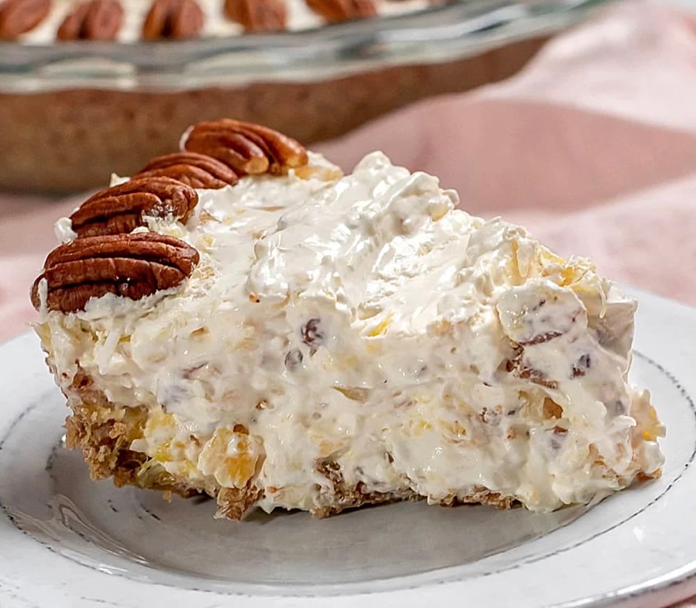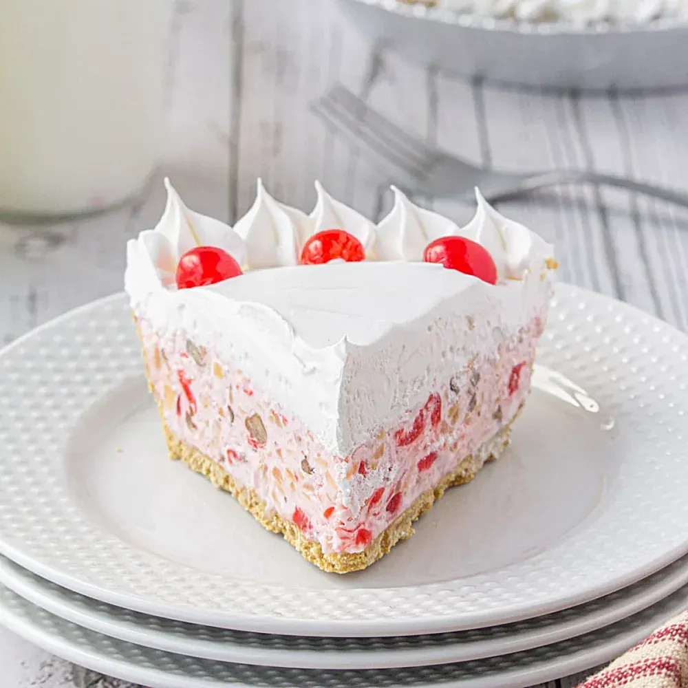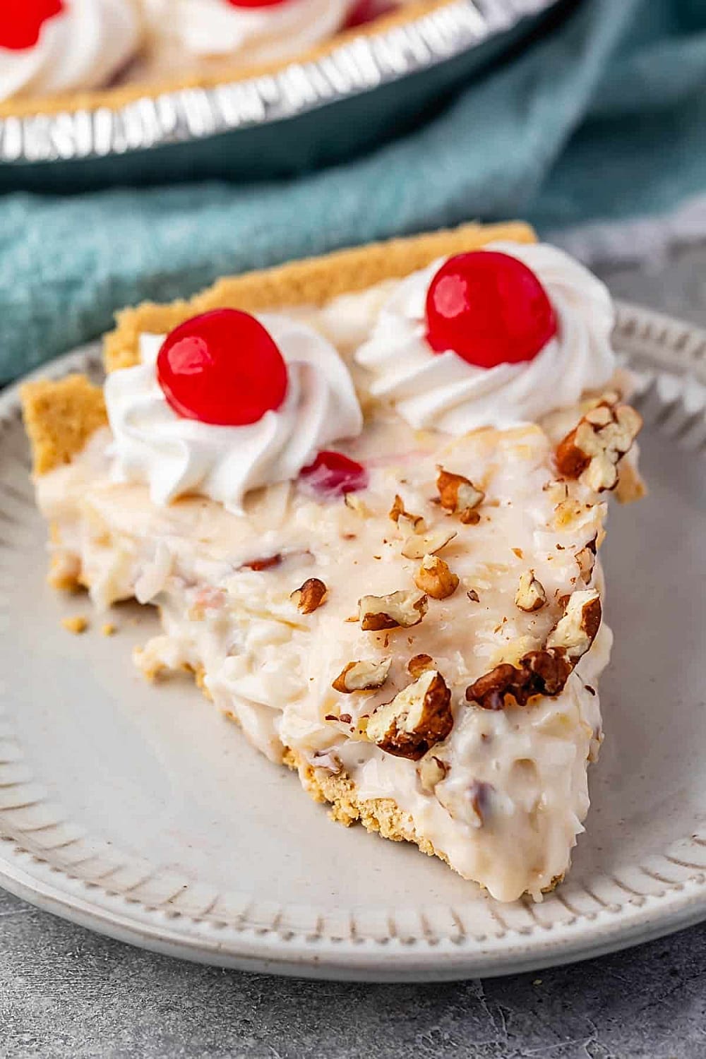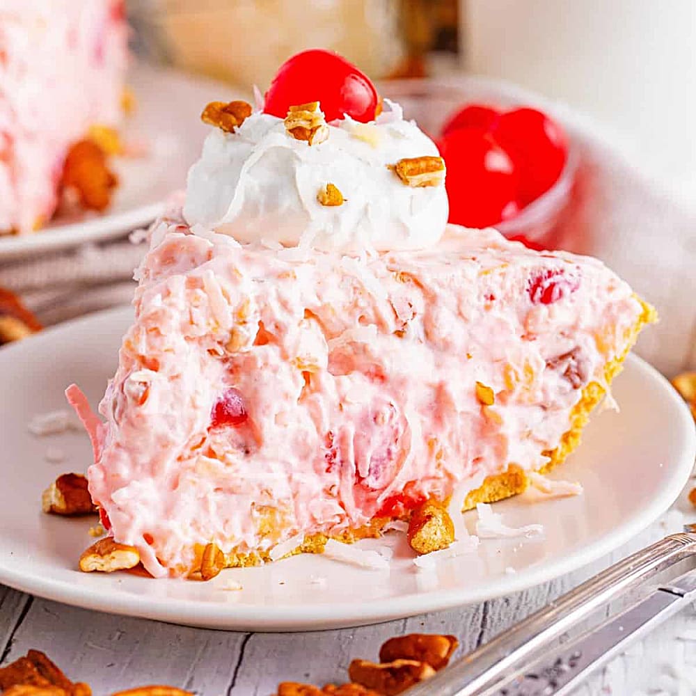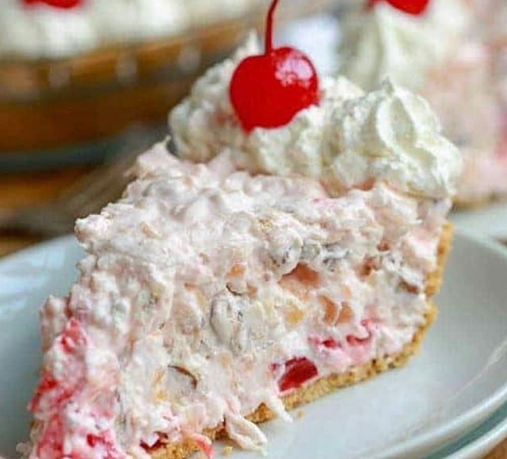 Picture this: a buttery graham cracker crust filled with a cloud-like mixture of cream cheese, crushed pineapple, toasted pecans, sweet coconut, and colorful maraschino cherries, all folded into billowy whipped cream.