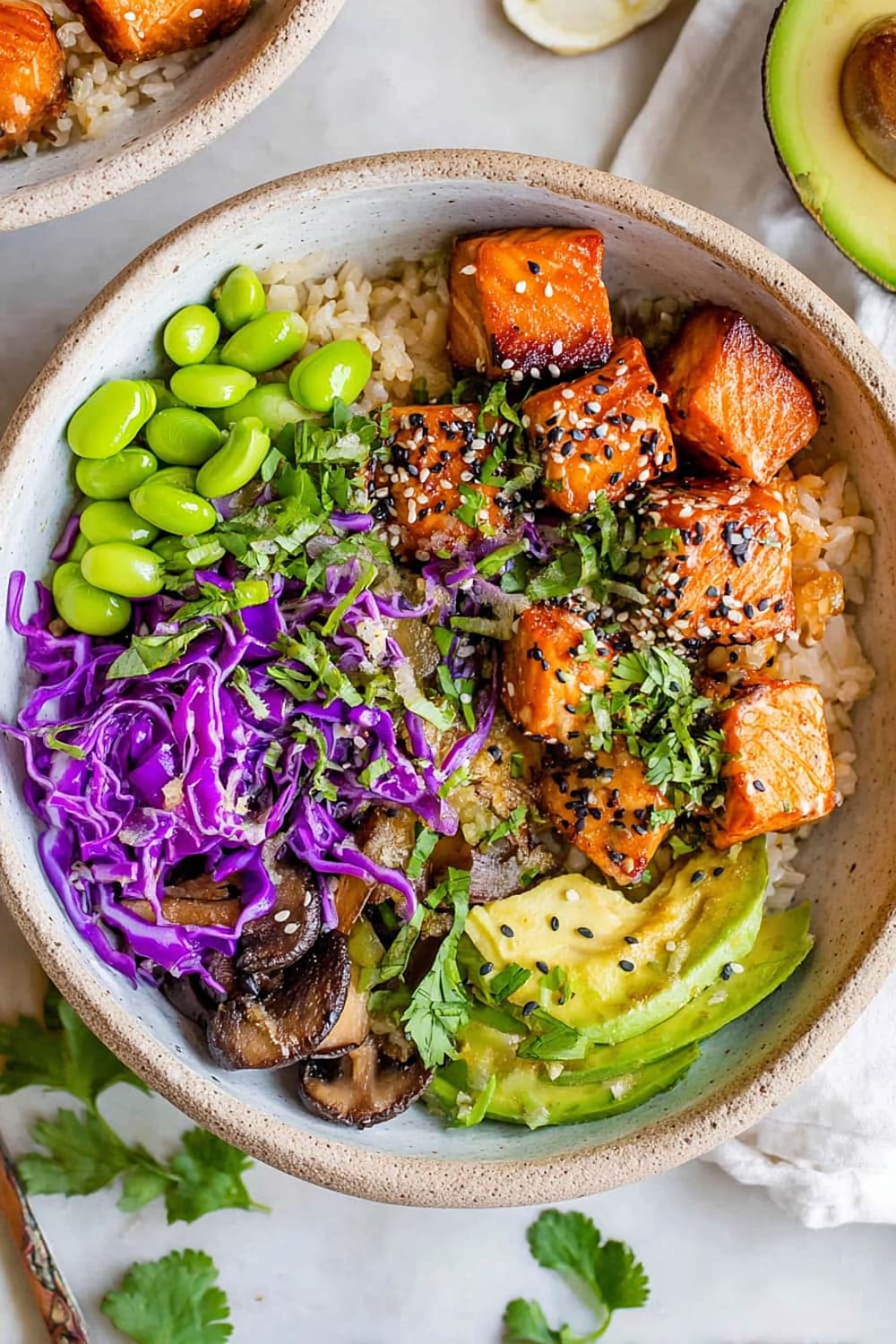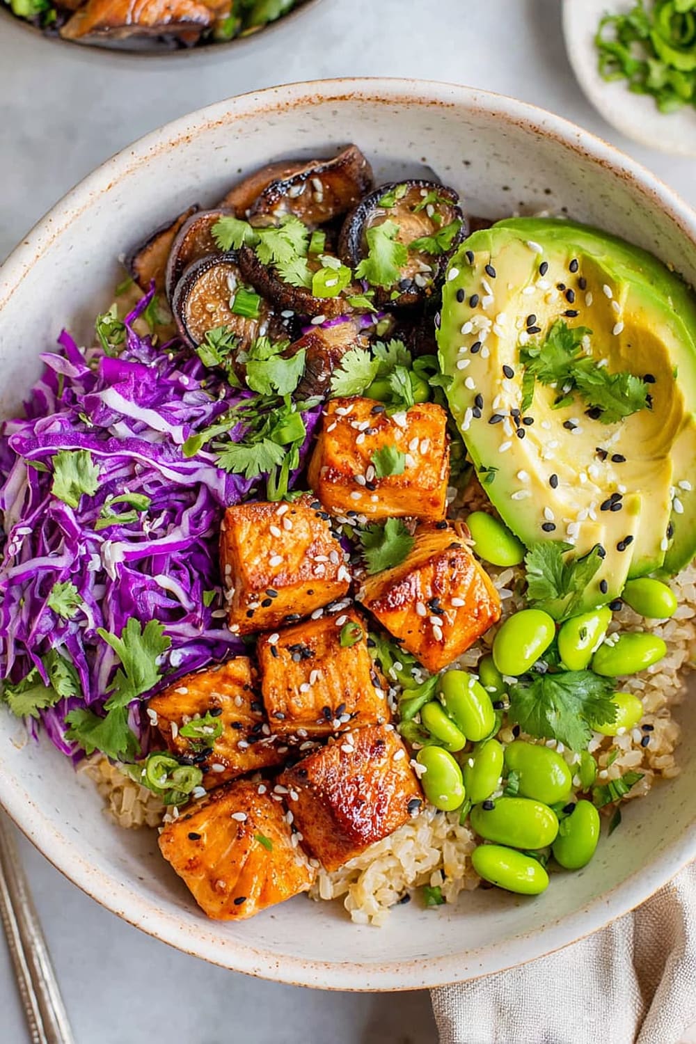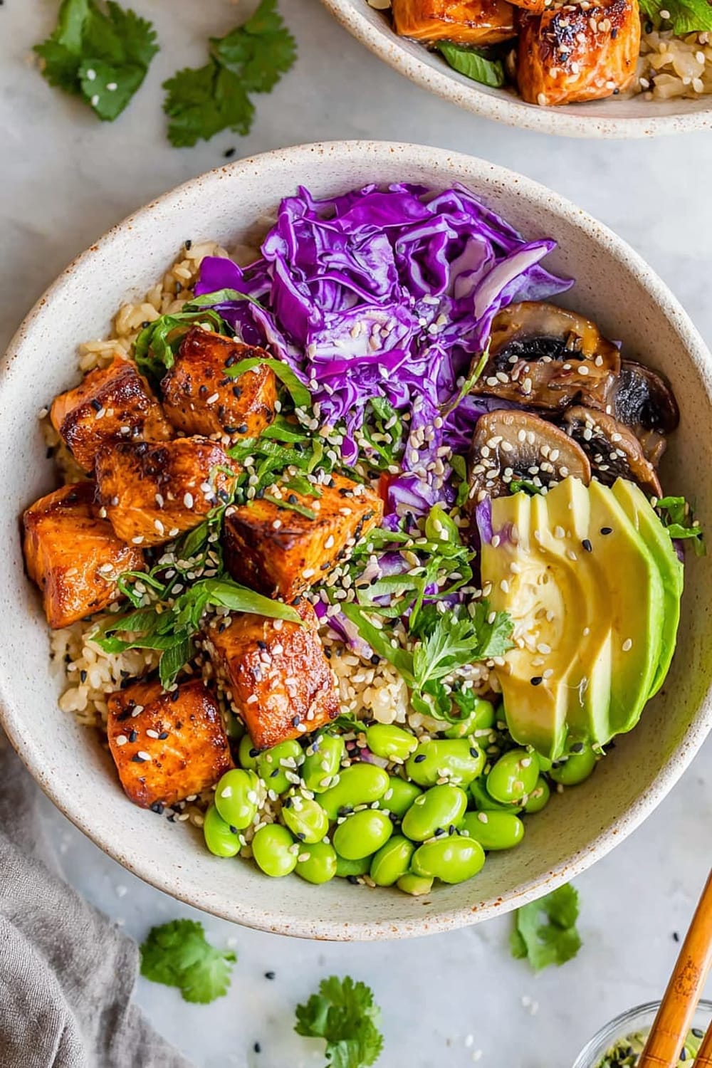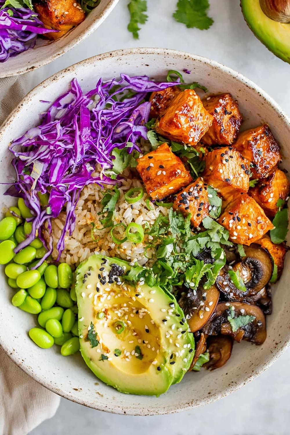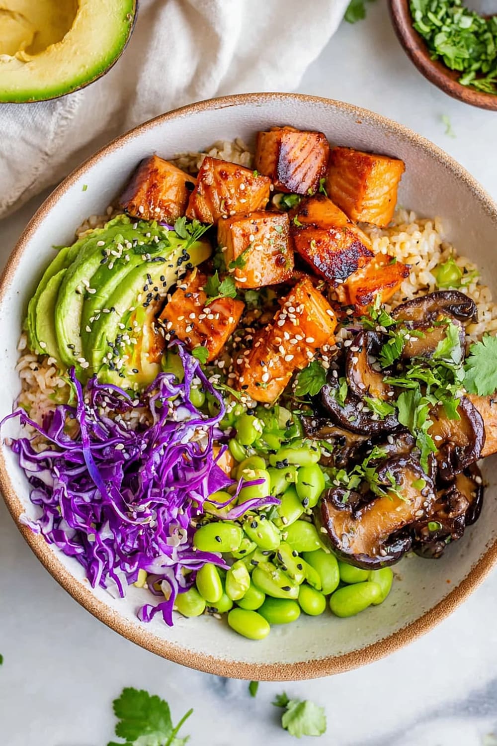 - 11 Arrange roasted shiitakes, edamame, sliced avocado, shredded red cabbage, and cooked salmon in separate sections over the rice, creating an aesthetically pleasing rainbow of colors and textures.