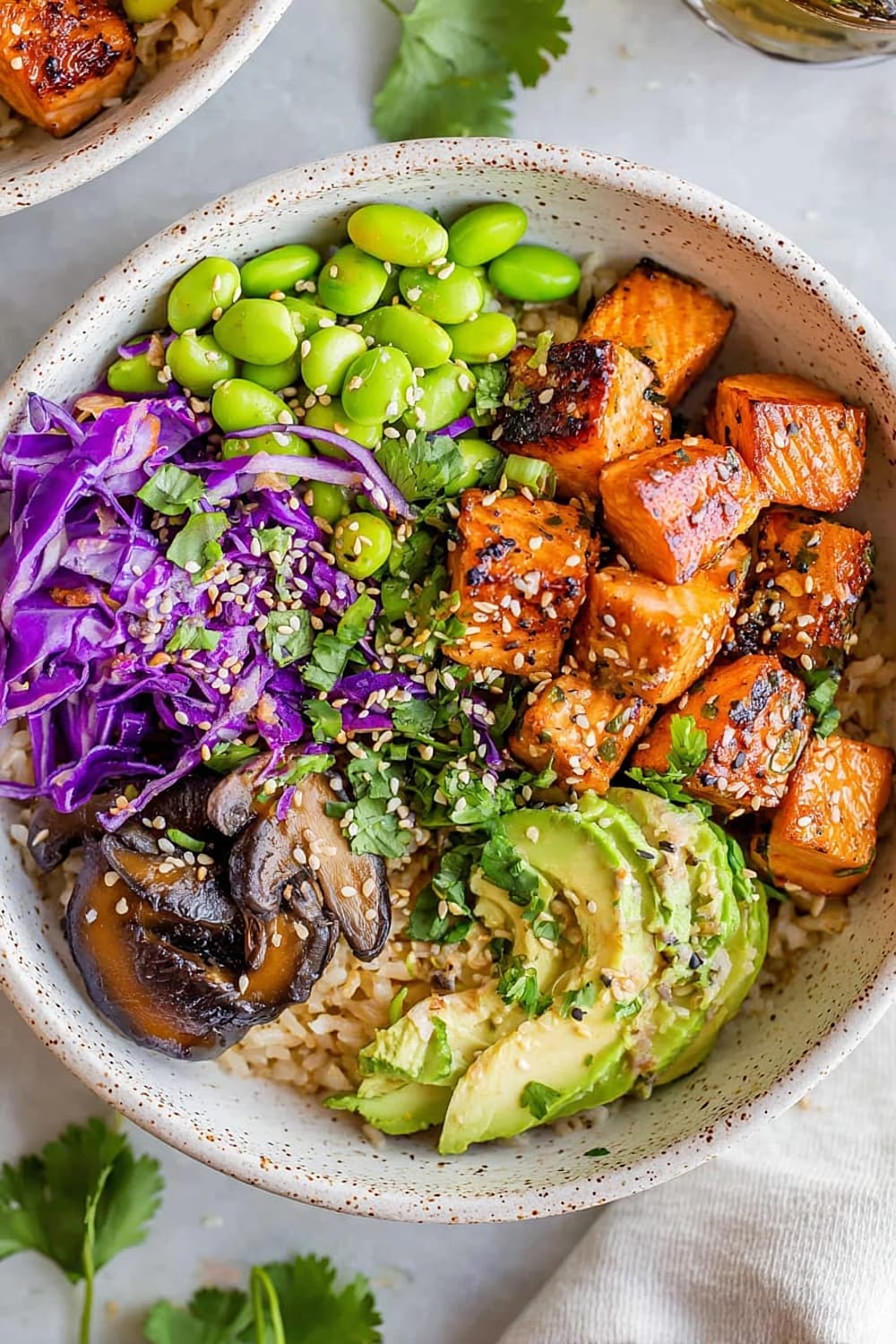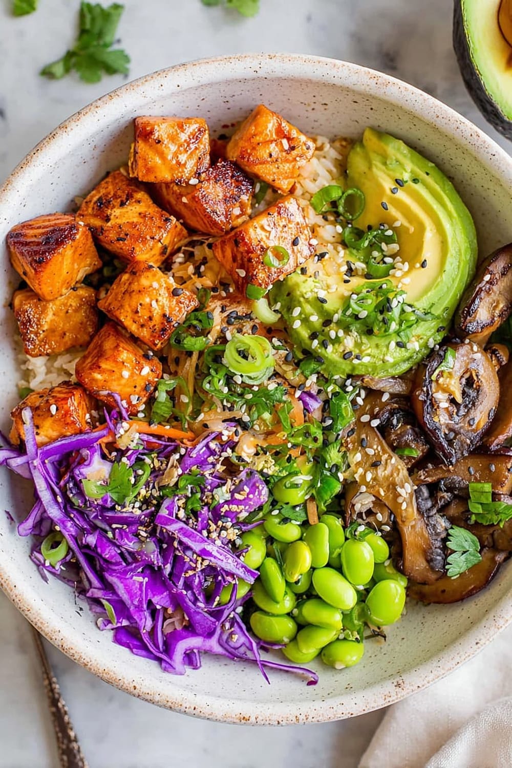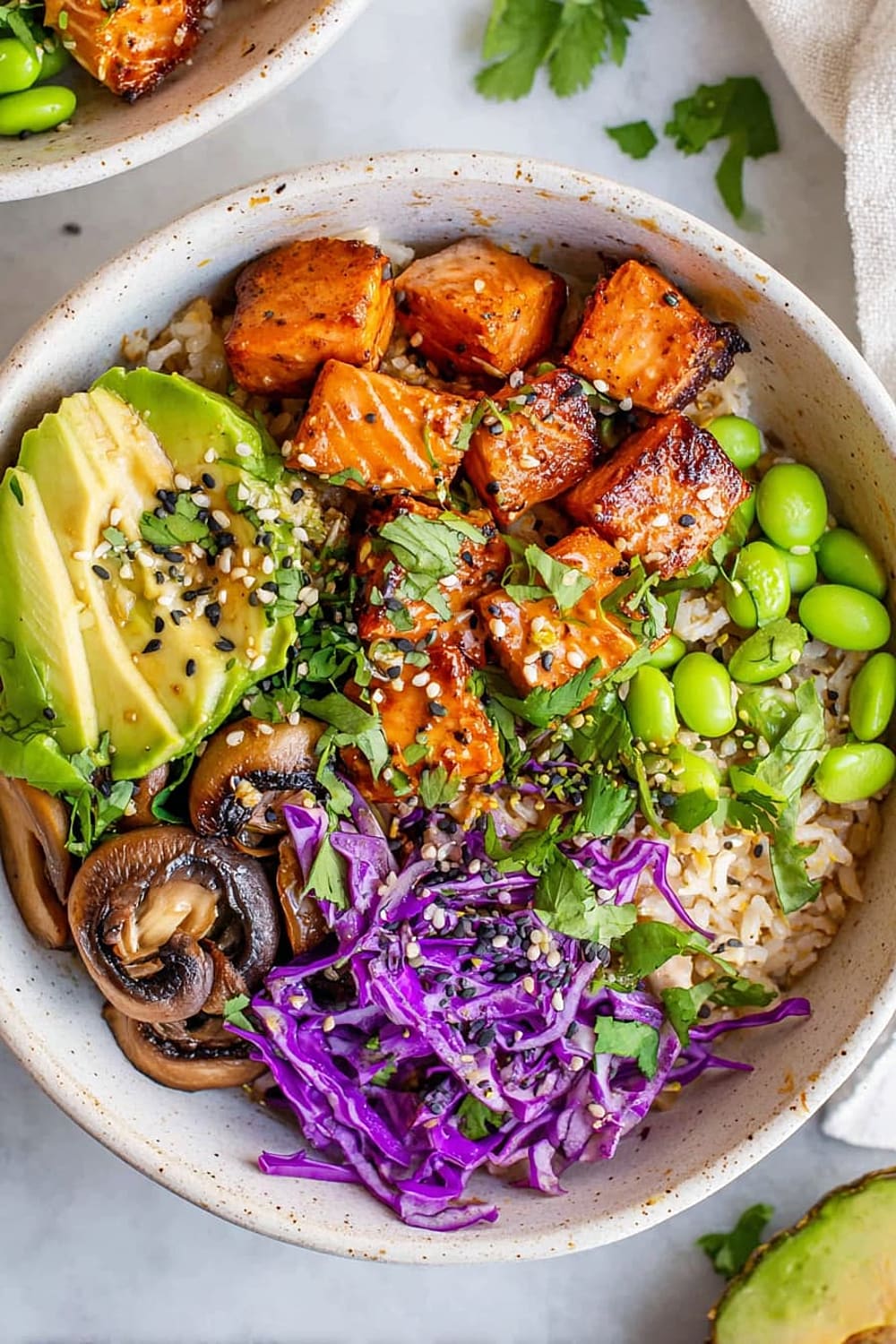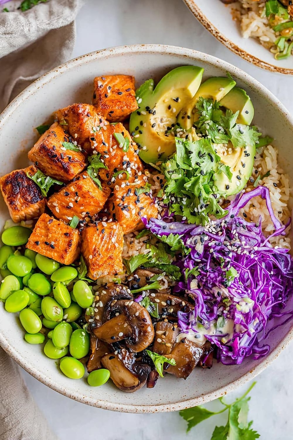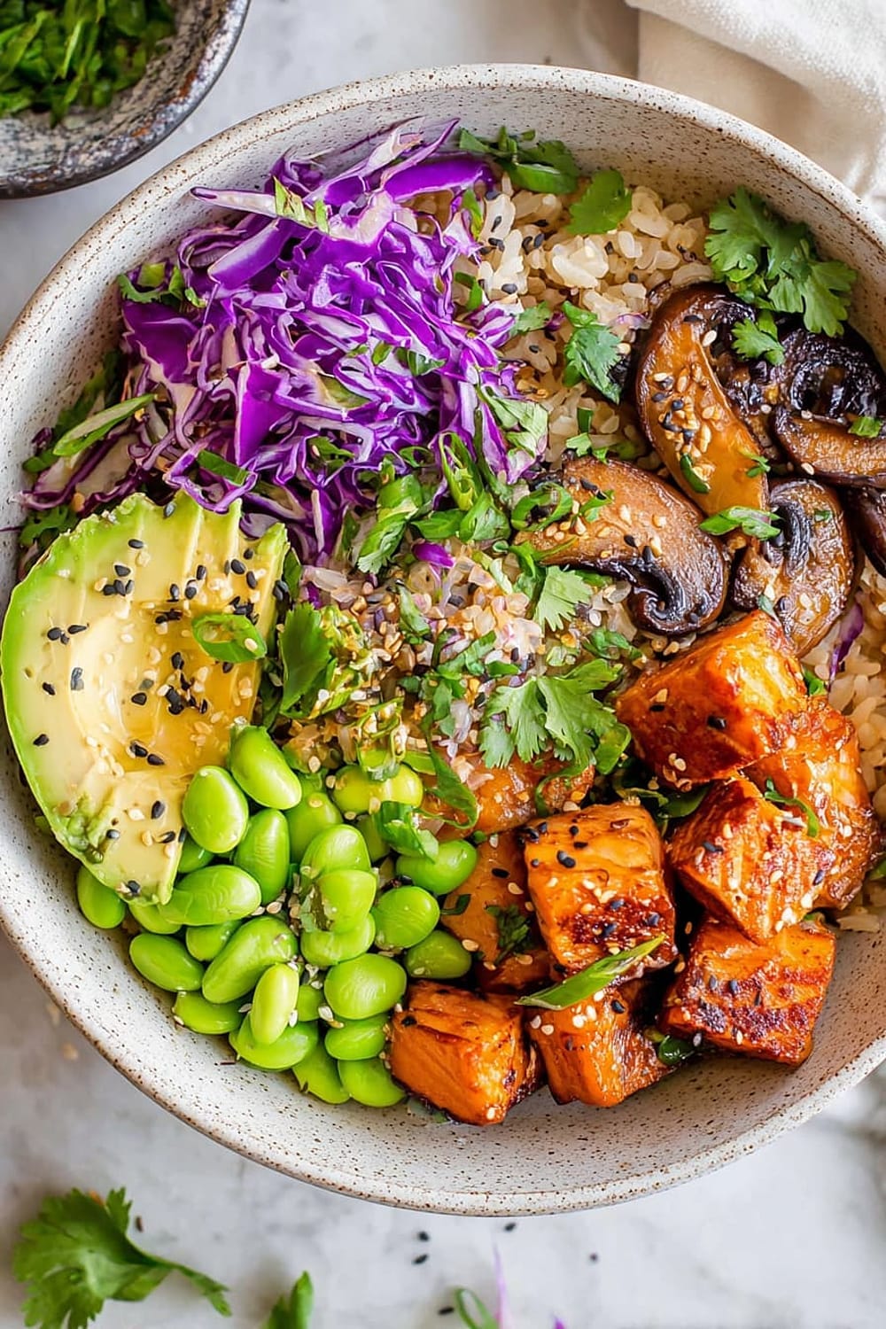 - 11 Arrange roasted shiitakes, edamame, sliced avocado, shredded red cabbage, and cooked salmon in separate sections over the rice, creating an aesthetically pleasing rainbow of colors and textures.