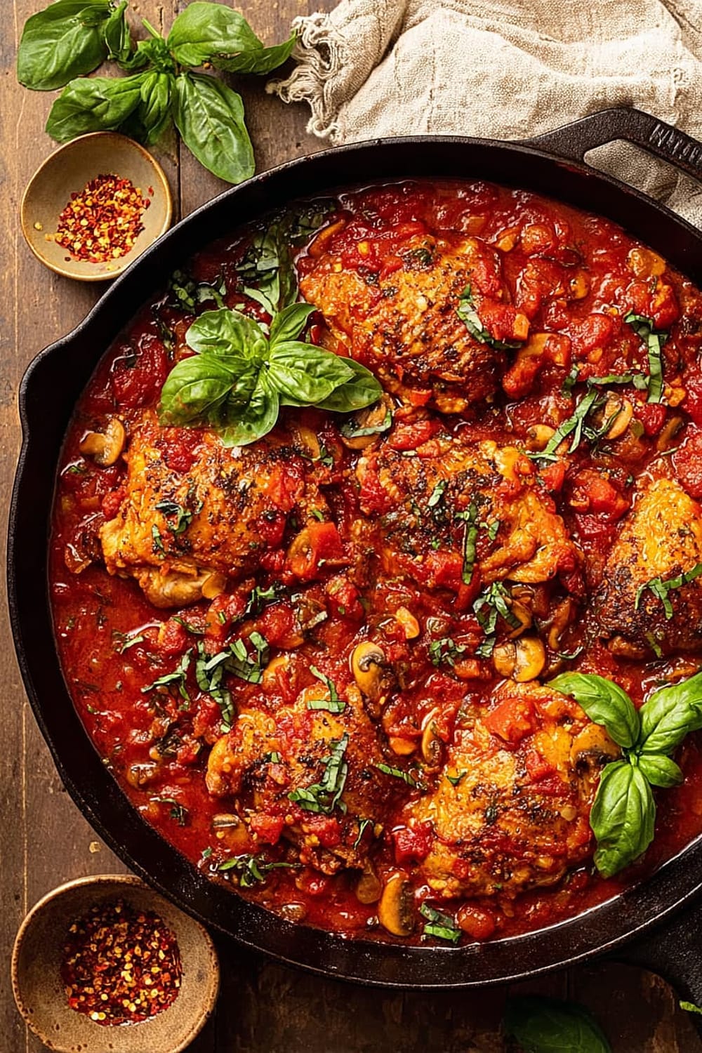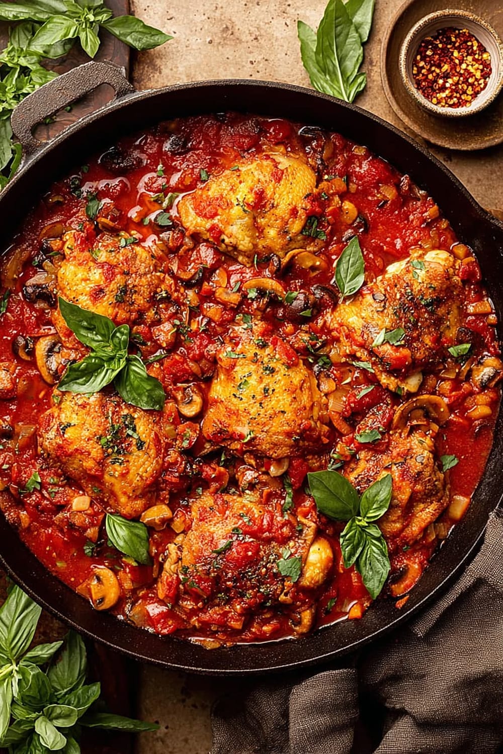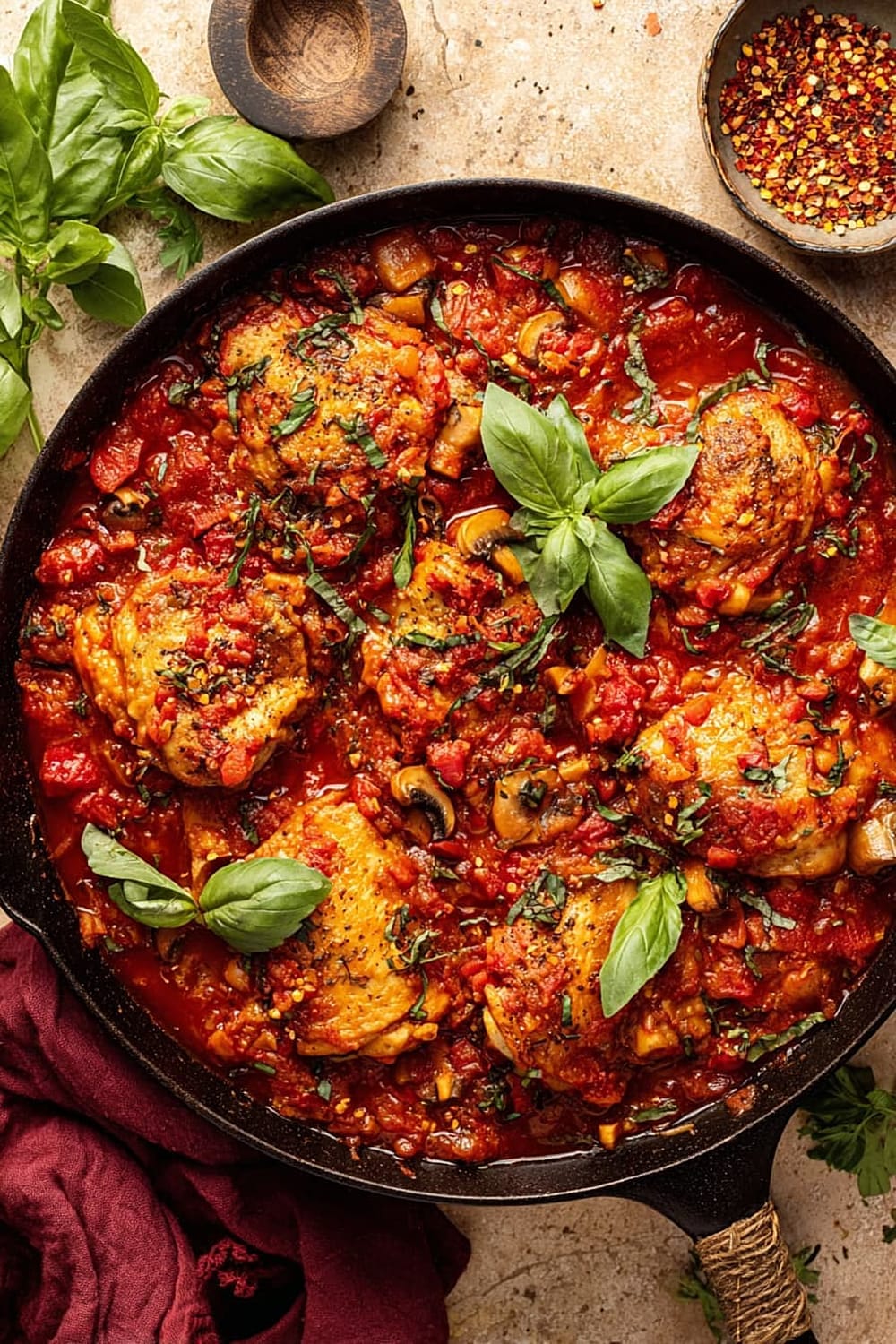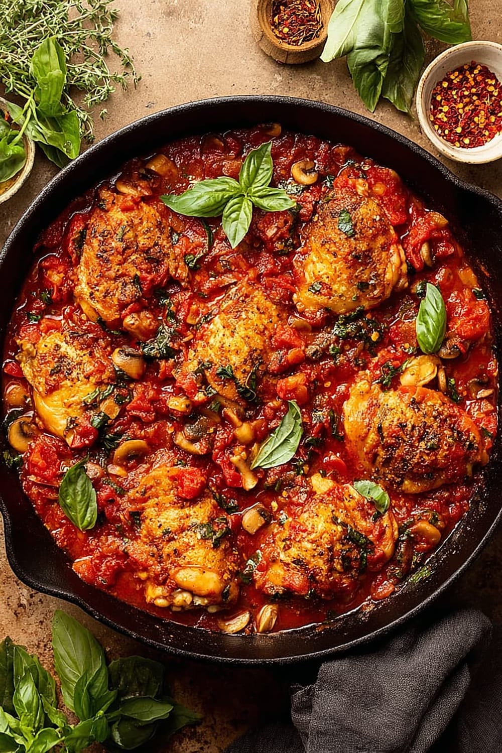 Picture tender chicken thighs simmering in a rich, herb-infused tomato sauce that’s been building flavor layers like a delicious symphony in your kitchen.