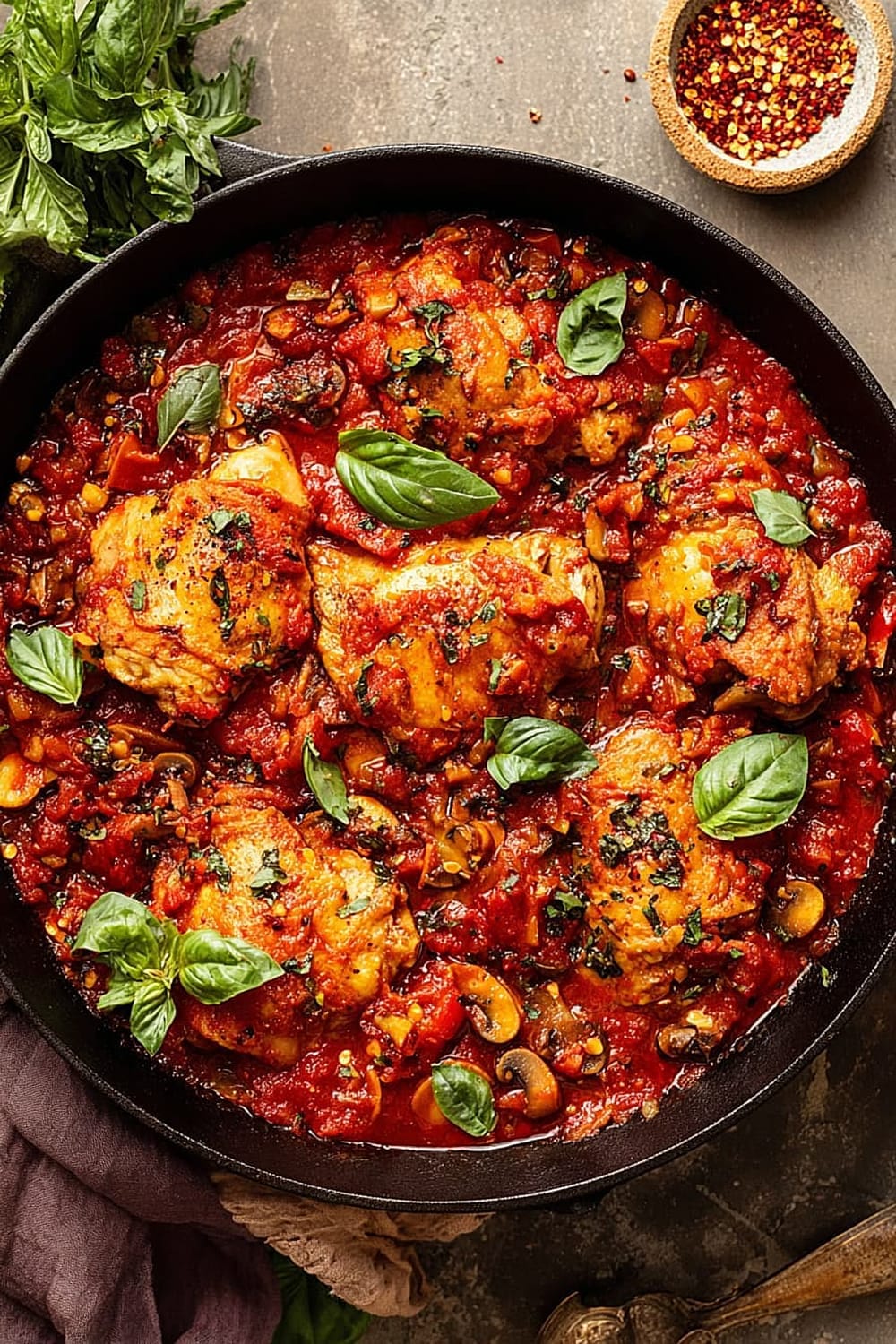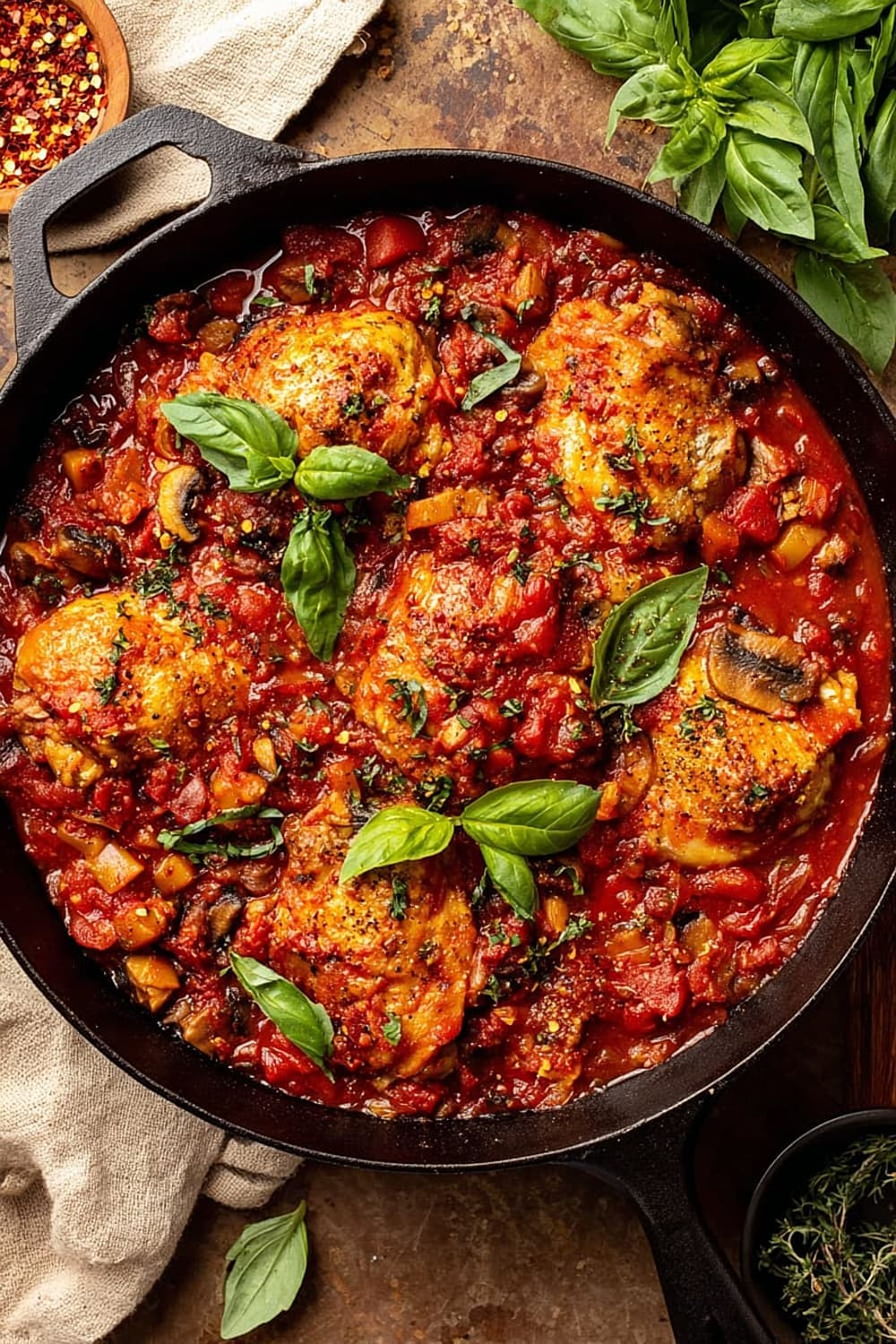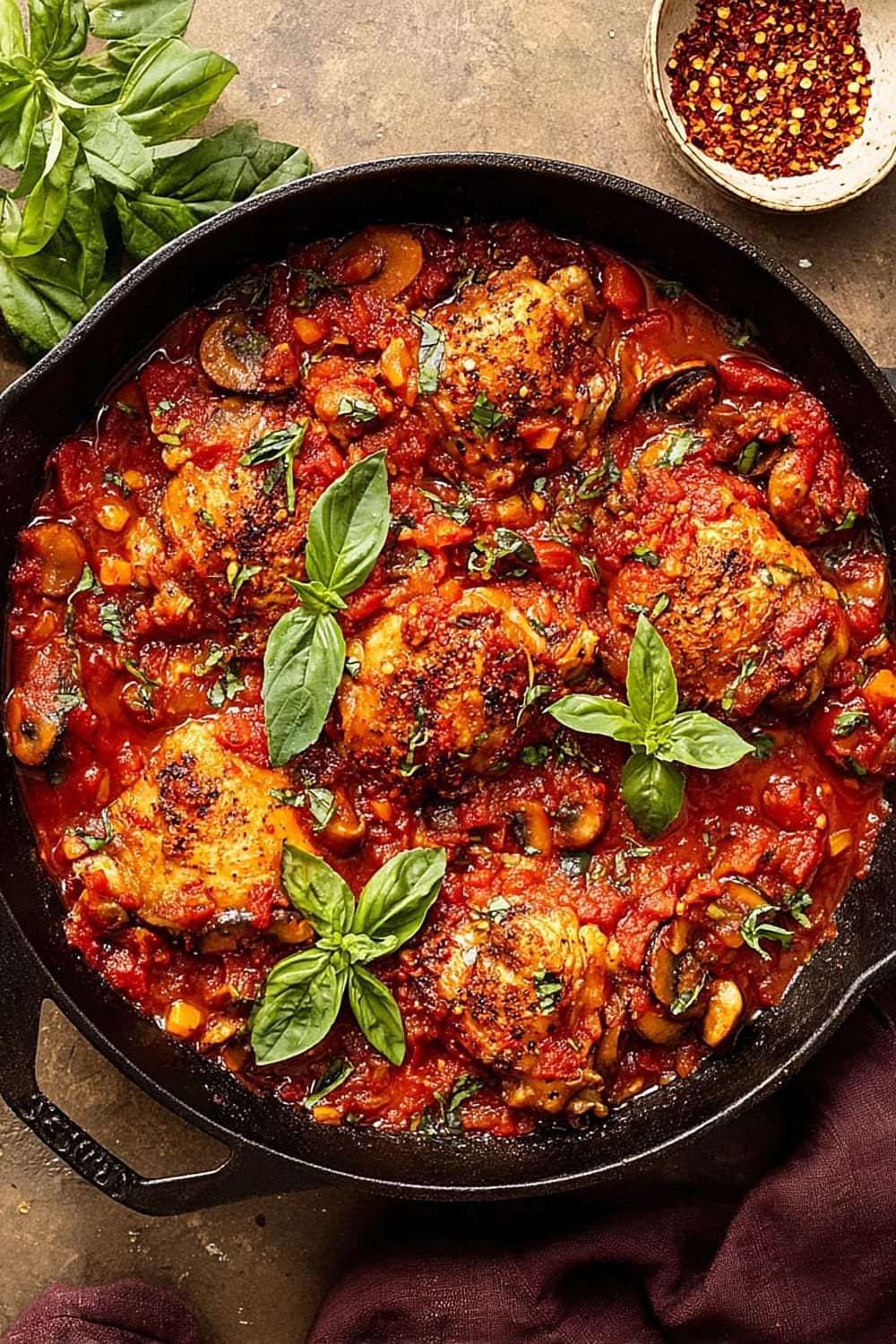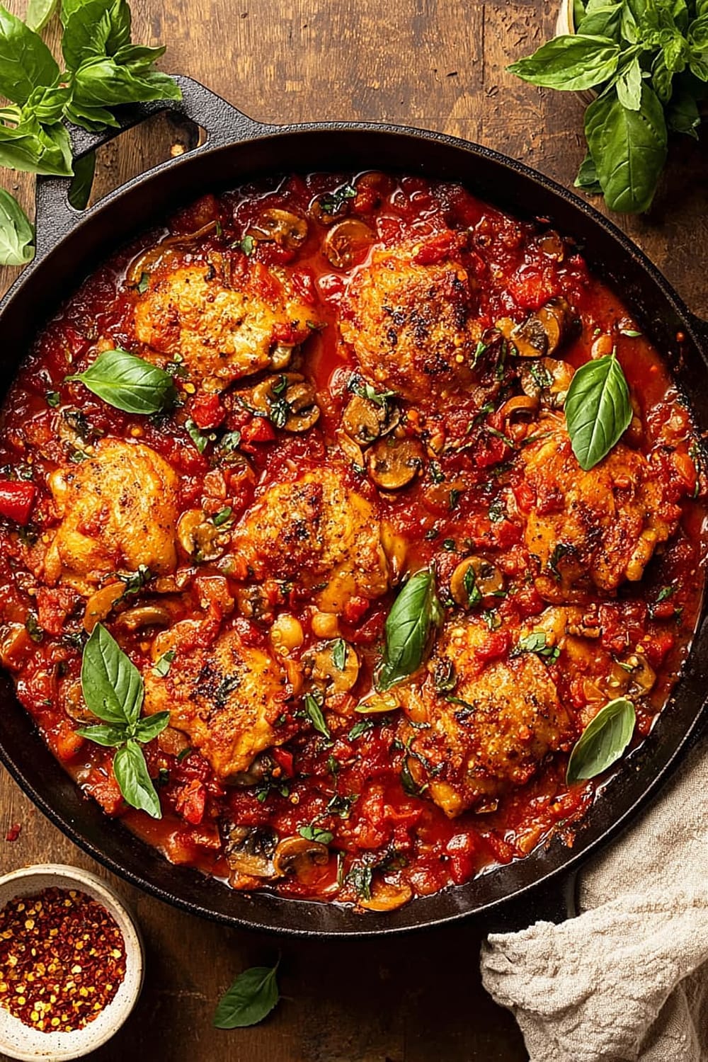Picture tender chicken thighs simmering in a rich, herb-infused tomato sauce that’s been building flavor layers like a delicious symphony in your kitchen.
