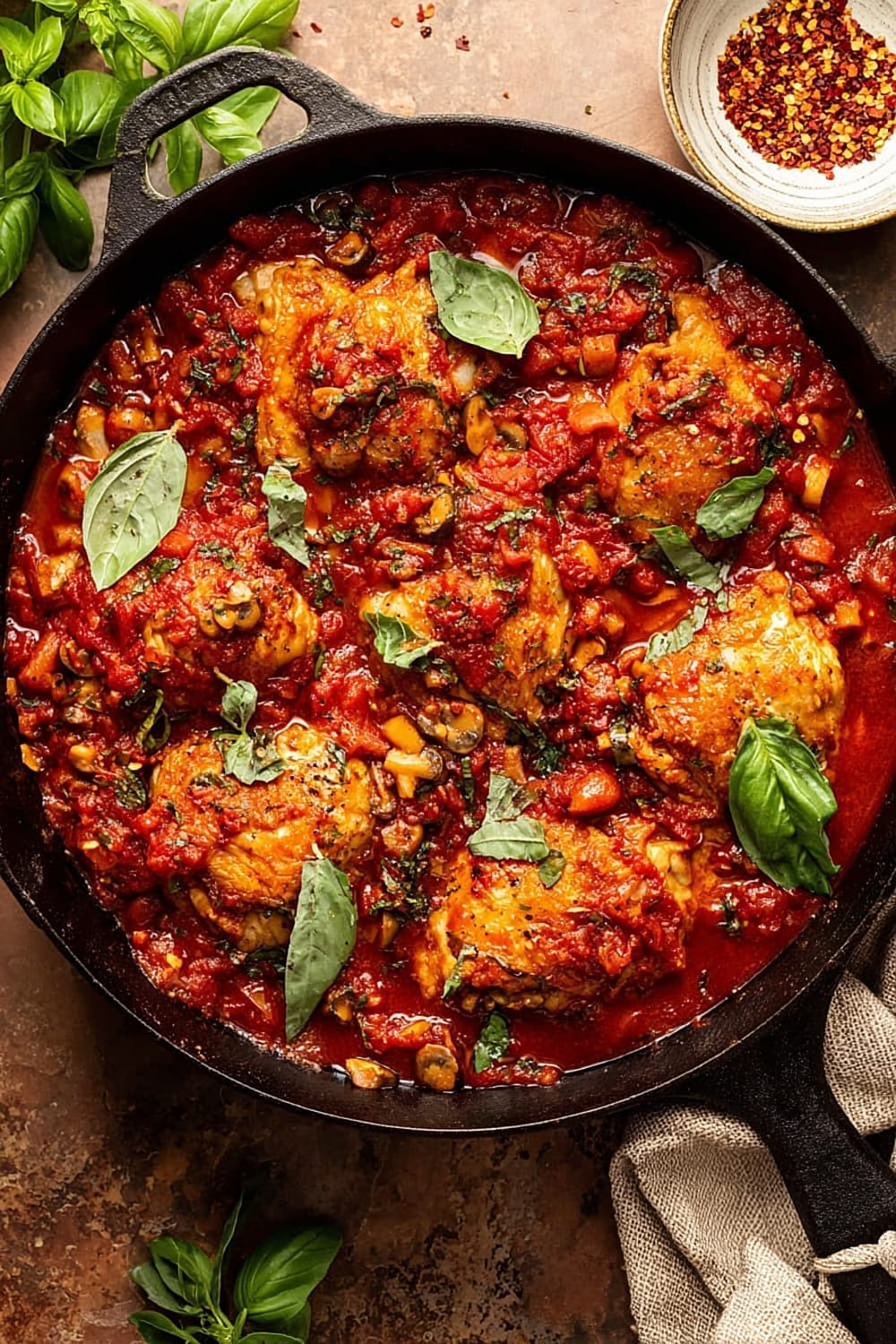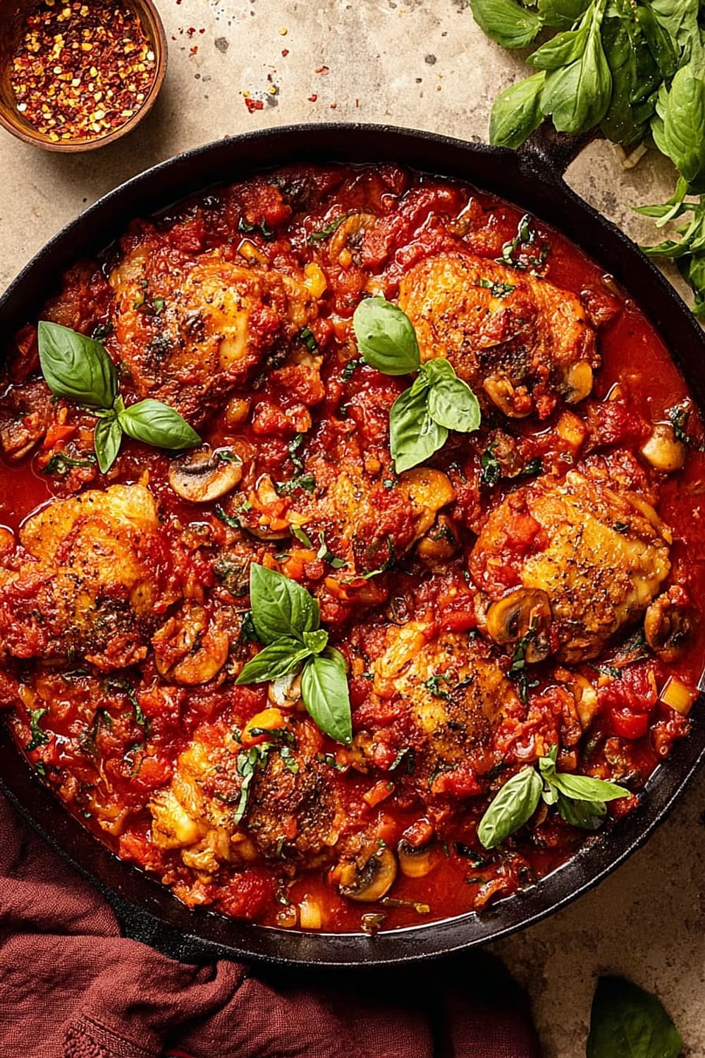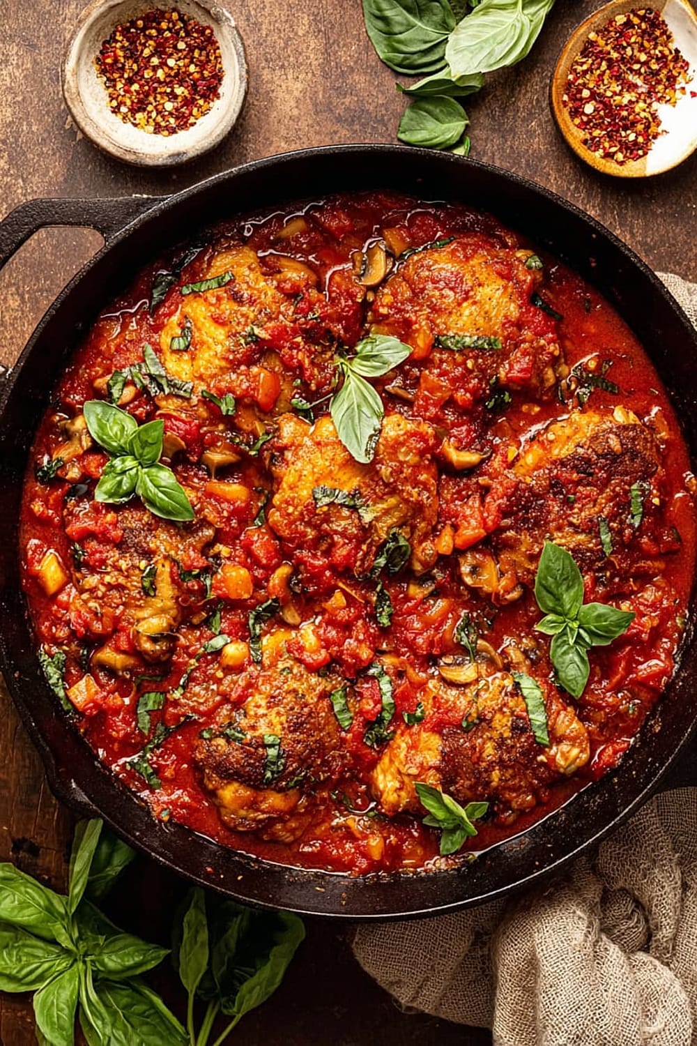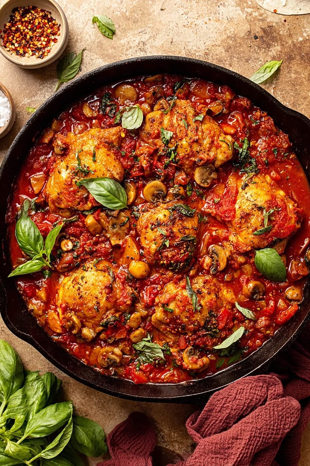 Picture tender chicken thighs simmering in a rich, herb-infused tomato sauce that’s been building flavor layers like a delicious symphony in your kitchen.