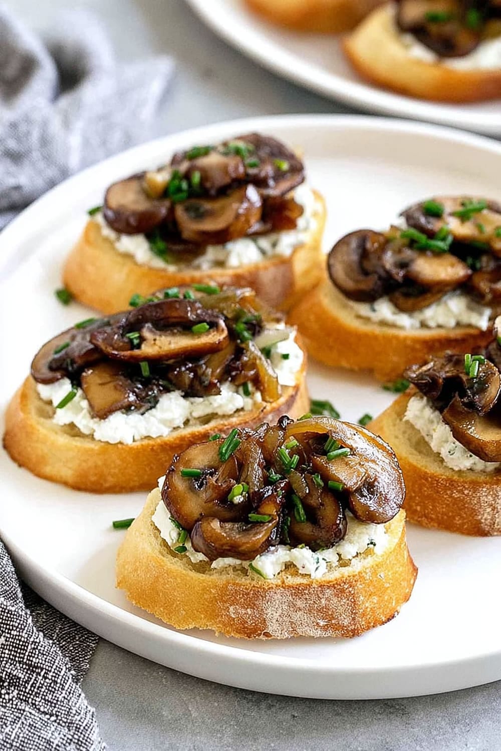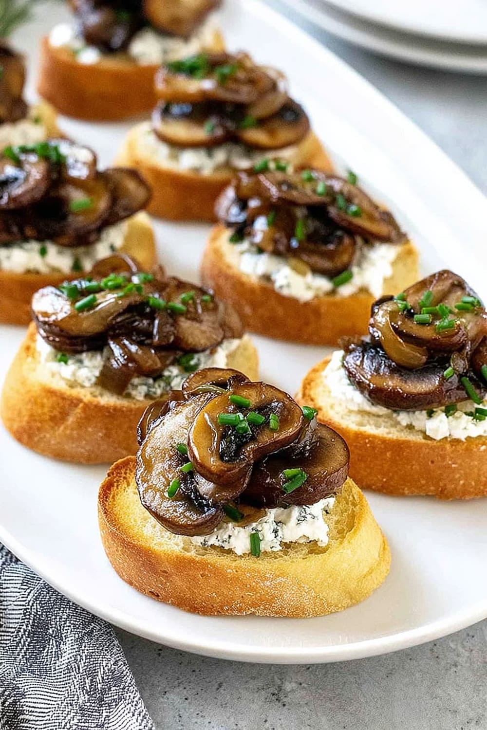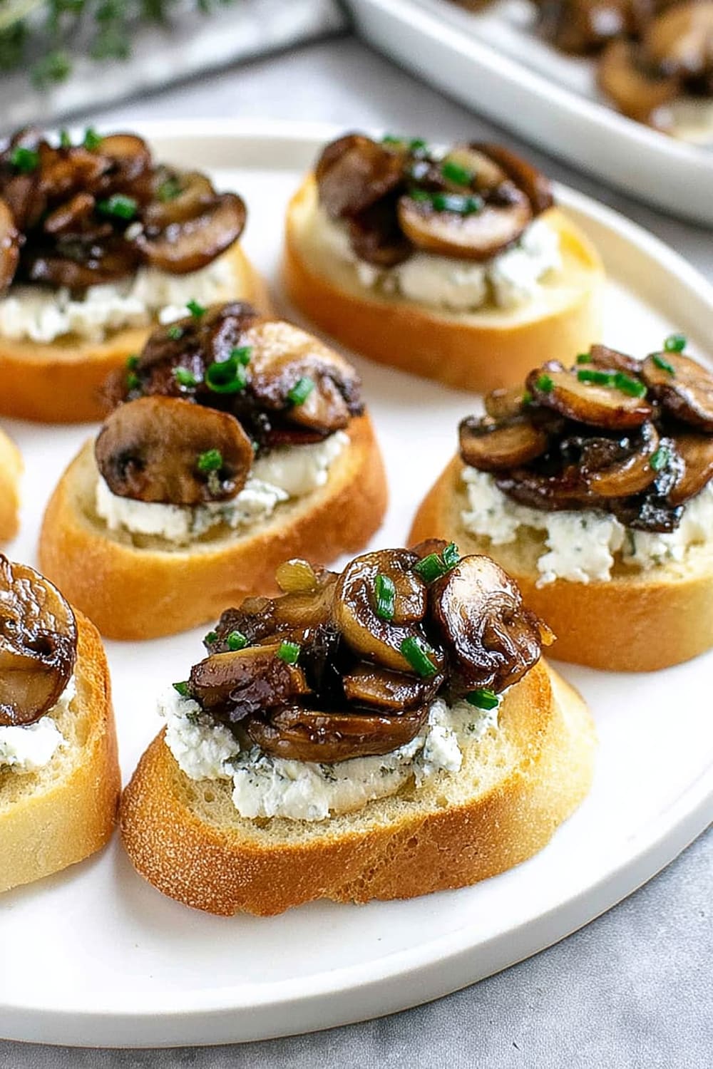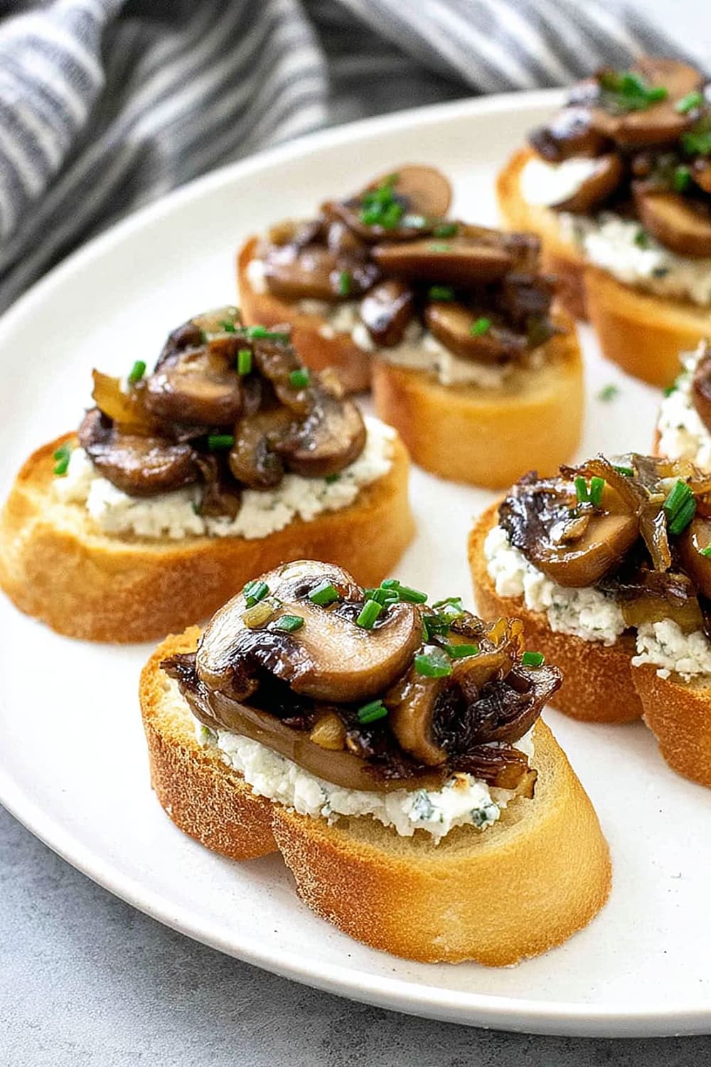 - 8 Using a butter knife or small offset spatula, spread about 2 teaspoons of the herbed goat cheese mixture over each toasted bread slice, creating an even layer that reaches the edges. Top each crostini with about 2 tablespoons of the caramelized onion and mushroom mixture, mounding it slightly in the center. Sprinkle with freshly cracked black pepper and additional chives for garnish. Arrange on a serving platter and serve immediately.