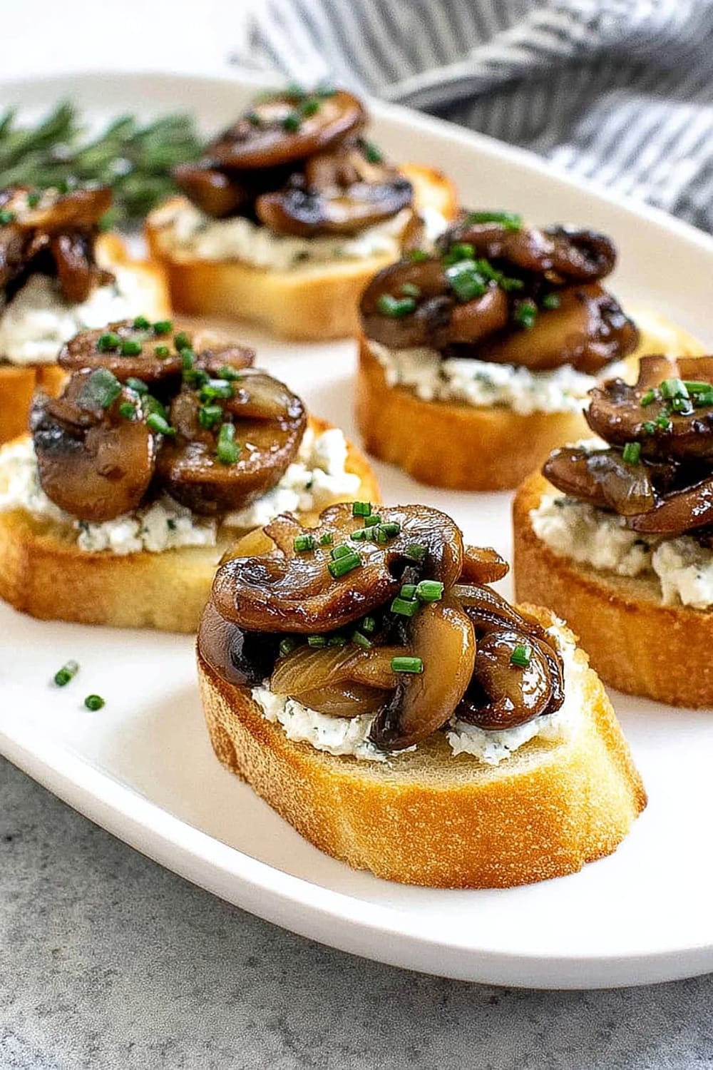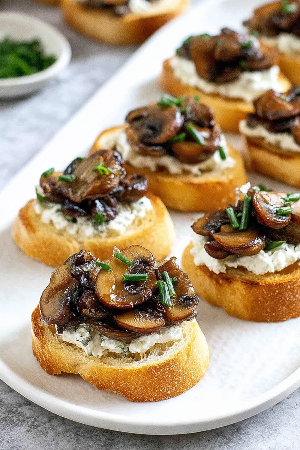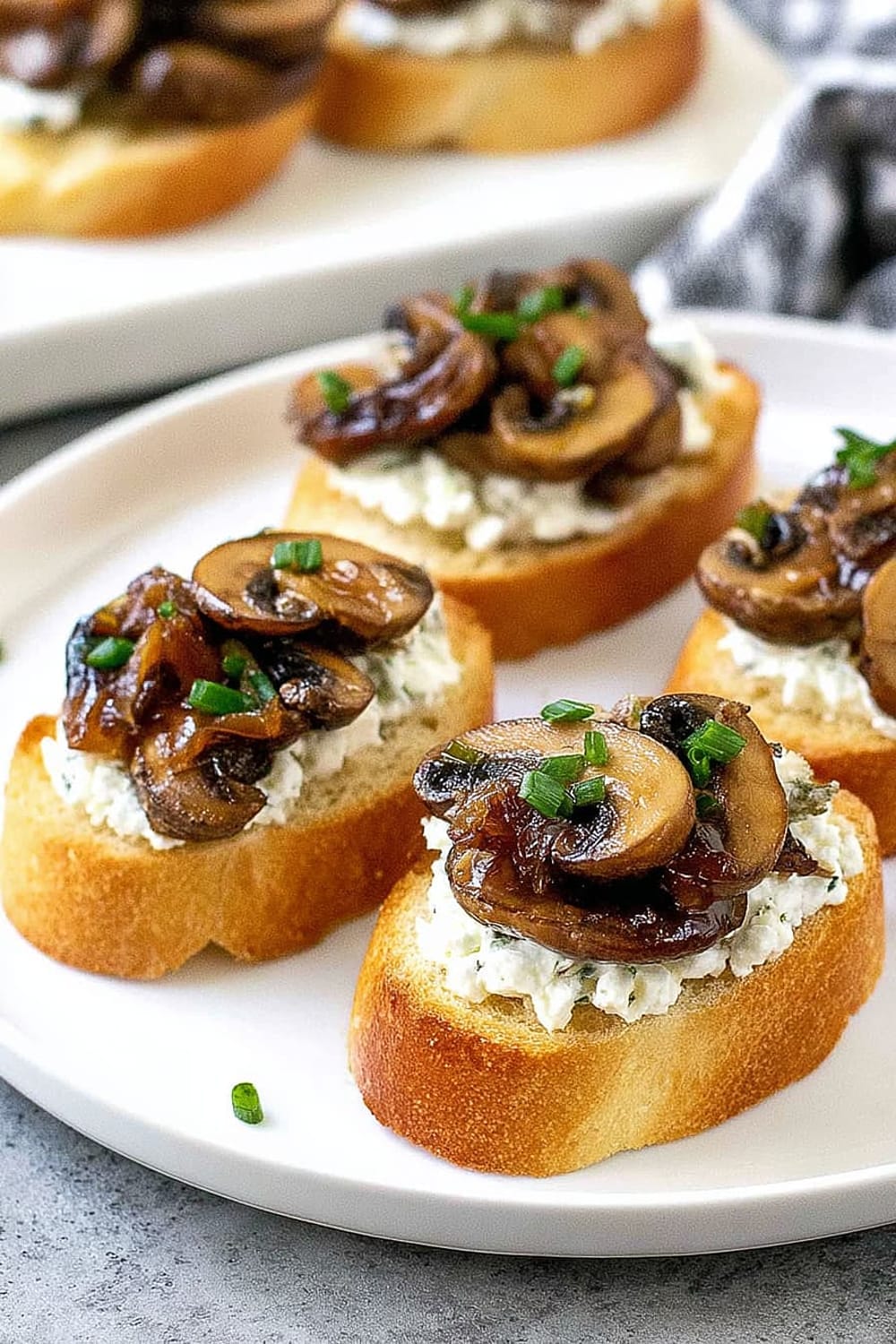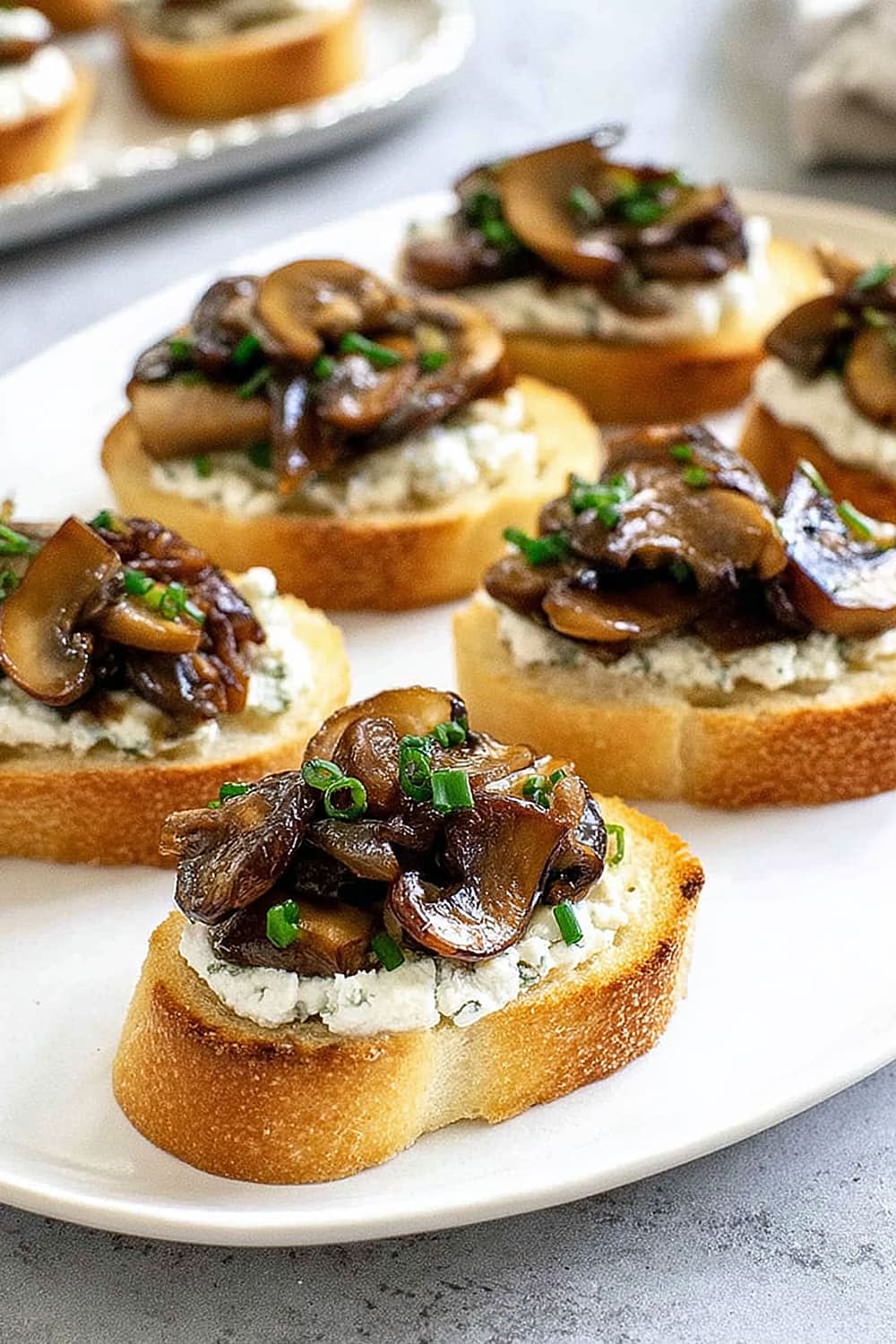 - 8 Using a butter knife or small offset spatula, spread about 2 teaspoons of the herbed goat cheese mixture over each toasted bread slice, creating an even layer that reaches the edges. Top each crostini with about 2 tablespoons of the caramelized onion and mushroom mixture, mounding it slightly in the center. Sprinkle with freshly cracked black pepper and additional chives for garnish. Arrange on a serving platter and serve immediately.
