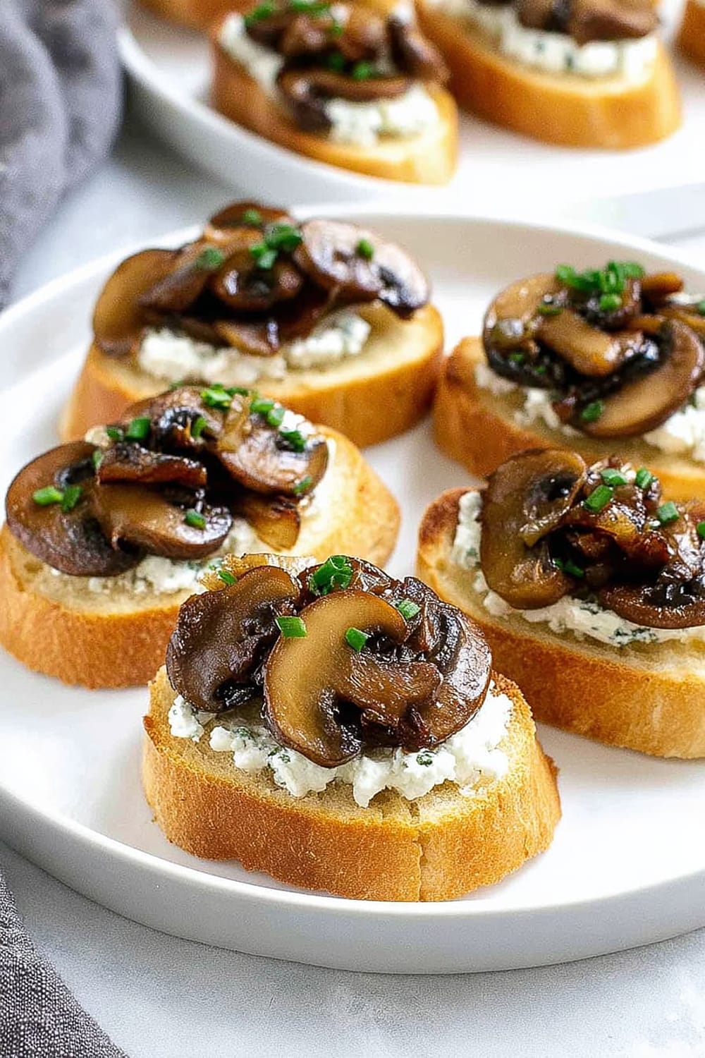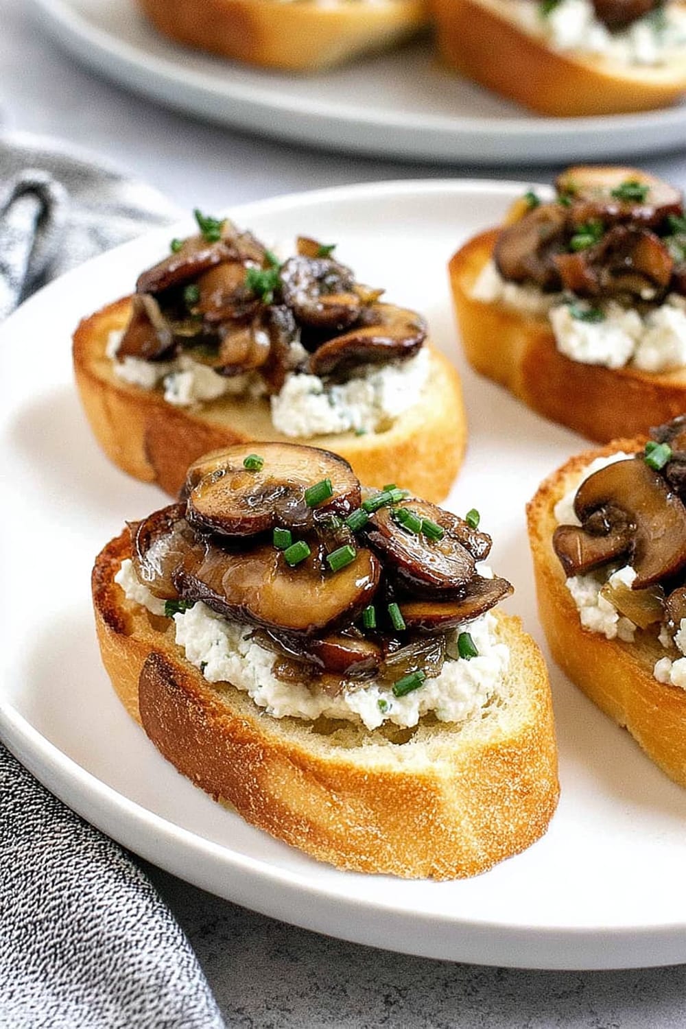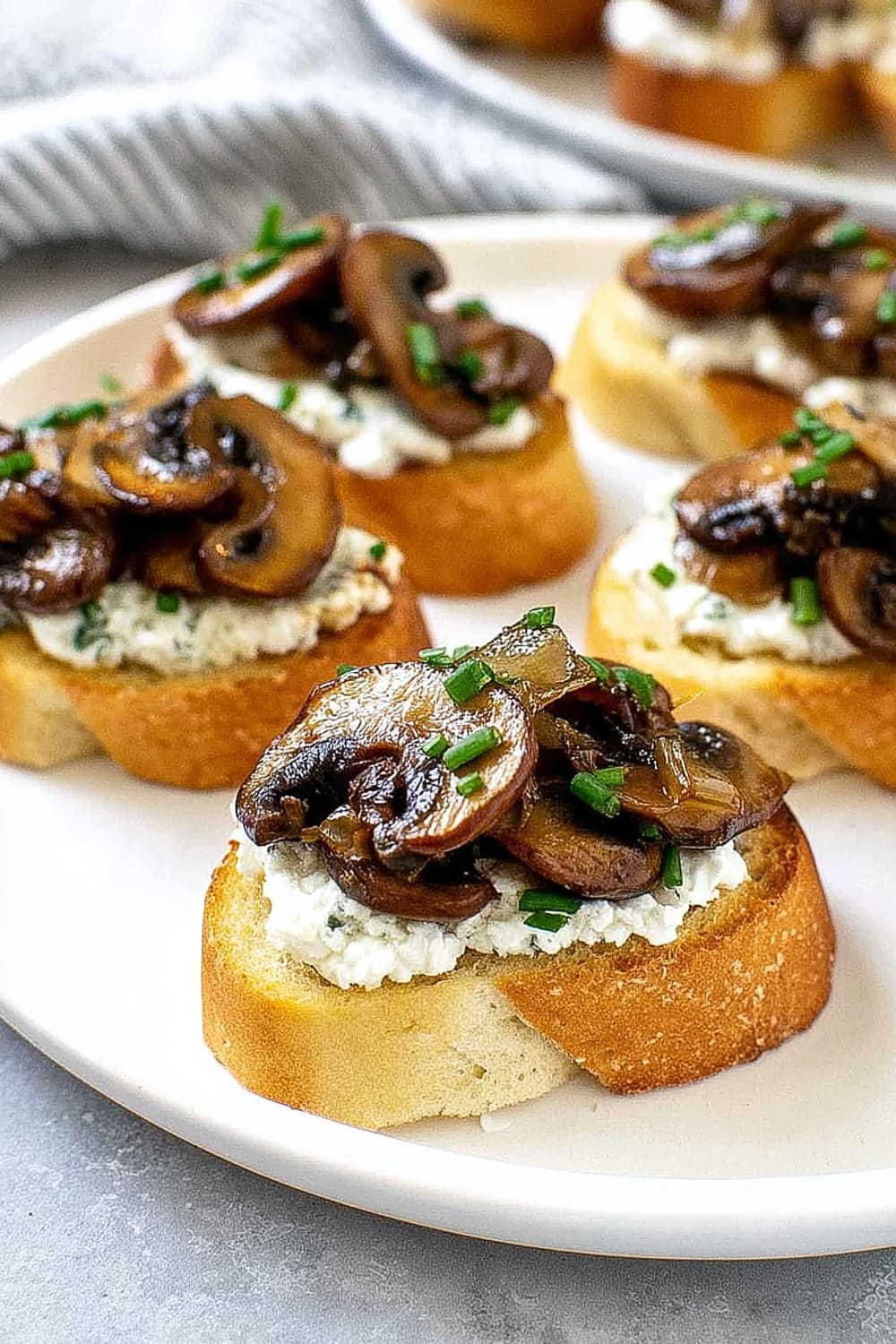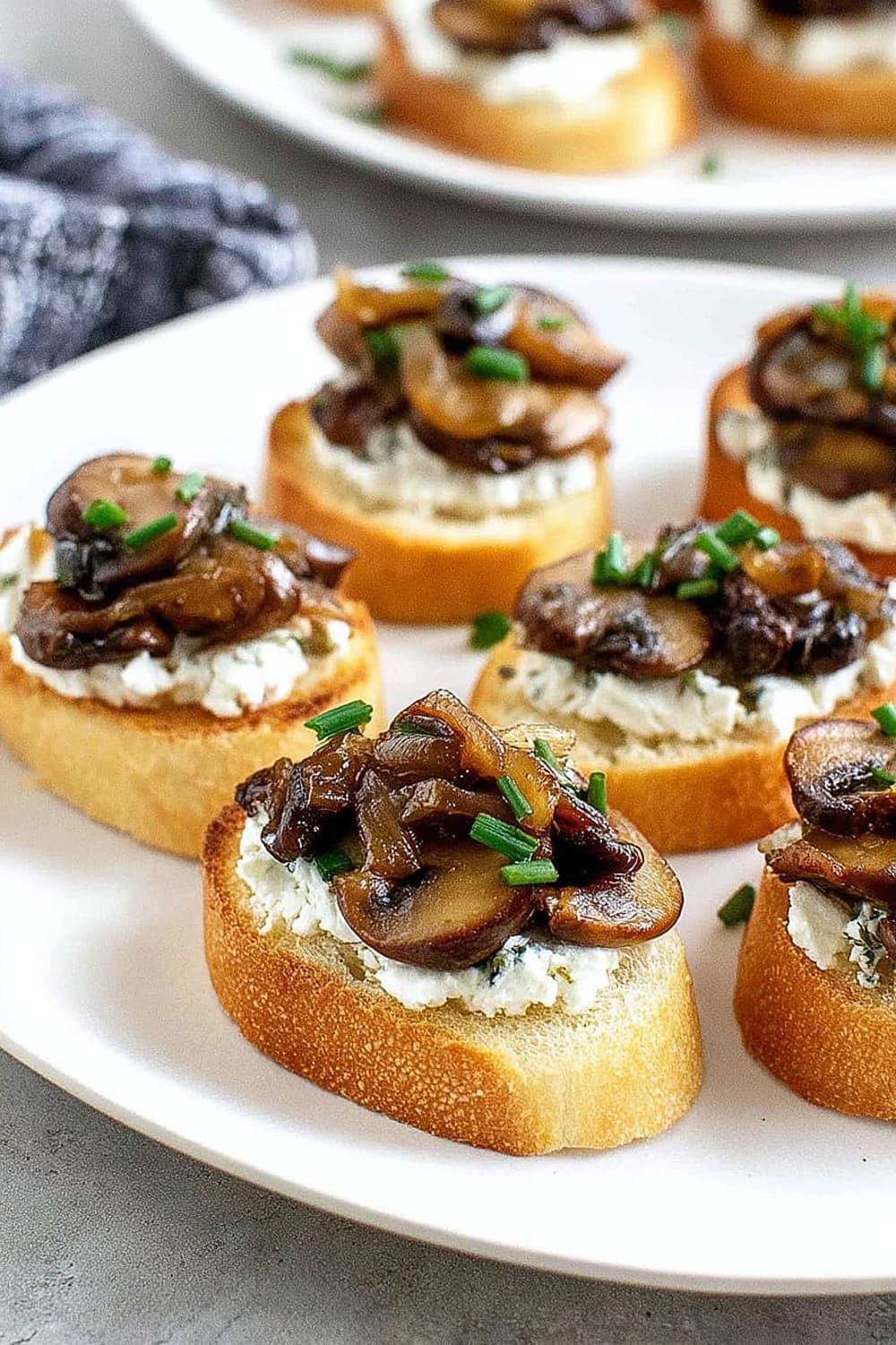 - 8 Using a butter knife or small offset spatula, spread about 2 teaspoons of the herbed goat cheese mixture over each toasted bread slice, creating an even layer that reaches the edges. Top each crostini with about 2 tablespoons of the caramelized onion and mushroom mixture, mounding it slightly in the center. Sprinkle with freshly cracked black pepper and additional chives for garnish. Arrange on a serving platter and serve immediately.