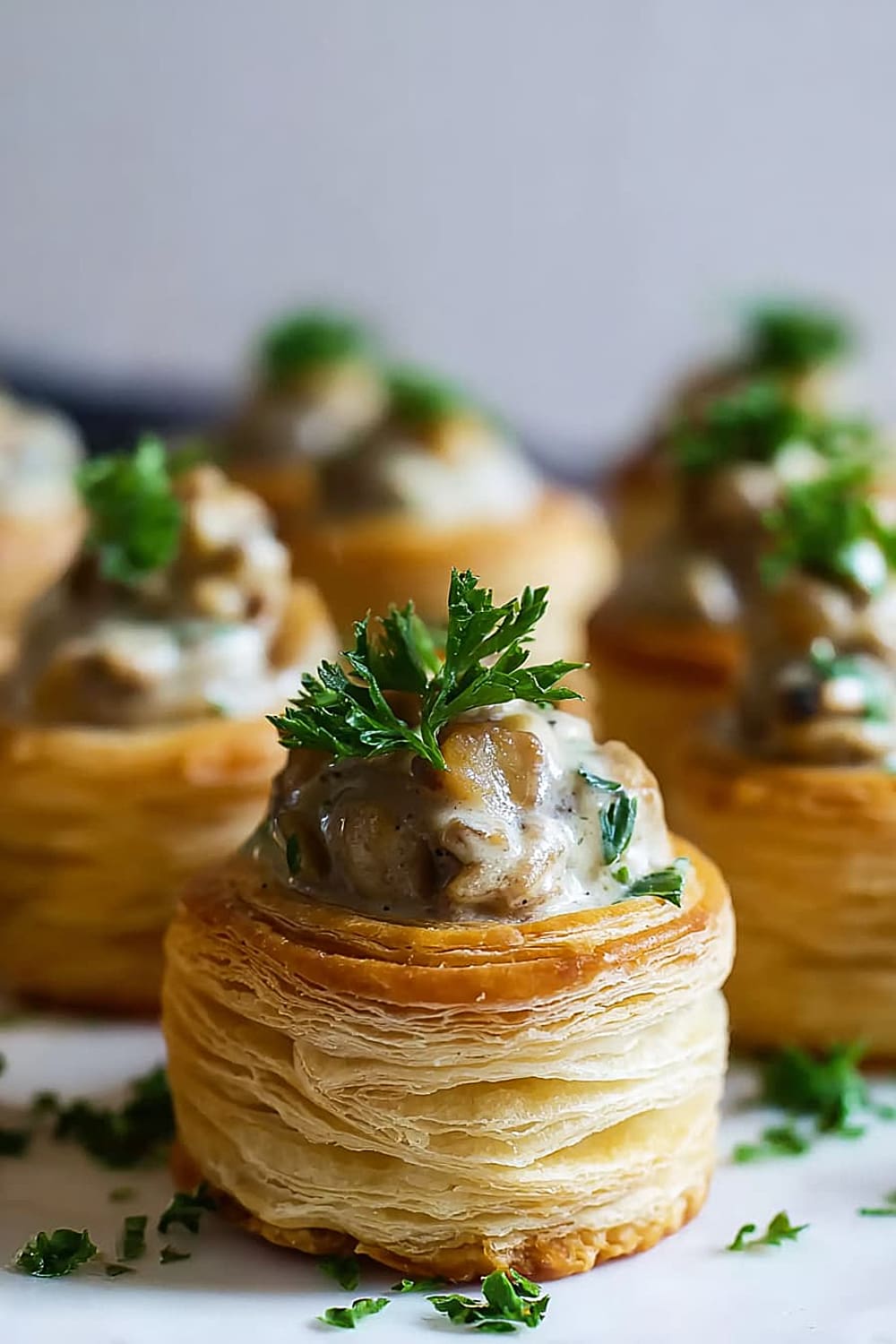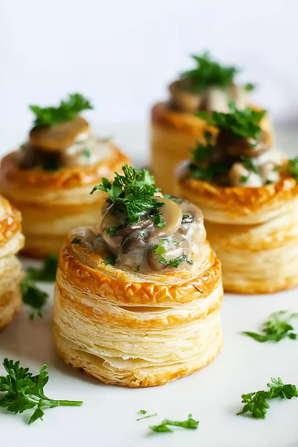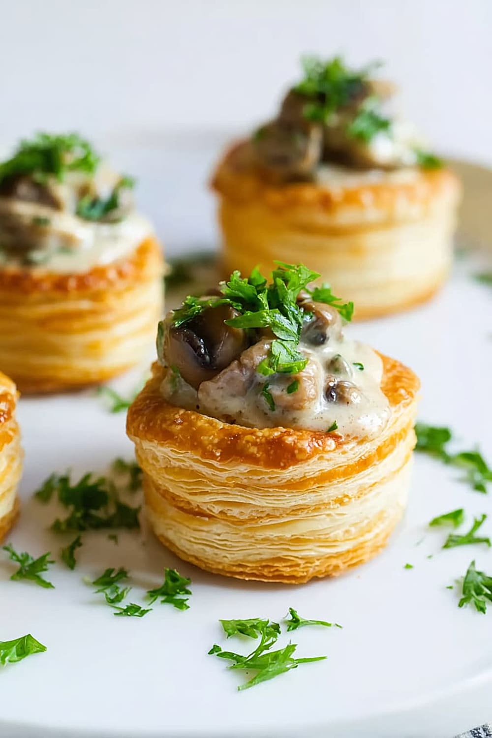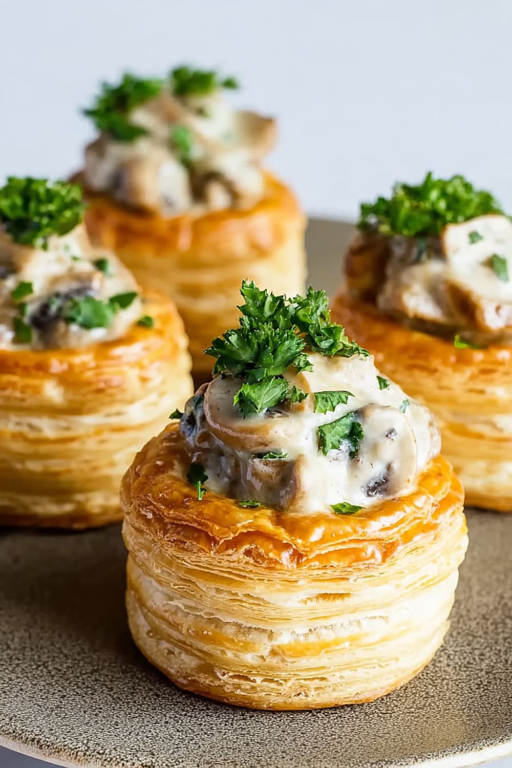 These elegant French pastries are pure magic – imagine buttery, flaky puff pastry shells that practically melt in your mouth, filled with the most luxurious creamy mushroom mixture that’s bursting with earthy, savory goodness.