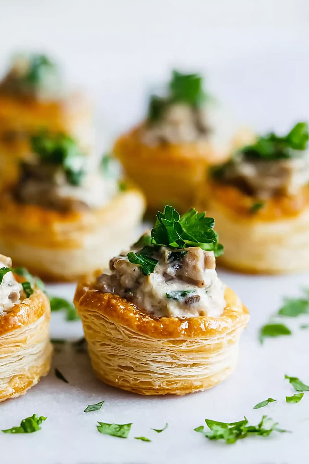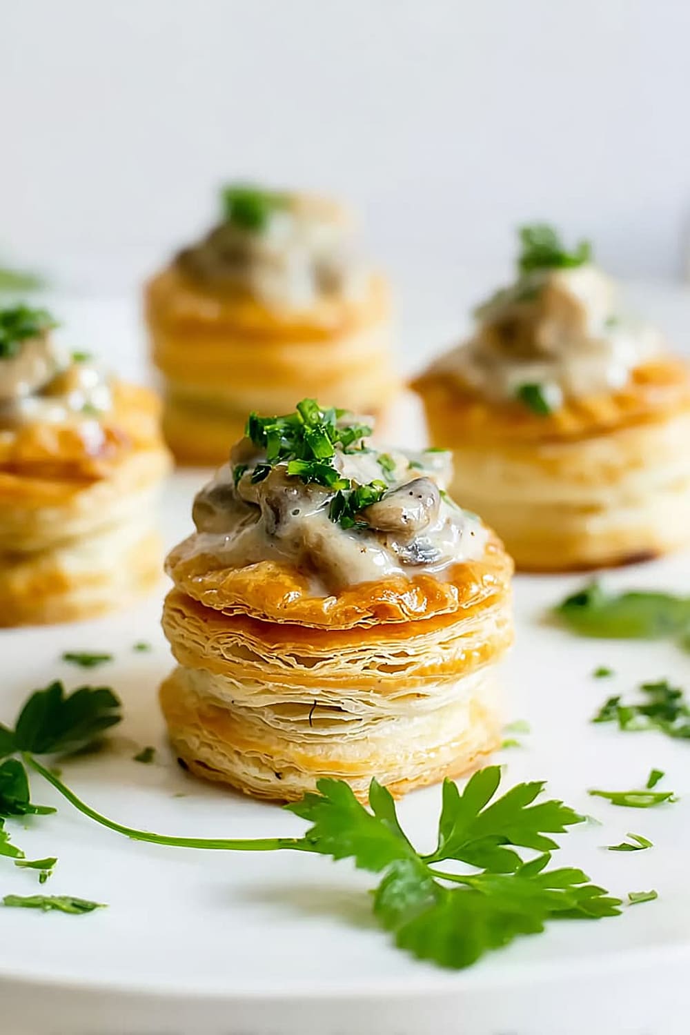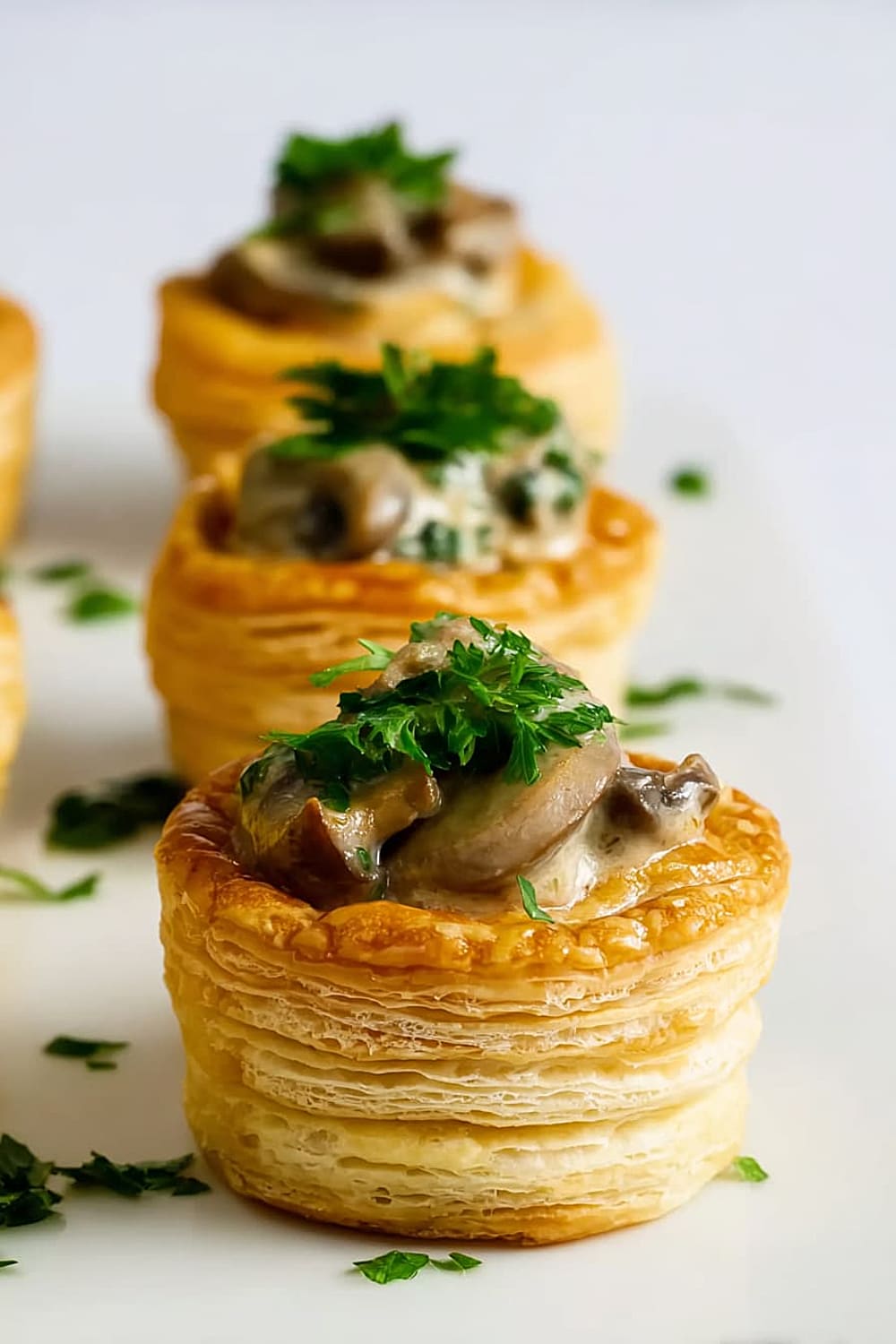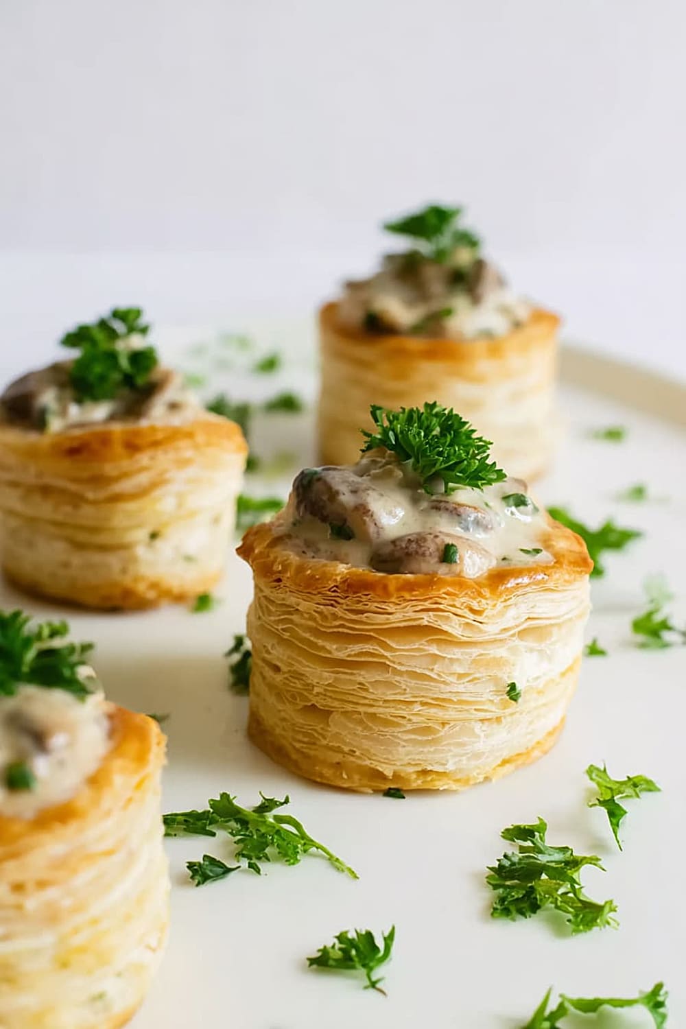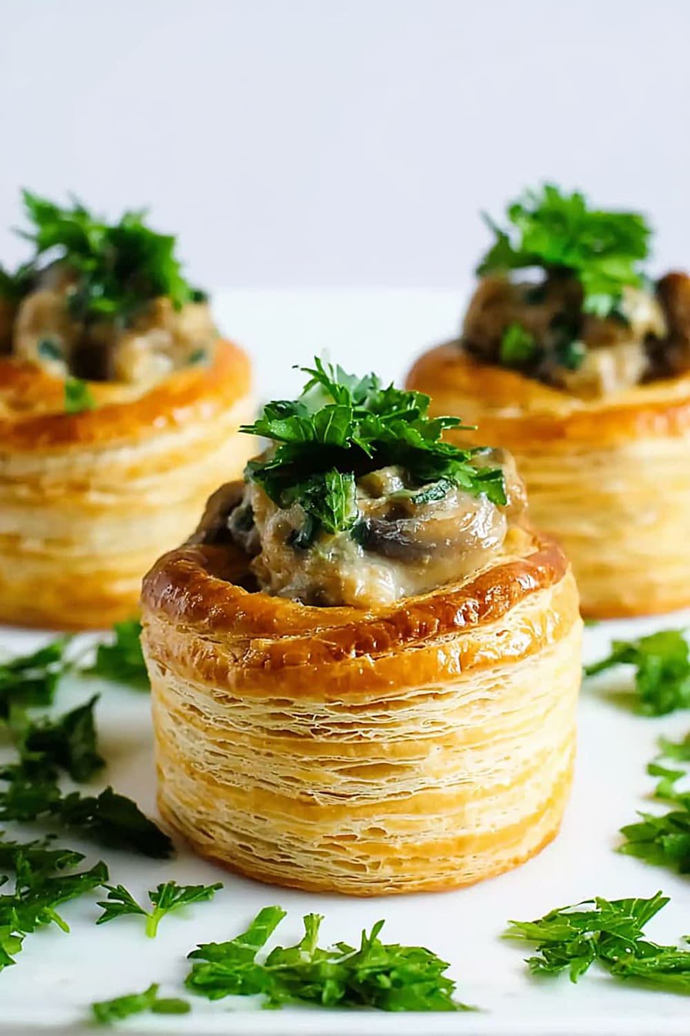 Start with these vol au vents, follow with herb-crusted salmon and lemon rice pilaf for an elegant dinner party. For casual entertaining, pair with tomato basil soup and mixed green salad for a satisfying lunch. During holidays, serve as appetizers before roast chicken with seasonal vegetables and wild rice stuffing.