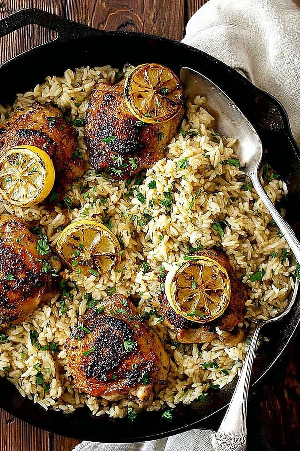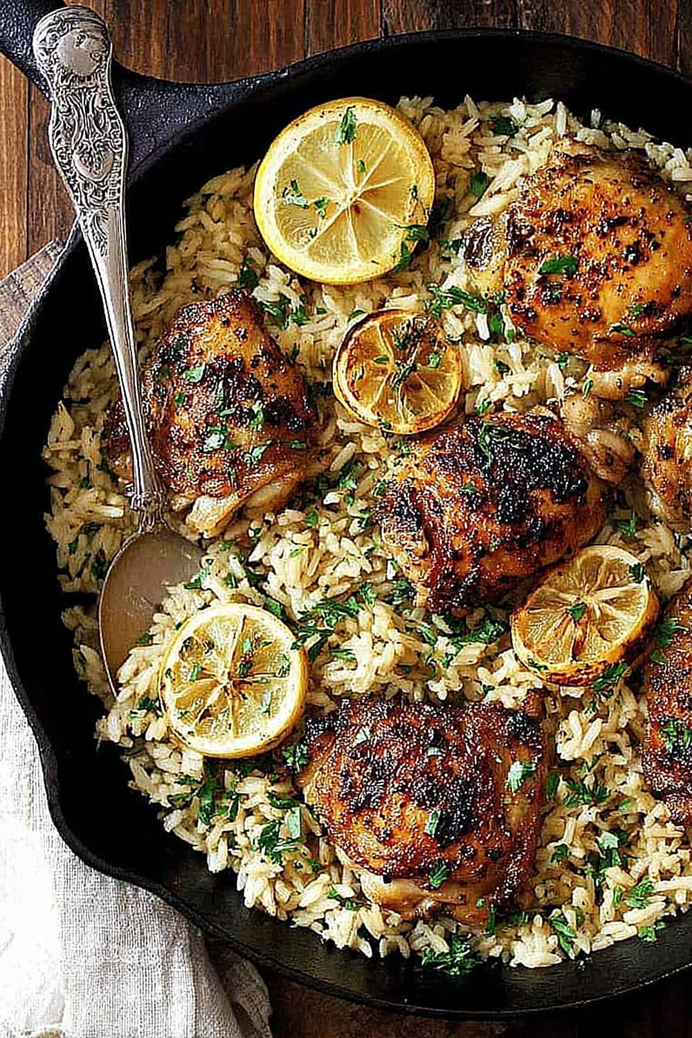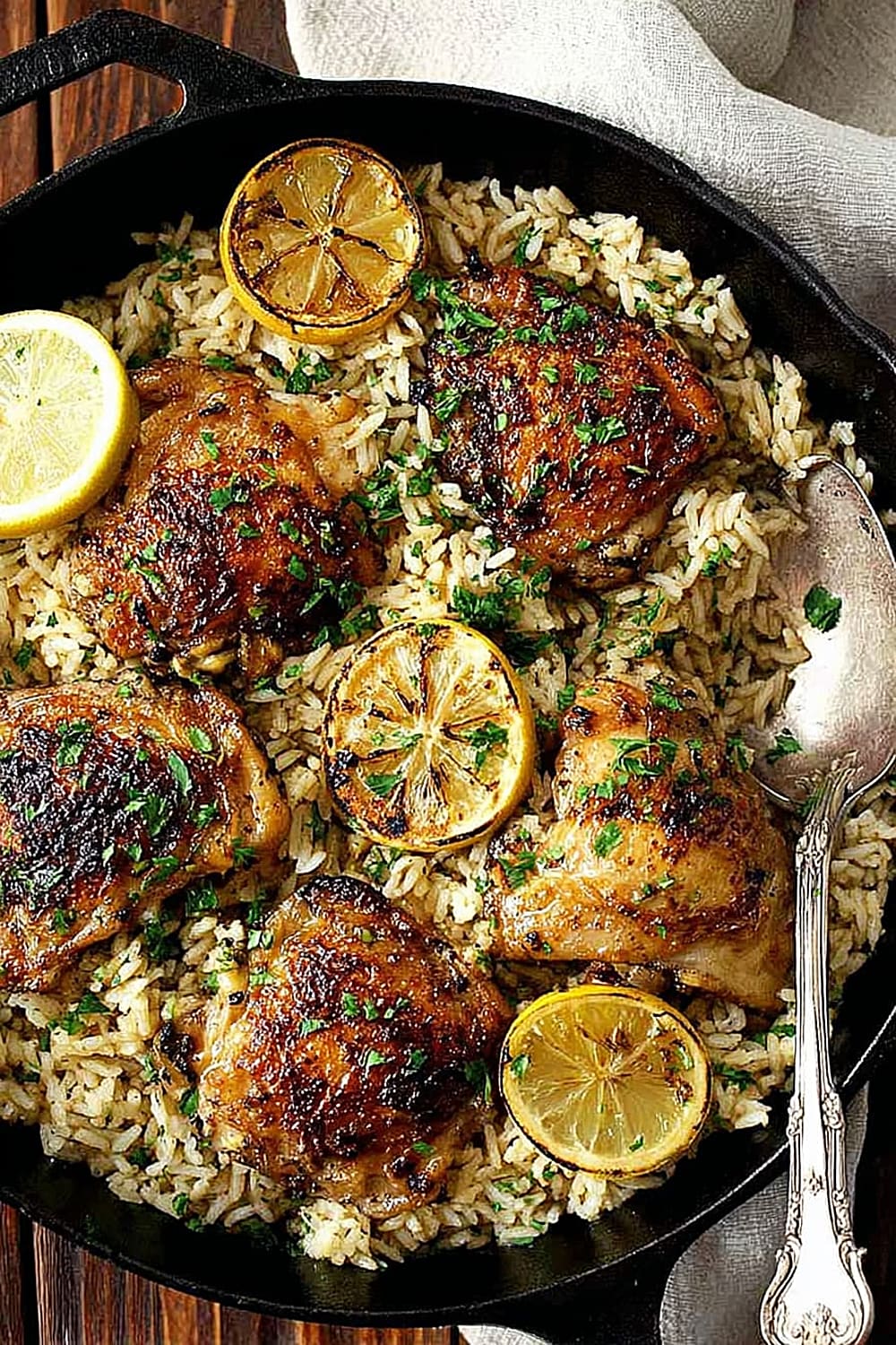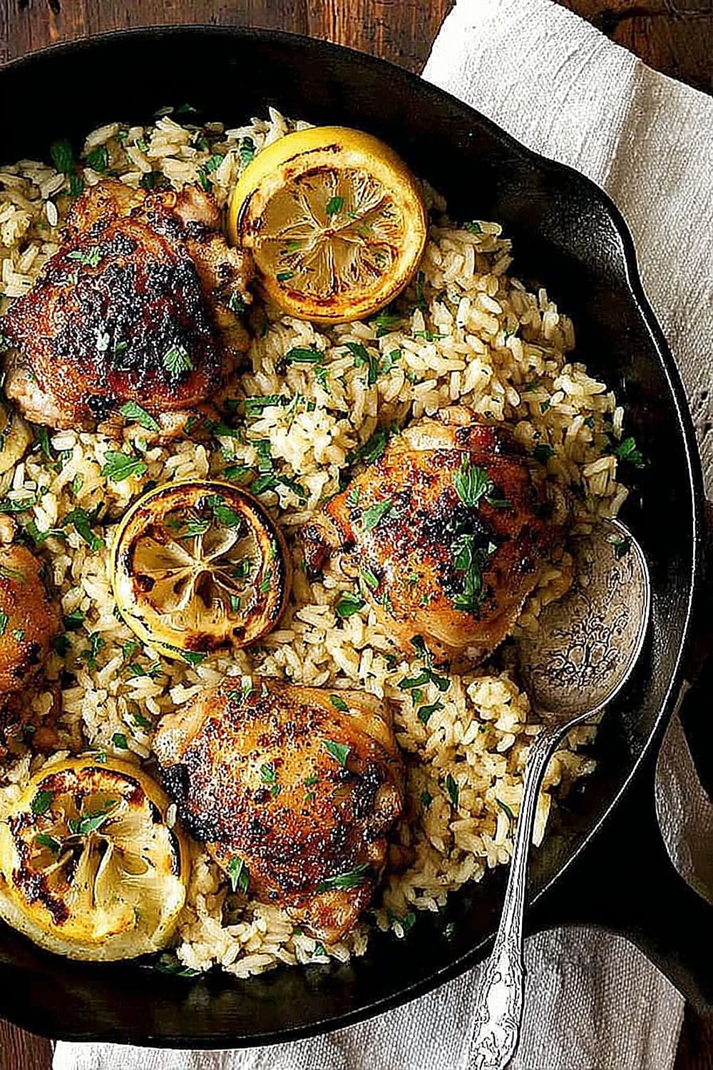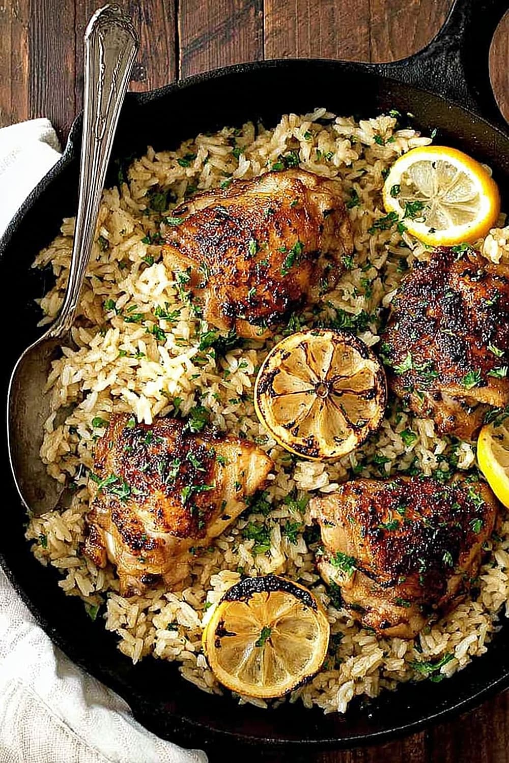 Picture this: golden-brown chicken thighs nestled on top of perfectly seasoned rice that’s been soaking up all those incredible Mediterranean flavors while everything cooks together in beautiful harmony.