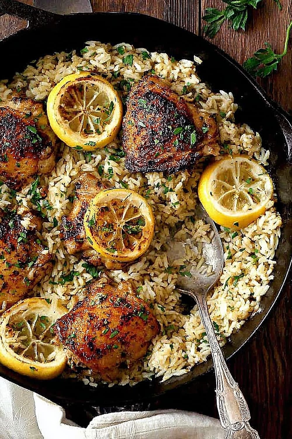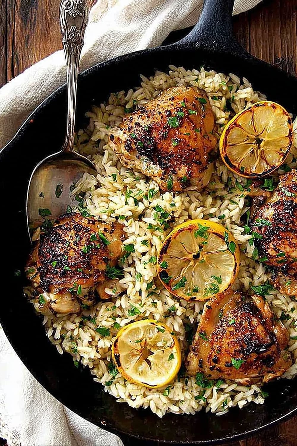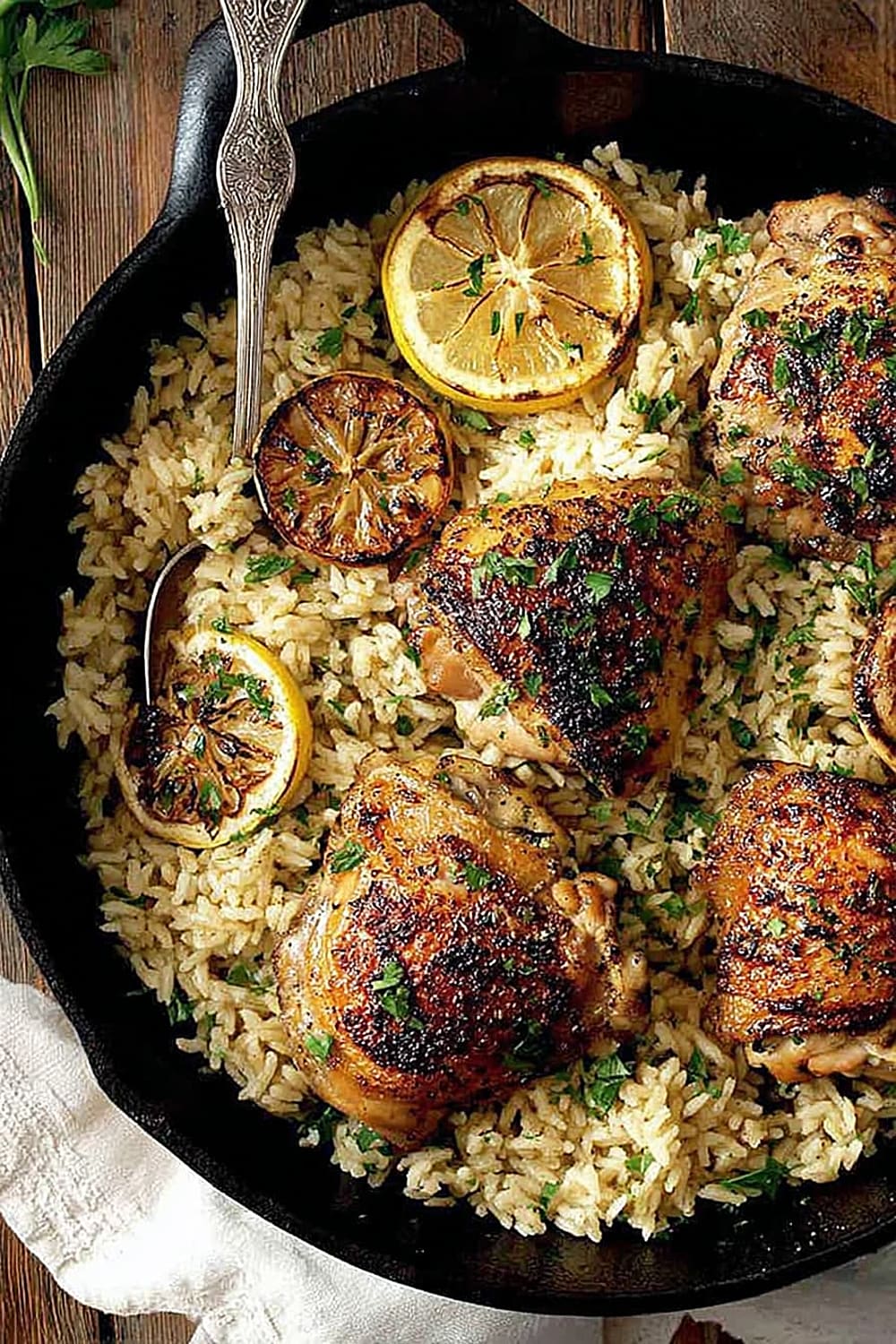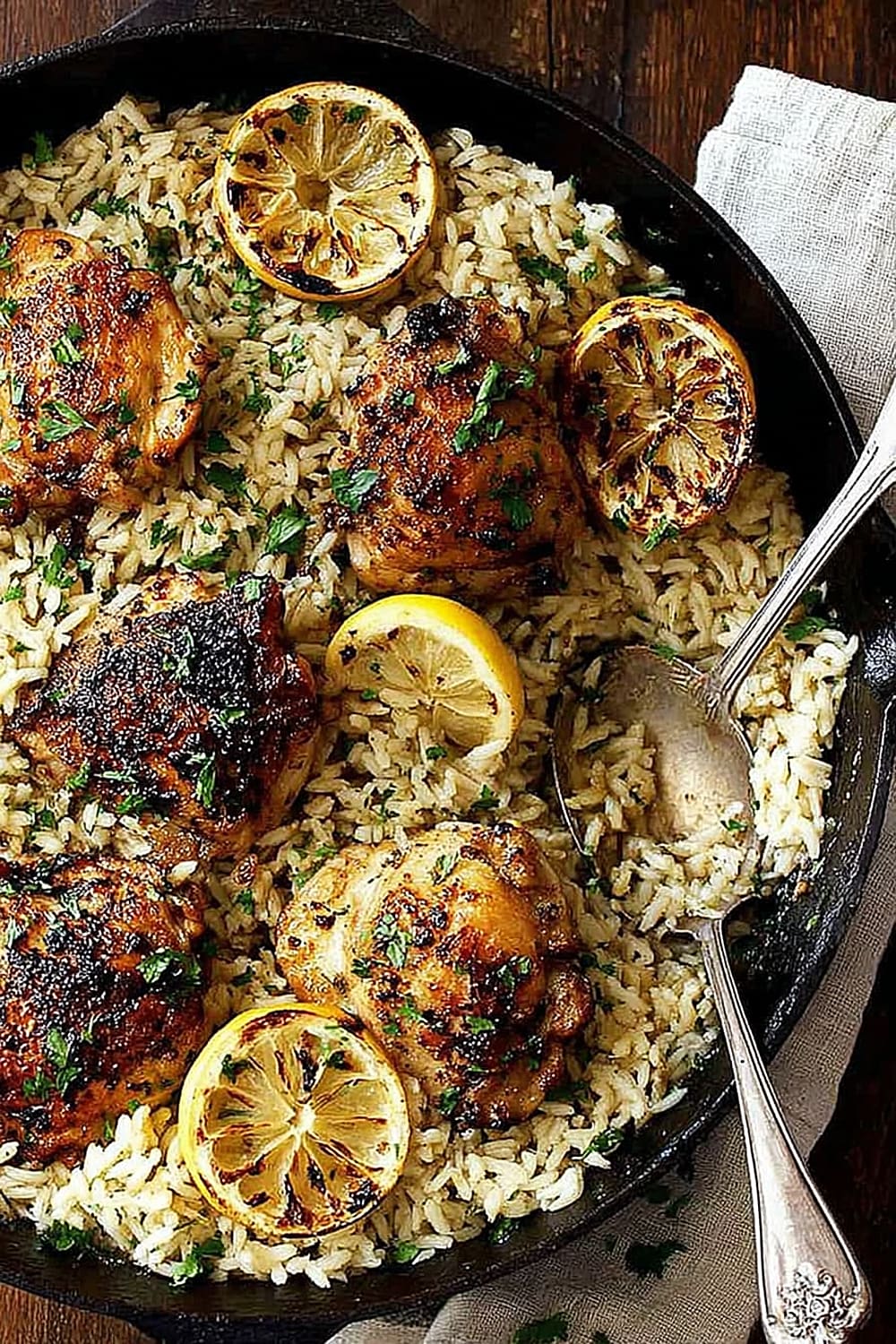 Picture this: golden-brown chicken thighs nestled on top of perfectly seasoned rice that’s been soaking up all those incredible Mediterranean flavors while everything cooks together in beautiful harmony.