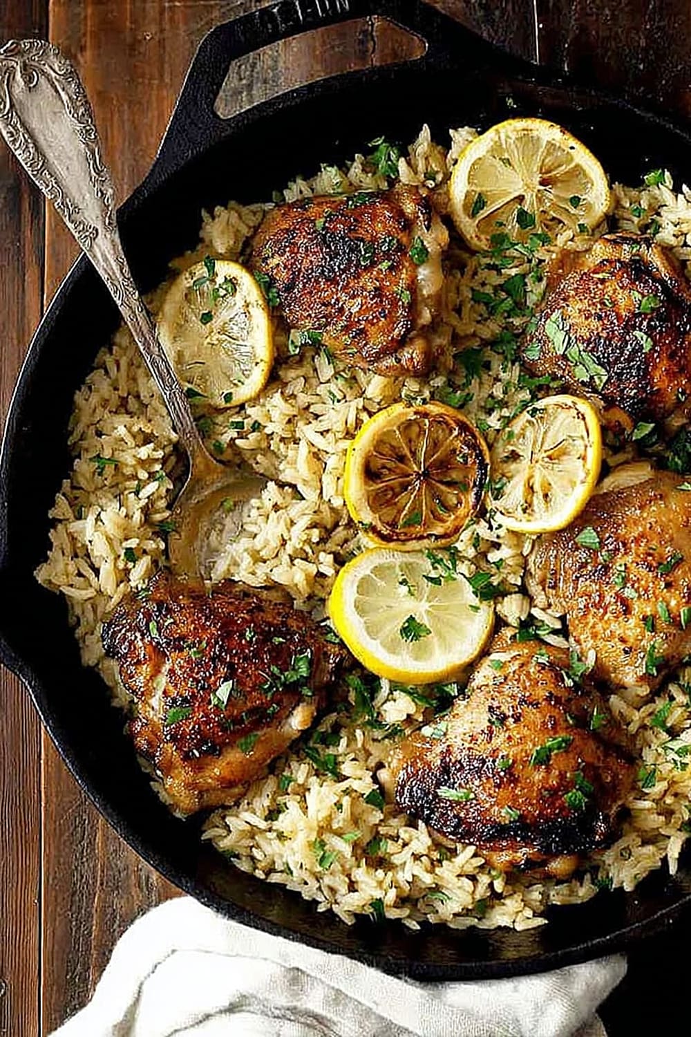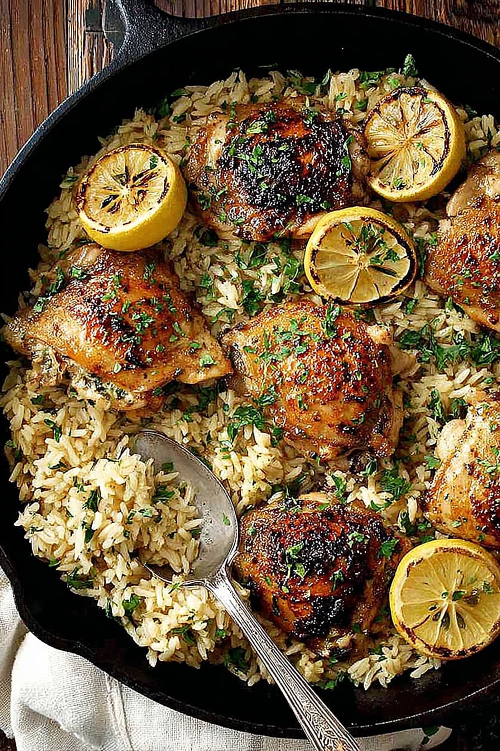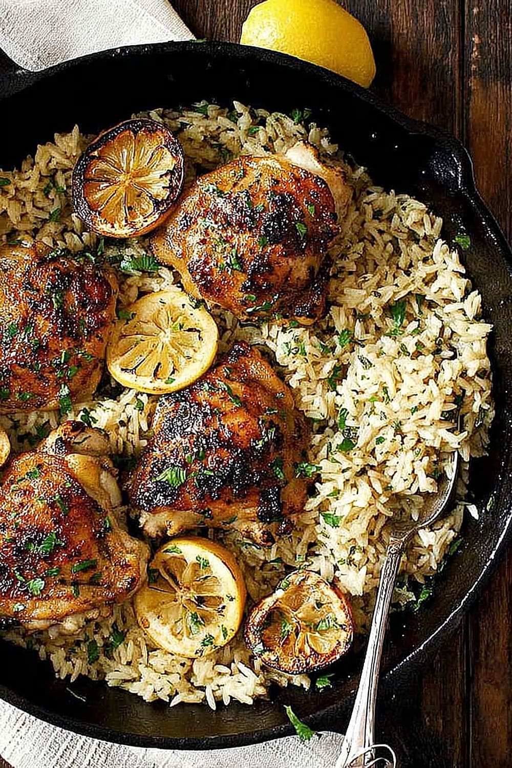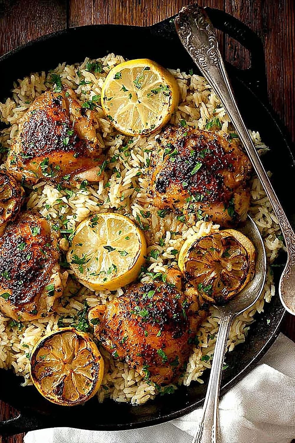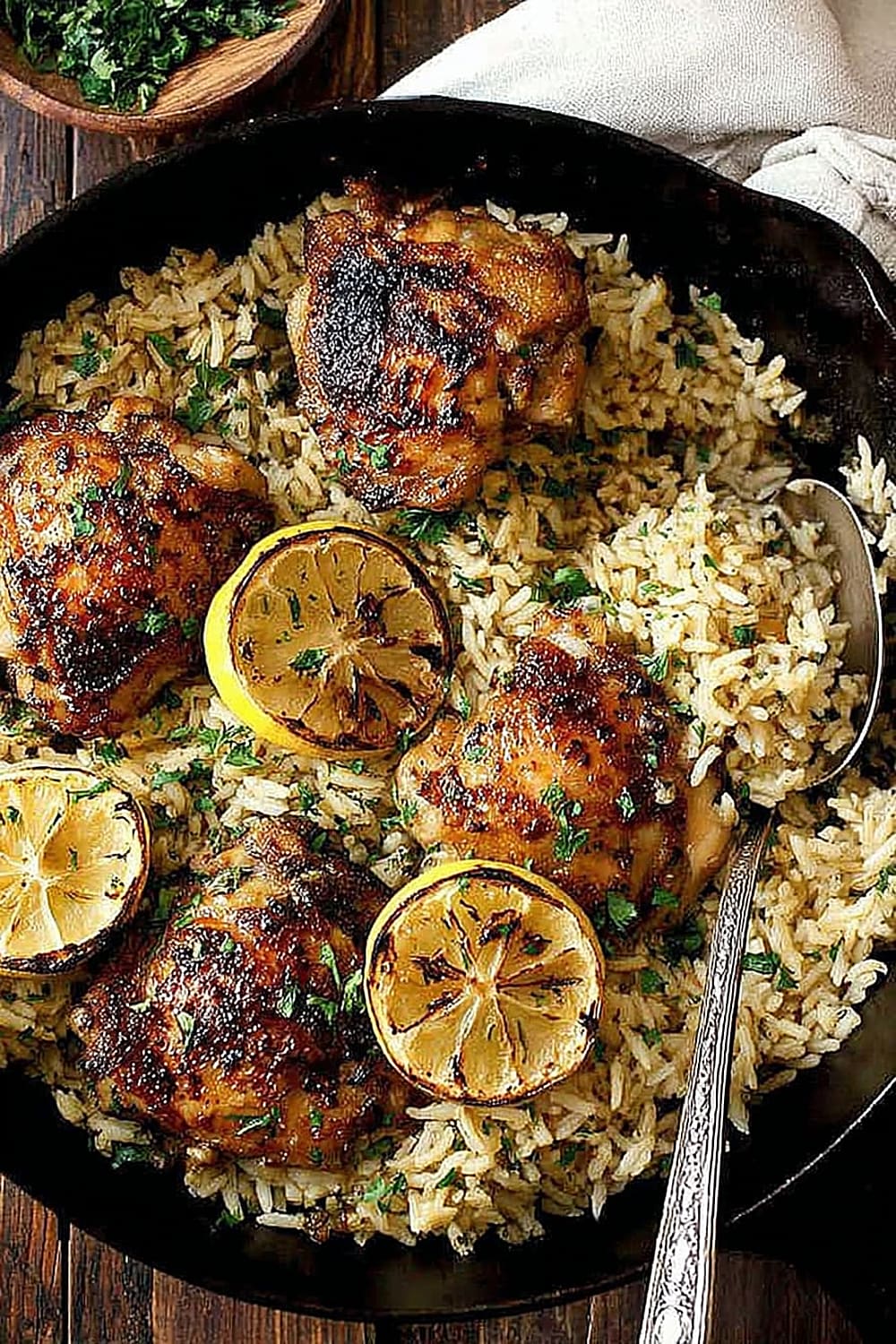 Picture this: golden-brown chicken thighs nestled on top of perfectly seasoned rice that’s been soaking up all those incredible Mediterranean flavors while everything cooks together in beautiful harmony.