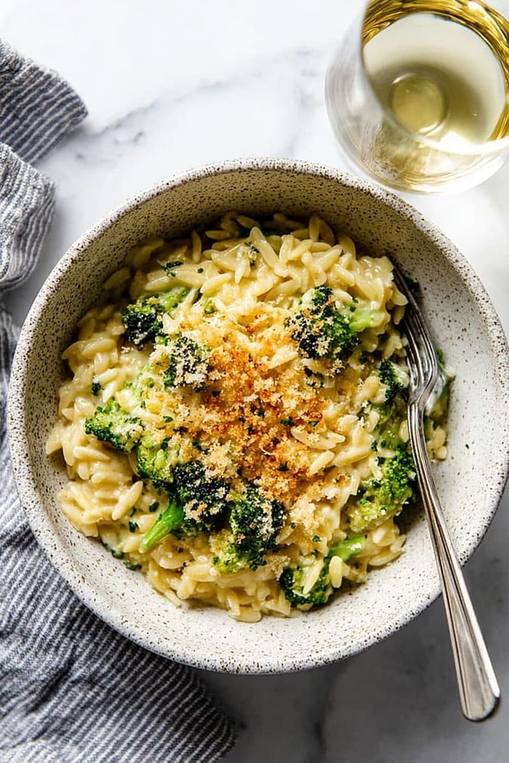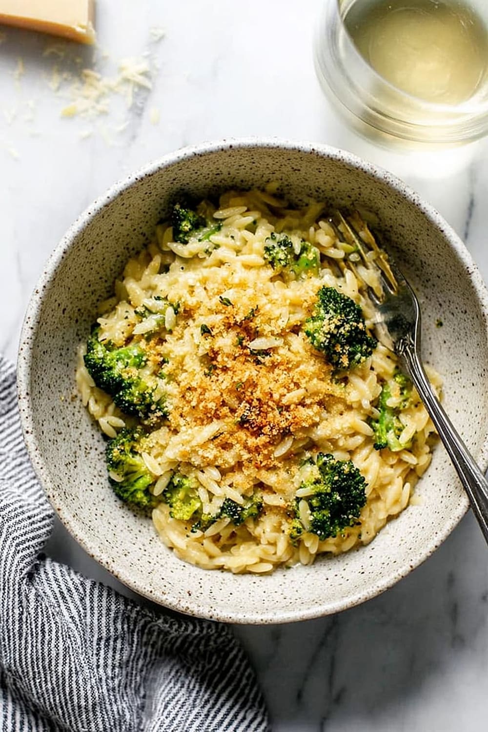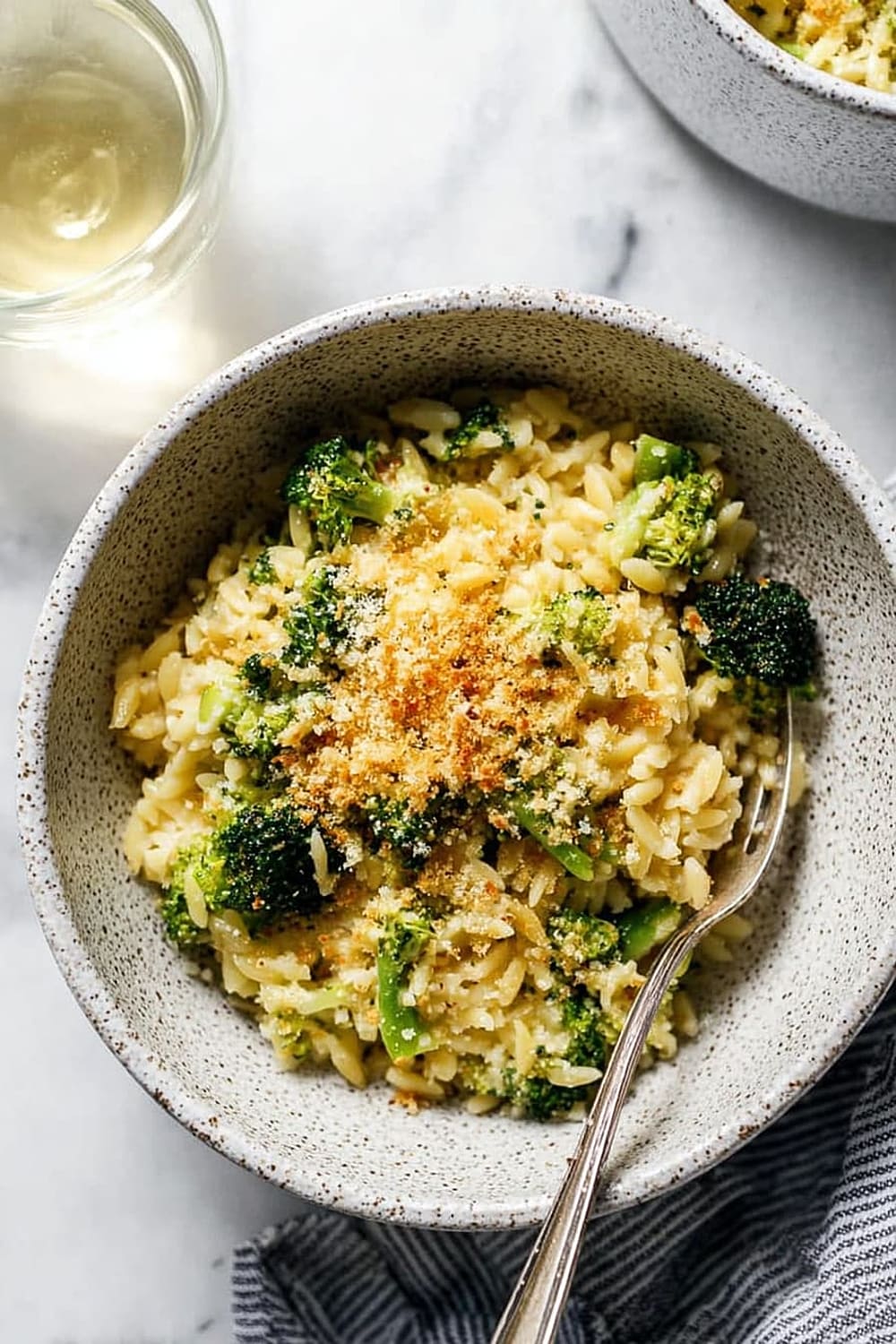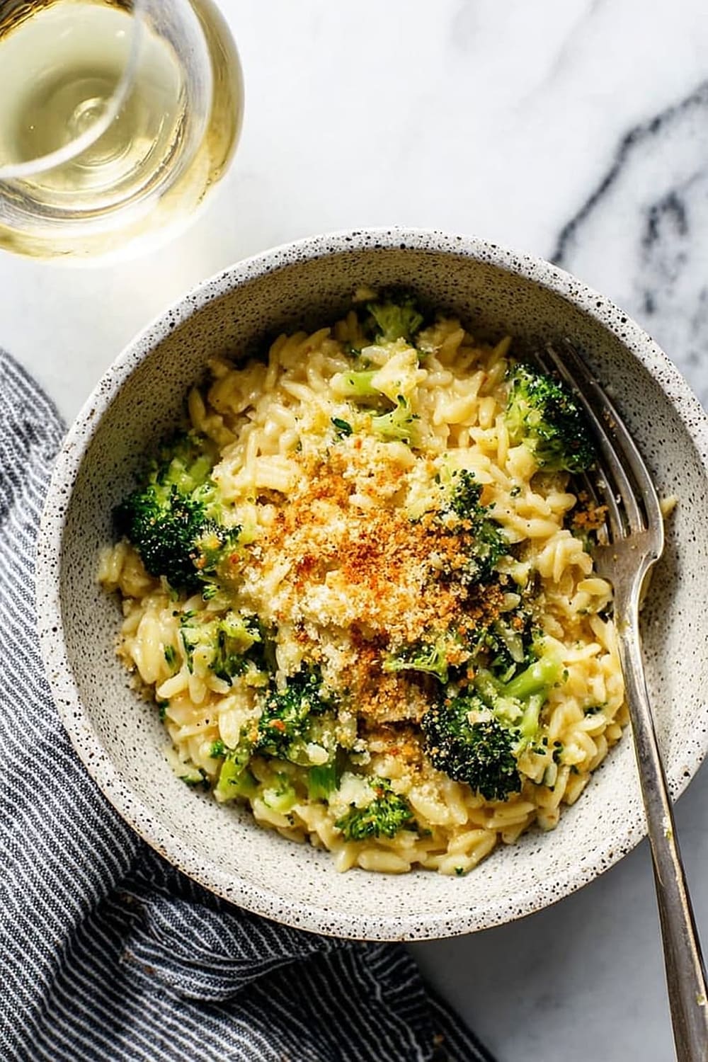 Picture this: creamy, cheesy orzo that cooks directly in a rich, garlicky broth while tender broccoli florets steam to perfection right alongside it.