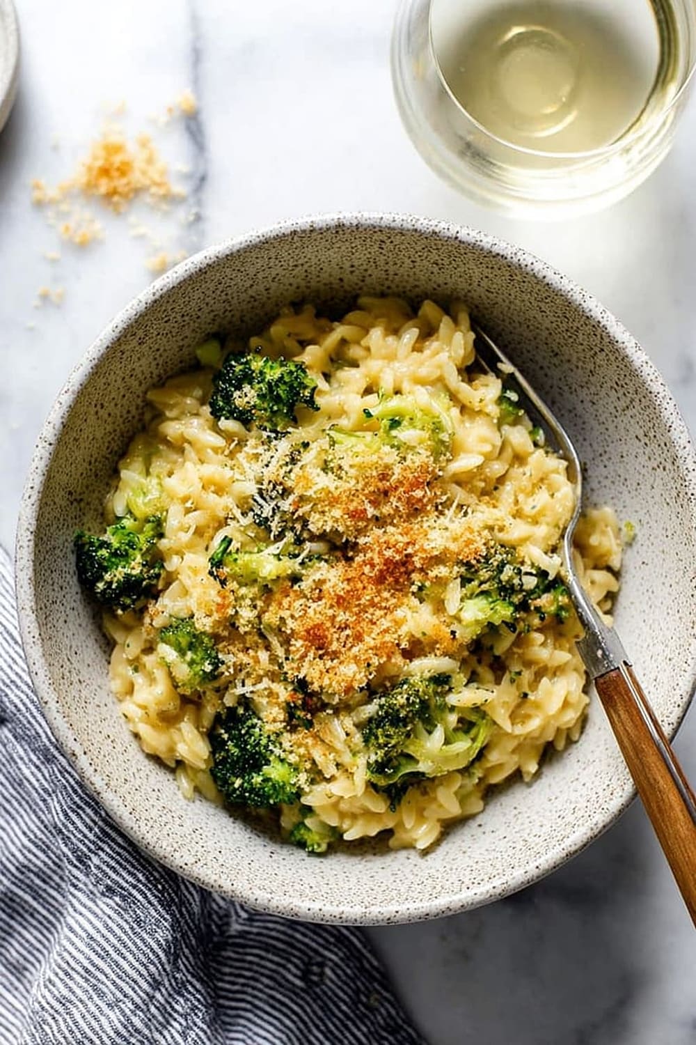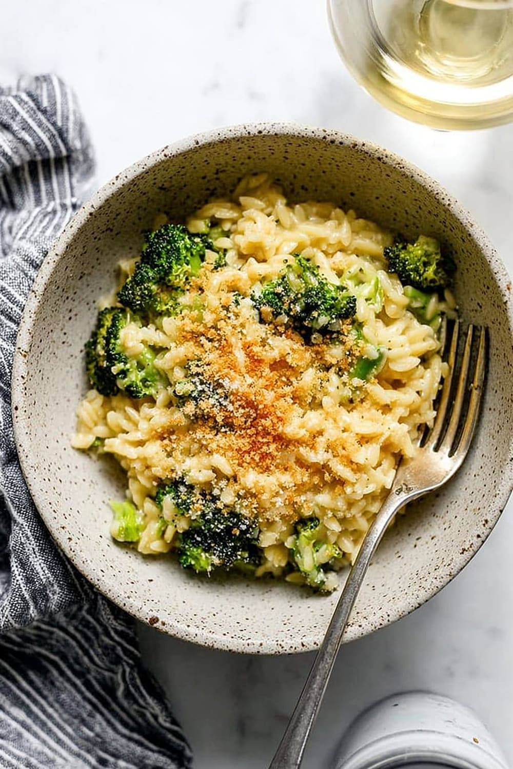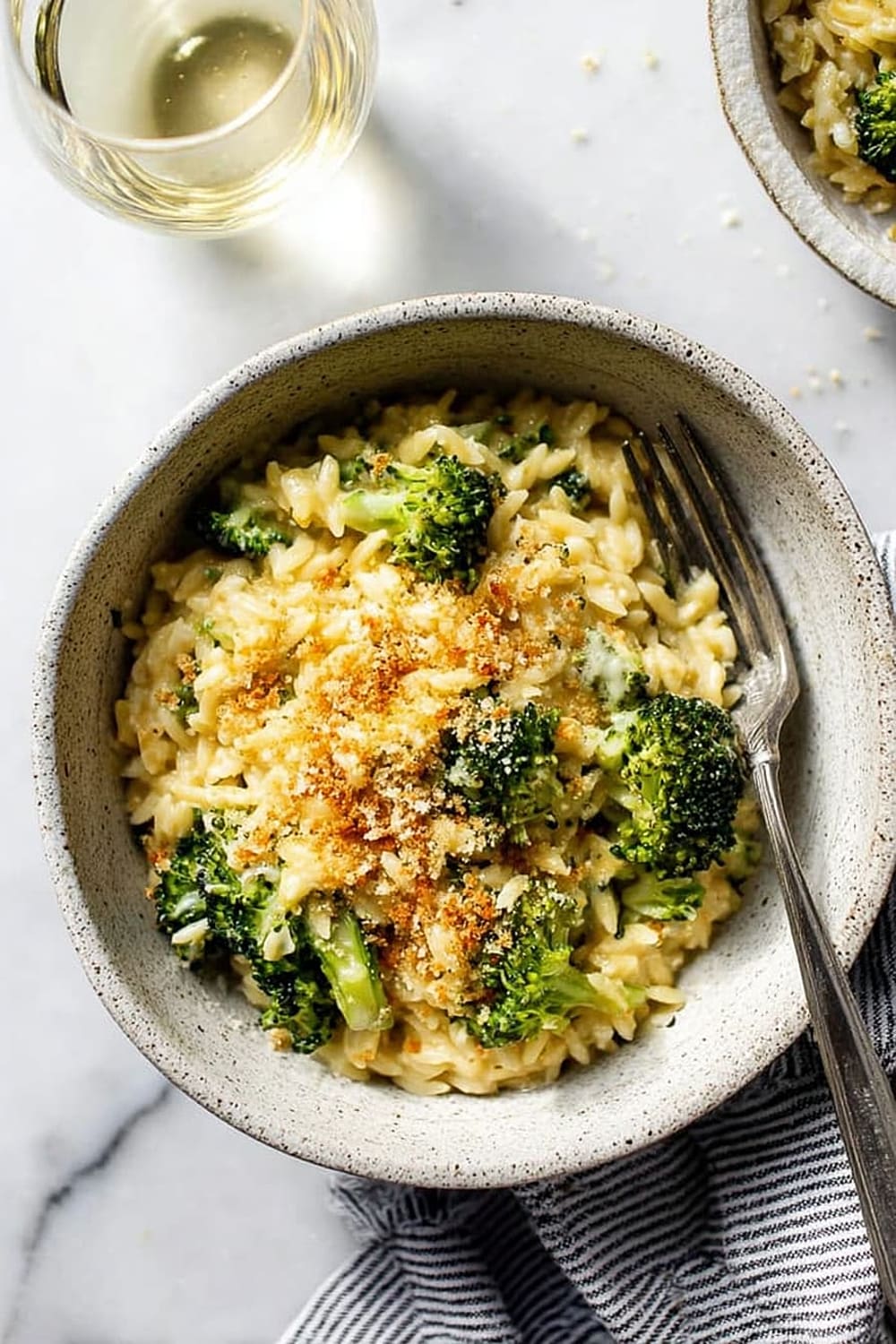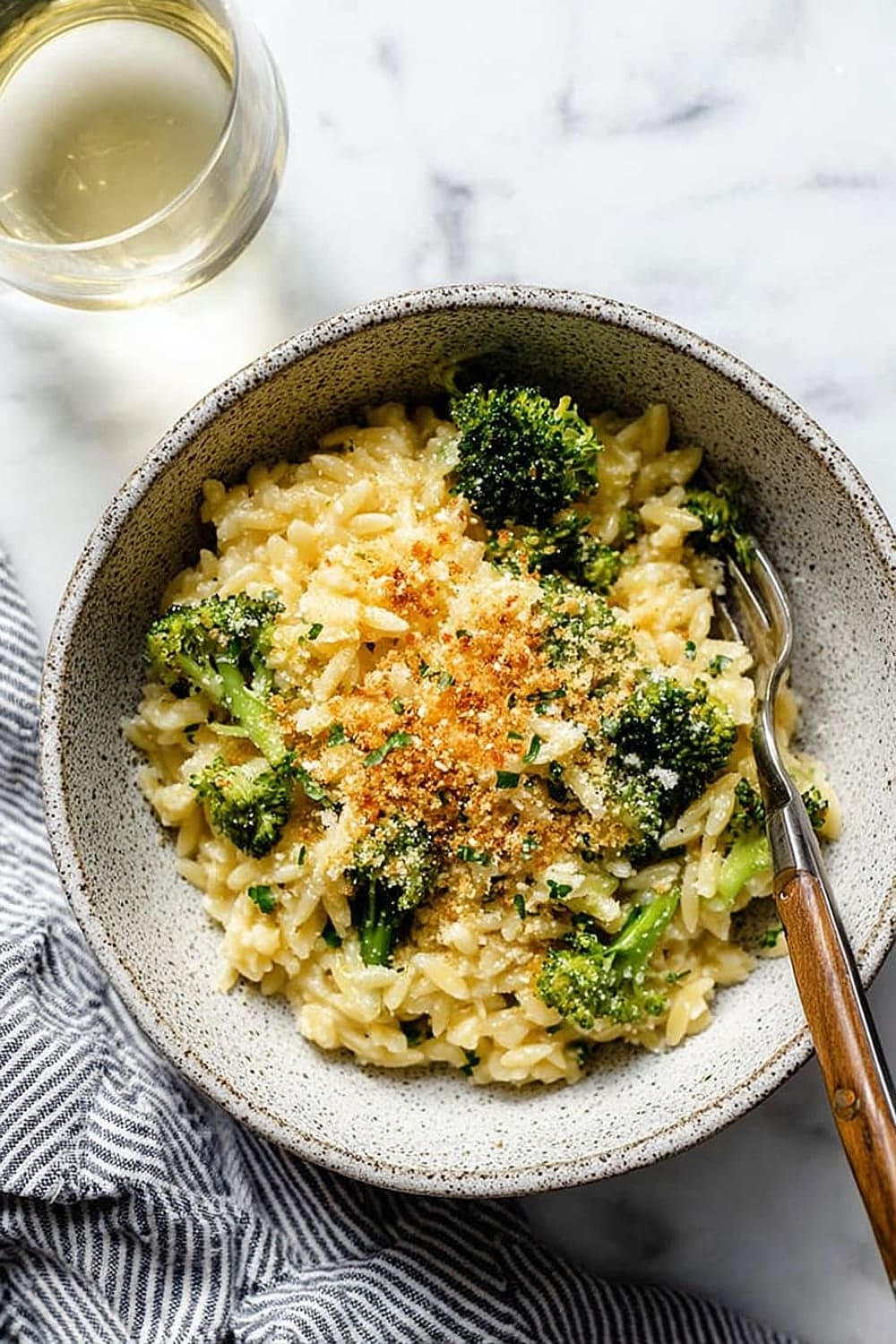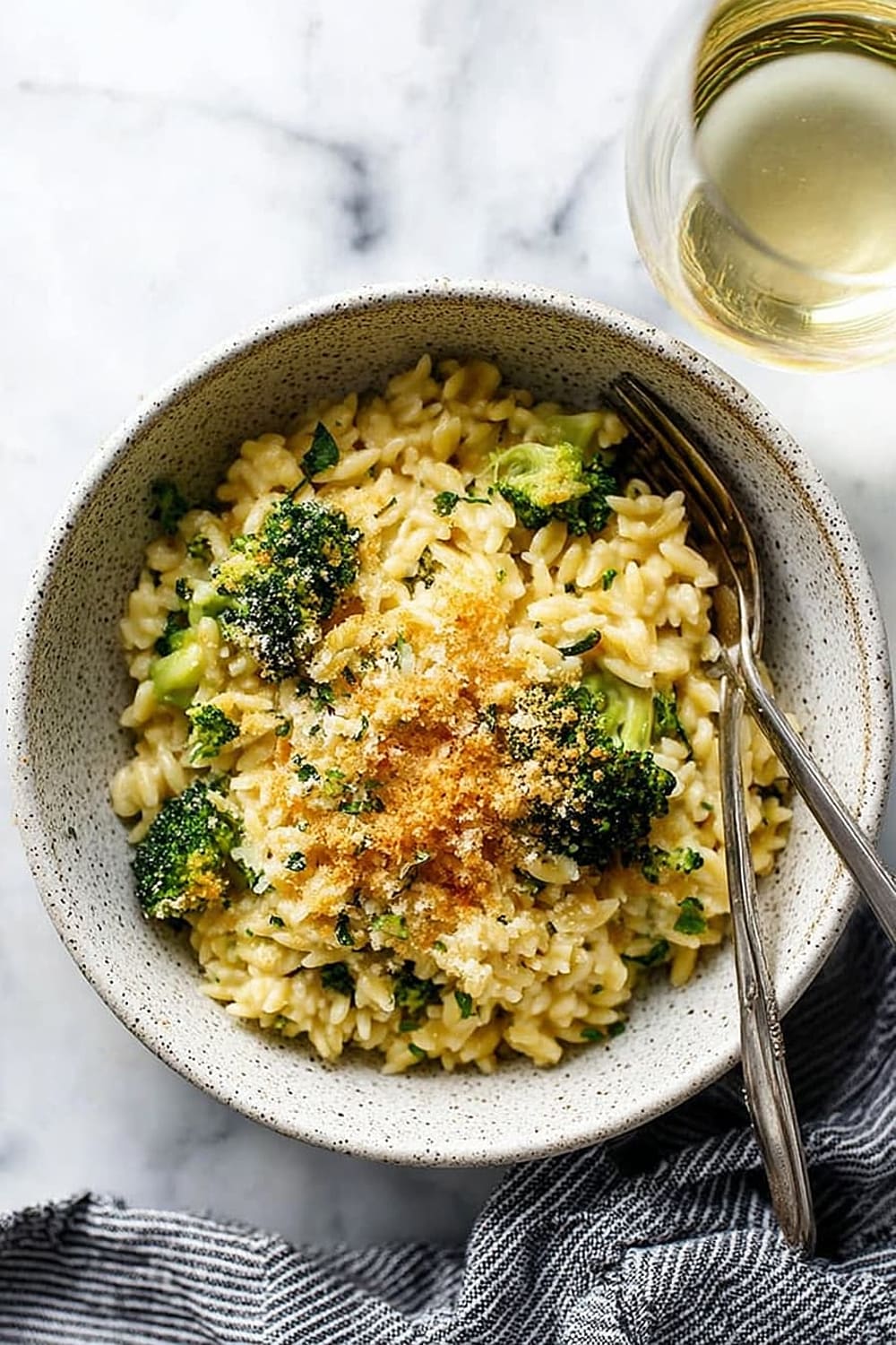 Picture this: creamy, cheesy orzo that cooks directly in a rich, garlicky broth while tender broccoli florets steam to perfection right alongside it.