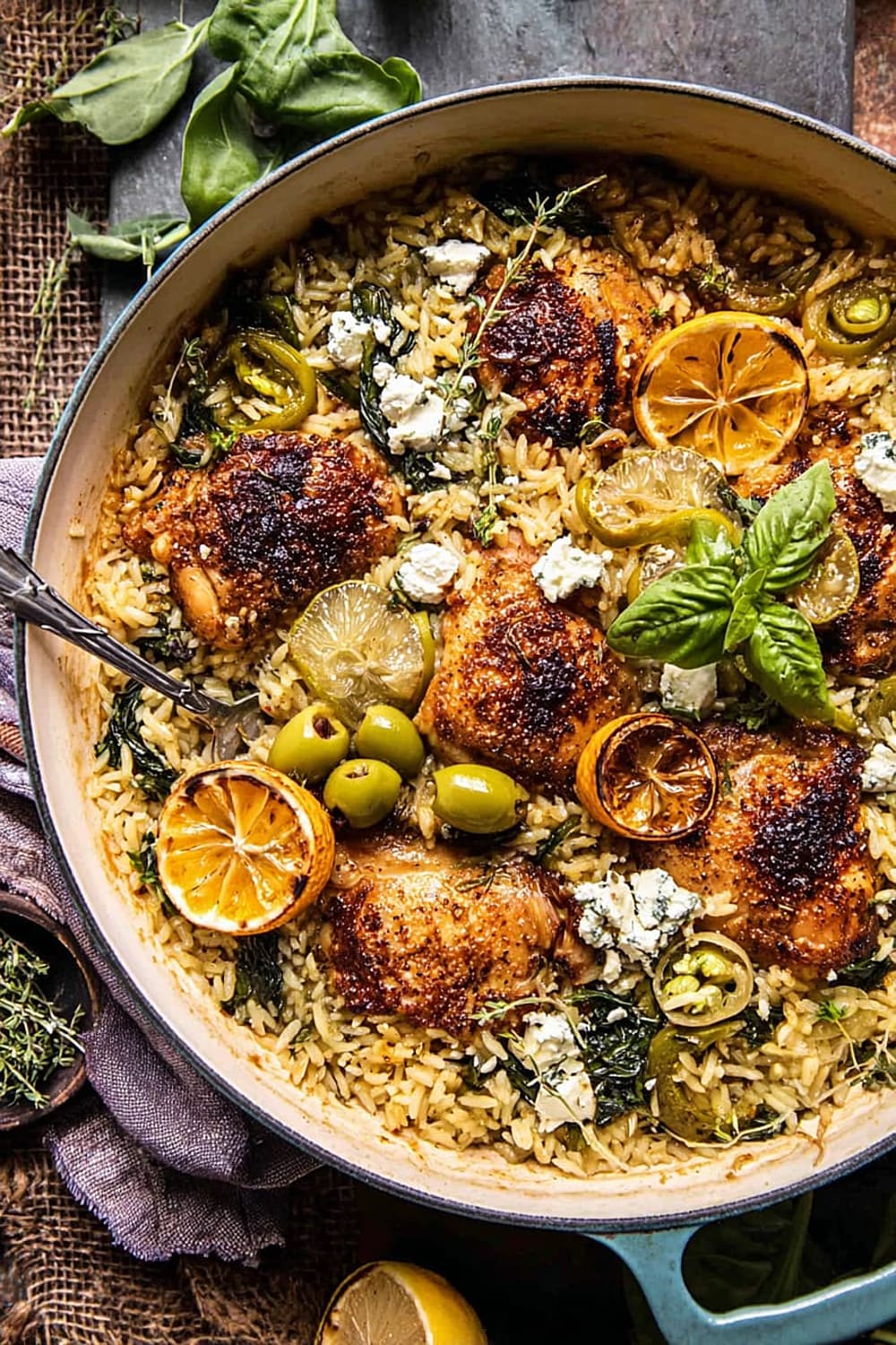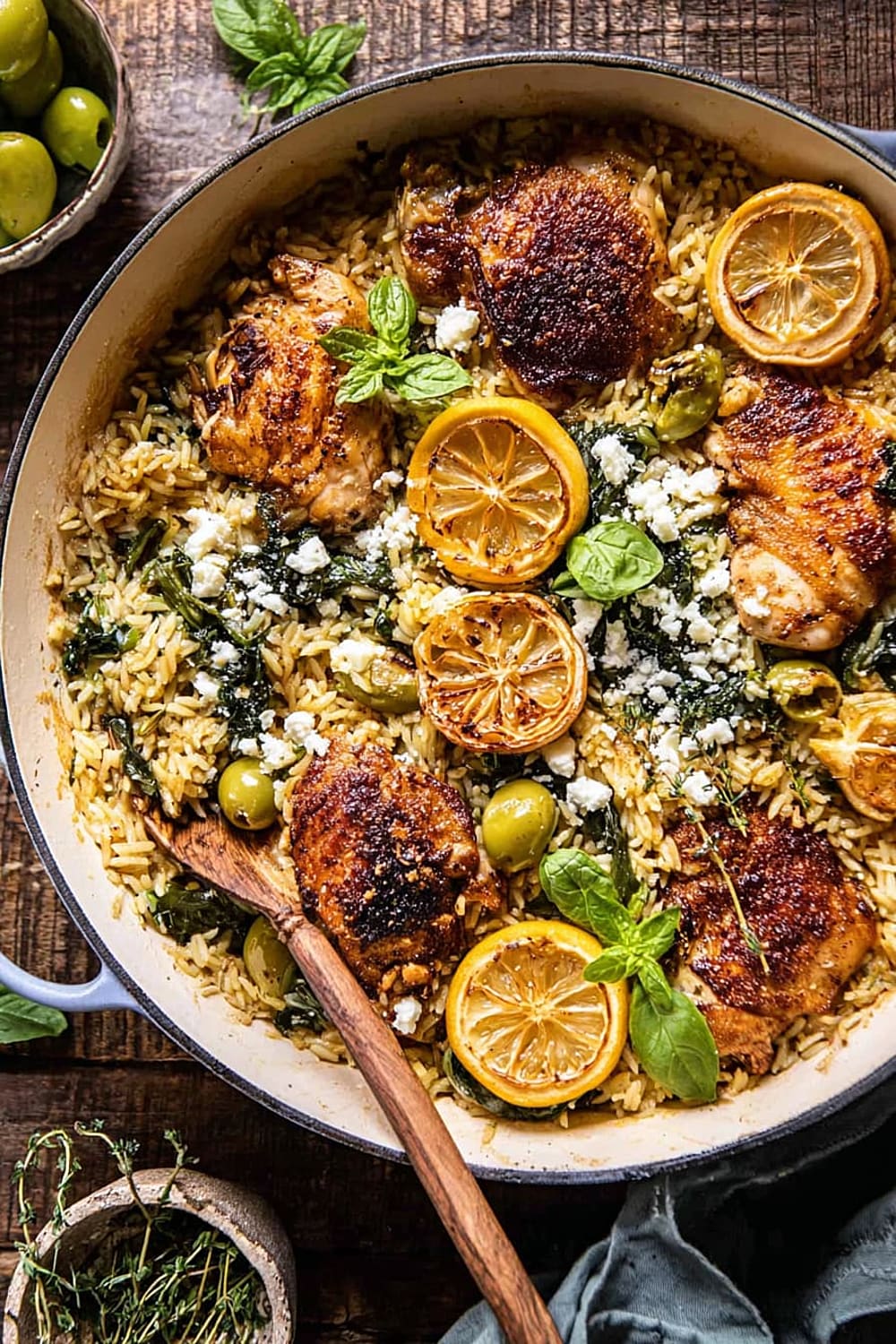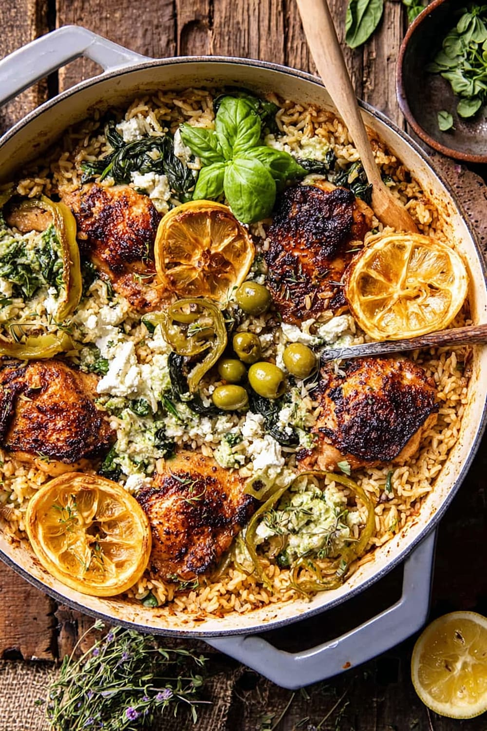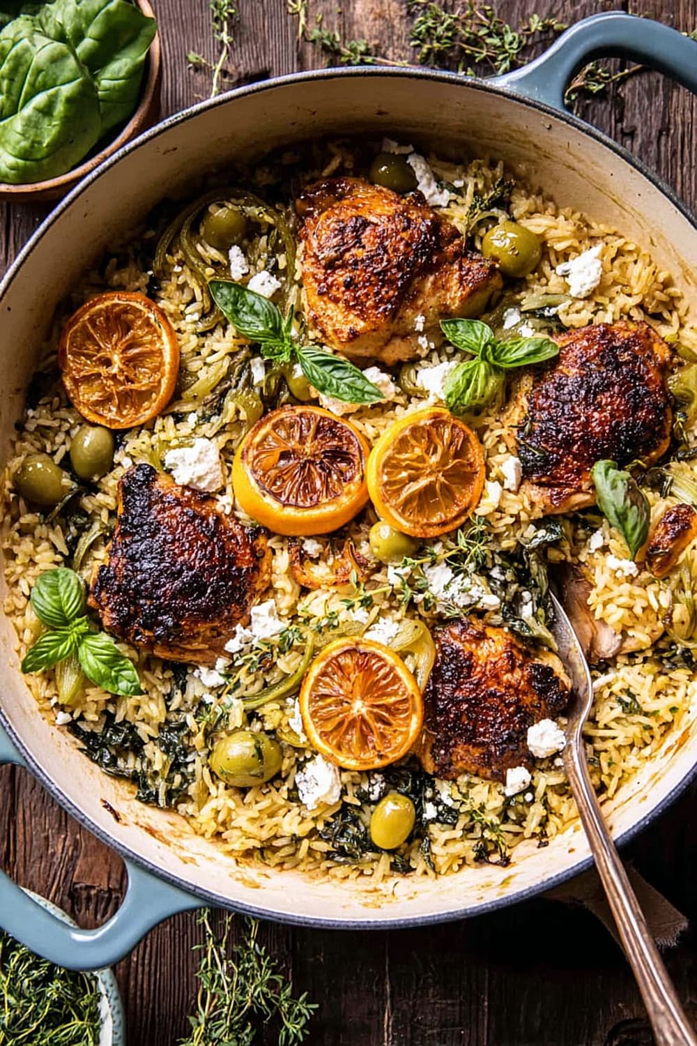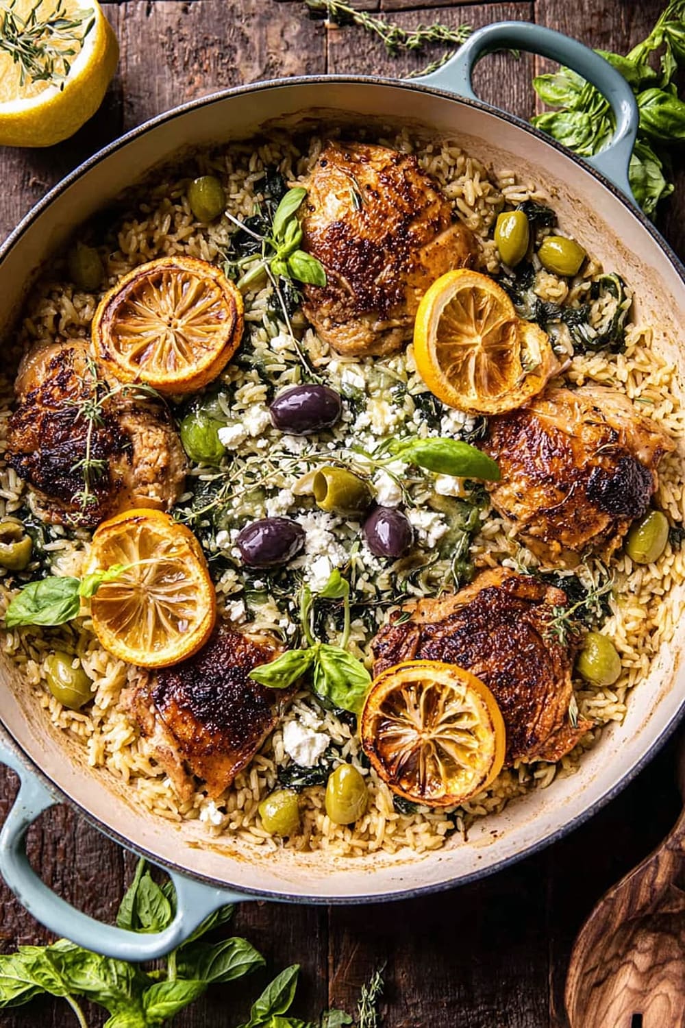Picture this: golden chicken nestled in a bed of perfectly seasoned rice, with bright lemon slices caramelized to perfection and feta cheese melting into every single bite.