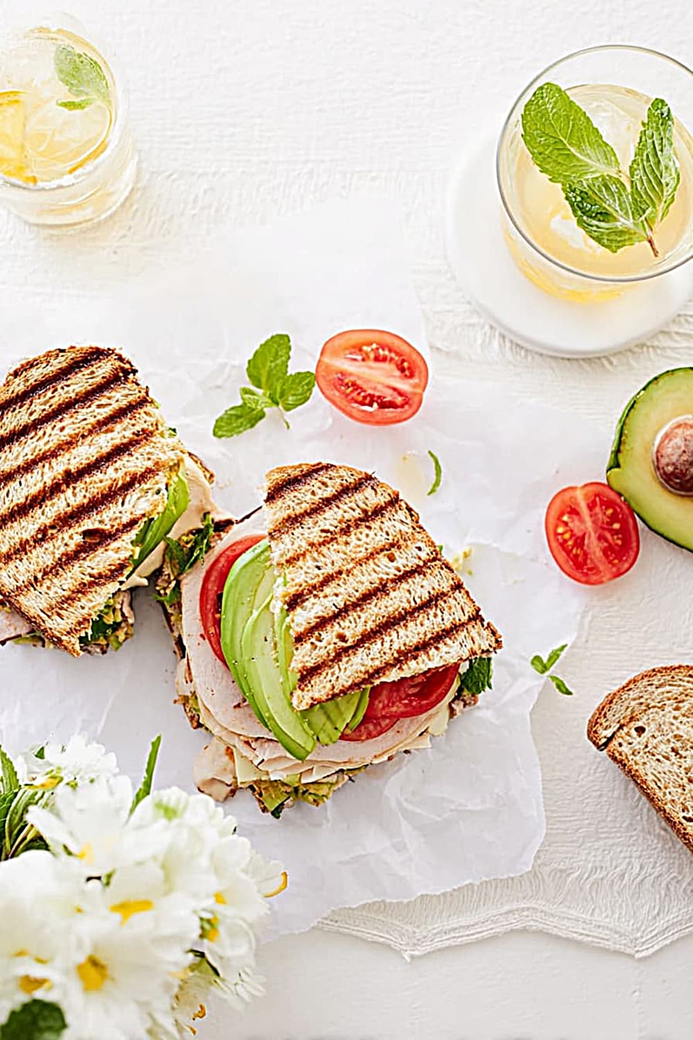 - 5 On one slice of bread (mayonnaise and basil side up), layer the ingredients in this specific order: pepper Jack cheese slice, 4 ounces sliced turkey (distributed evenly), the sautéed scallions, 3 avocado slices, and finally the 3 tomato slices. This layering ensures the cheese melts properly and the ingredients stay in place.