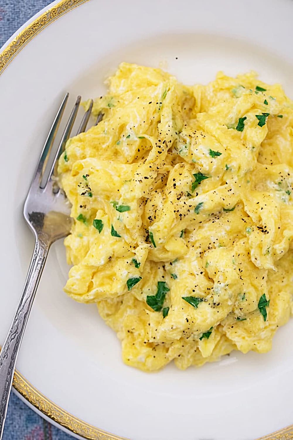 These eggs are best served immediately, but you can prep the egg mixture up to 2 hours ahead and store it covered in the refrigerator. Leftover cooked eggs can be refrigerated for up to 2 days and gently reheated in a low-temperature oven or microwave at 50% power. For meal prep, consider doubling the recipe and using leftovers in breakfast burritos or egg salad sandwiches.