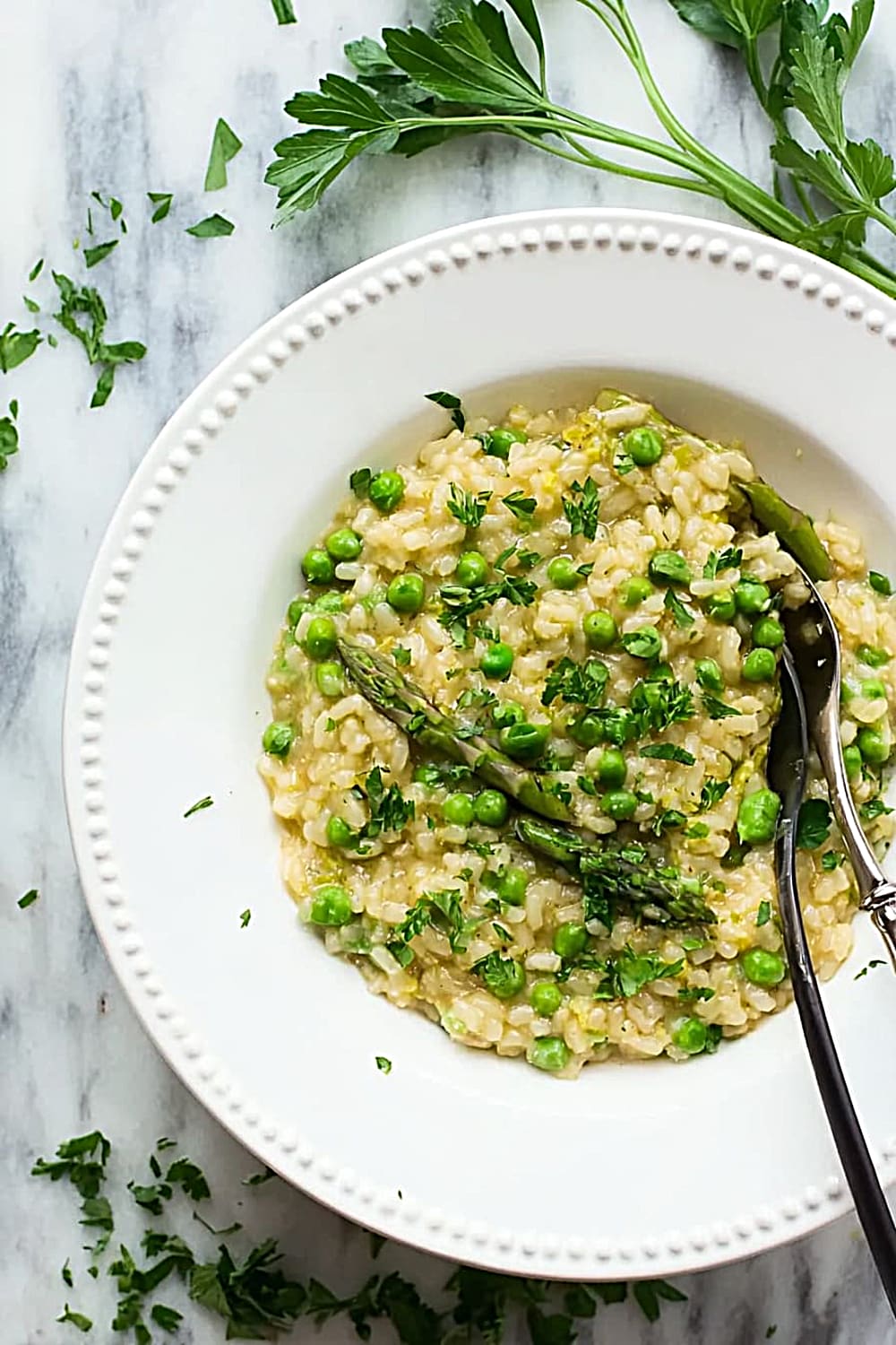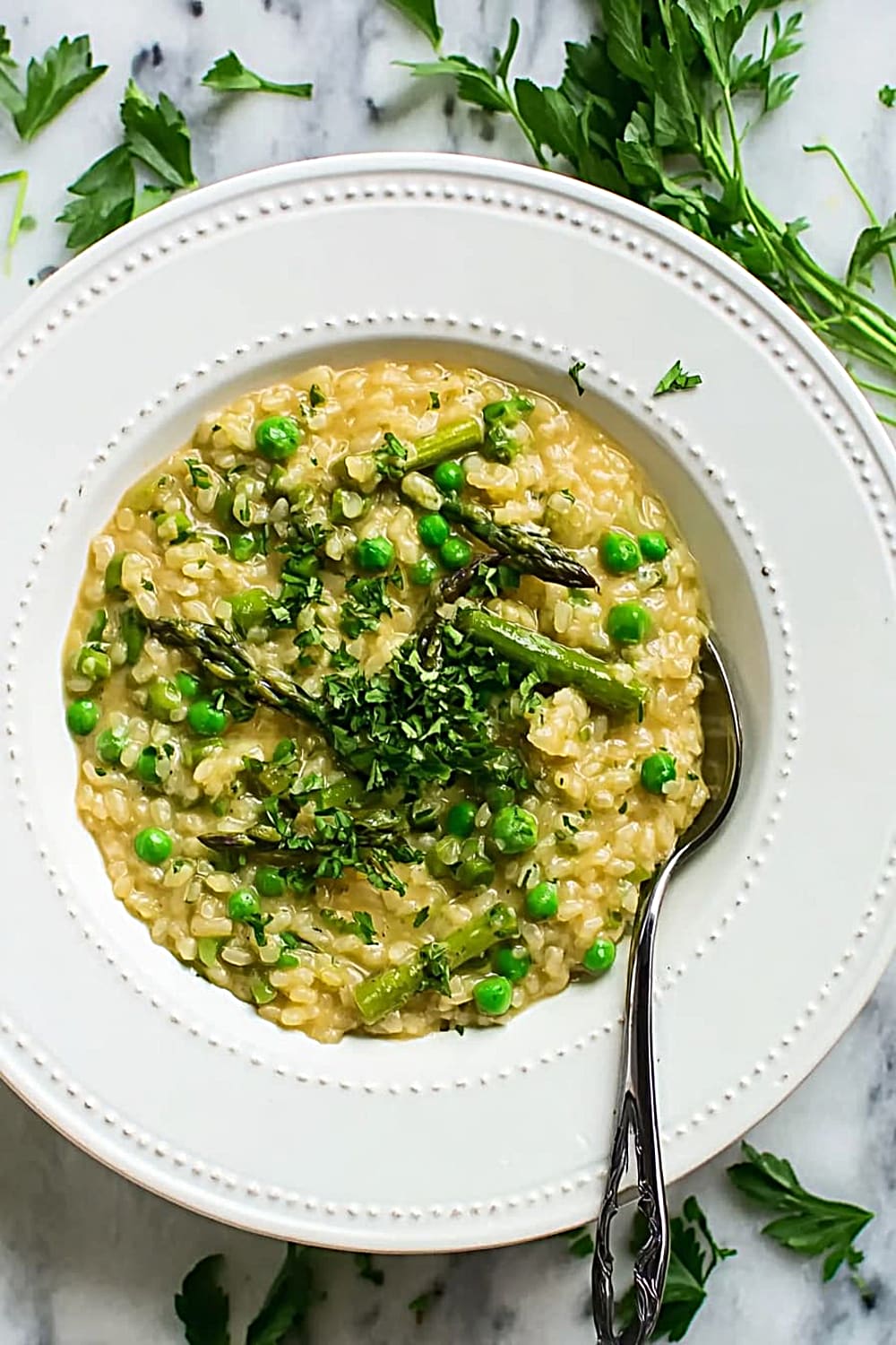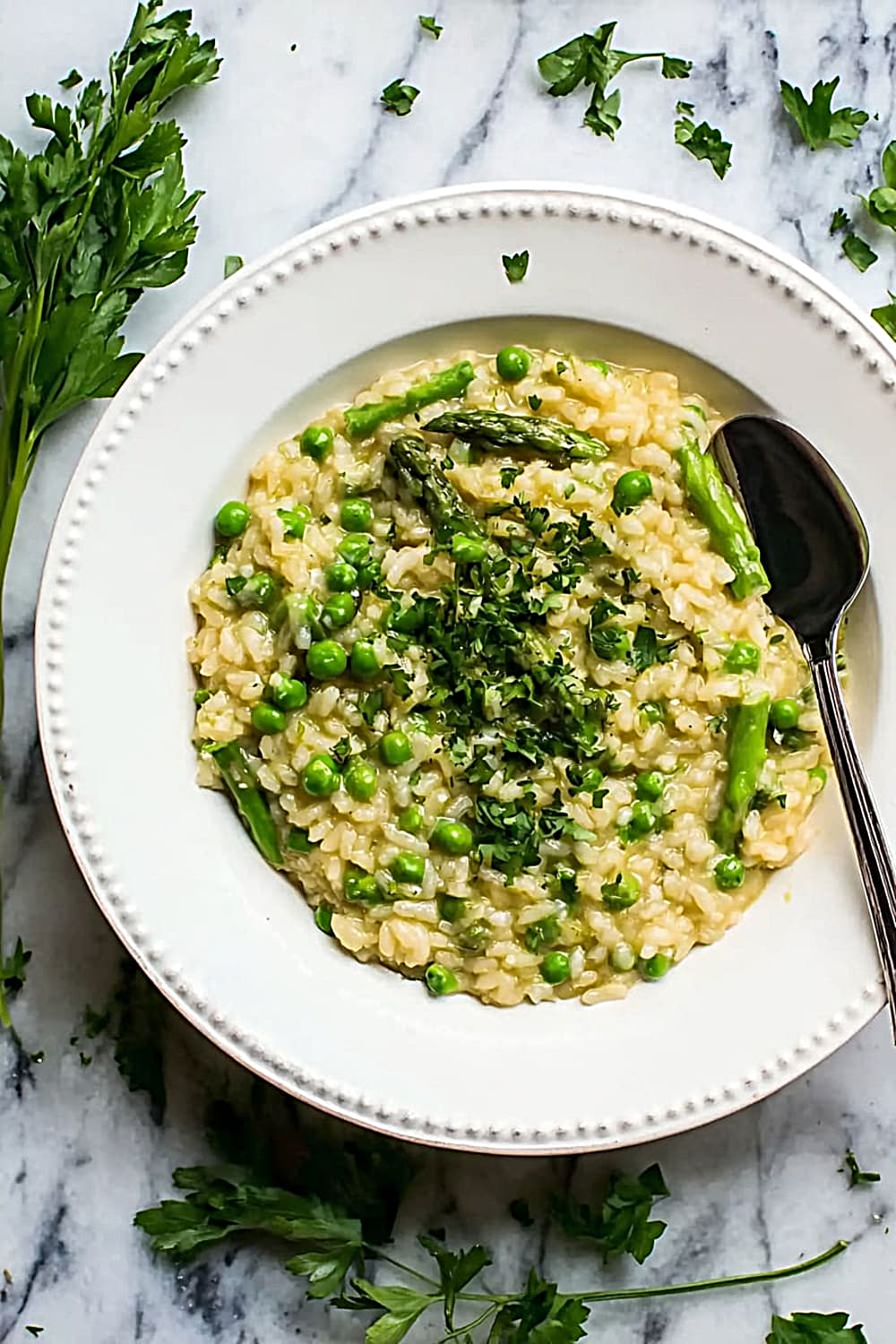 The combination of sweet English peas, tender roasted asparagus, and nutty brown arborio rice creates a symphony of flavors and textures that’ll make your taste buds sing with joy.