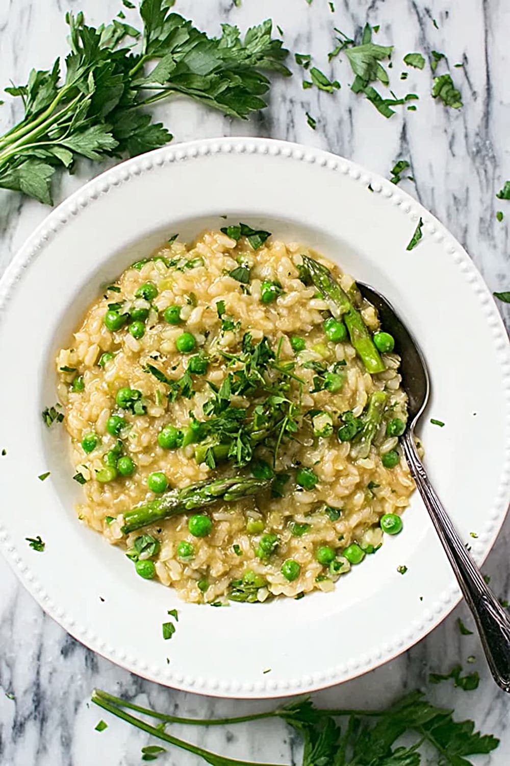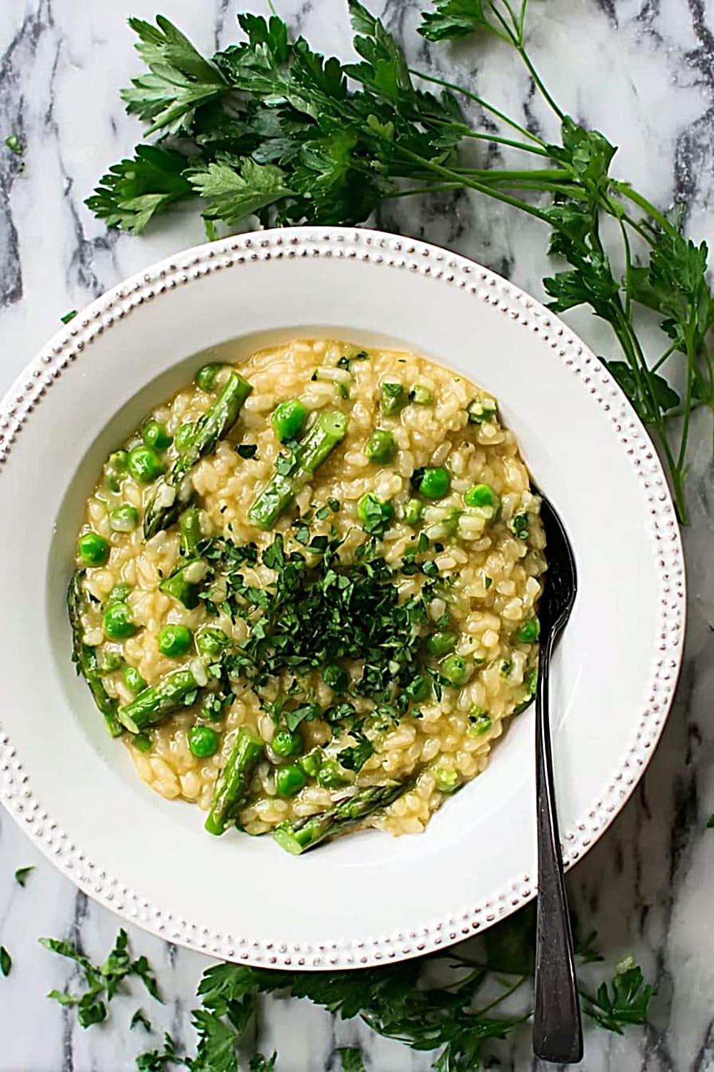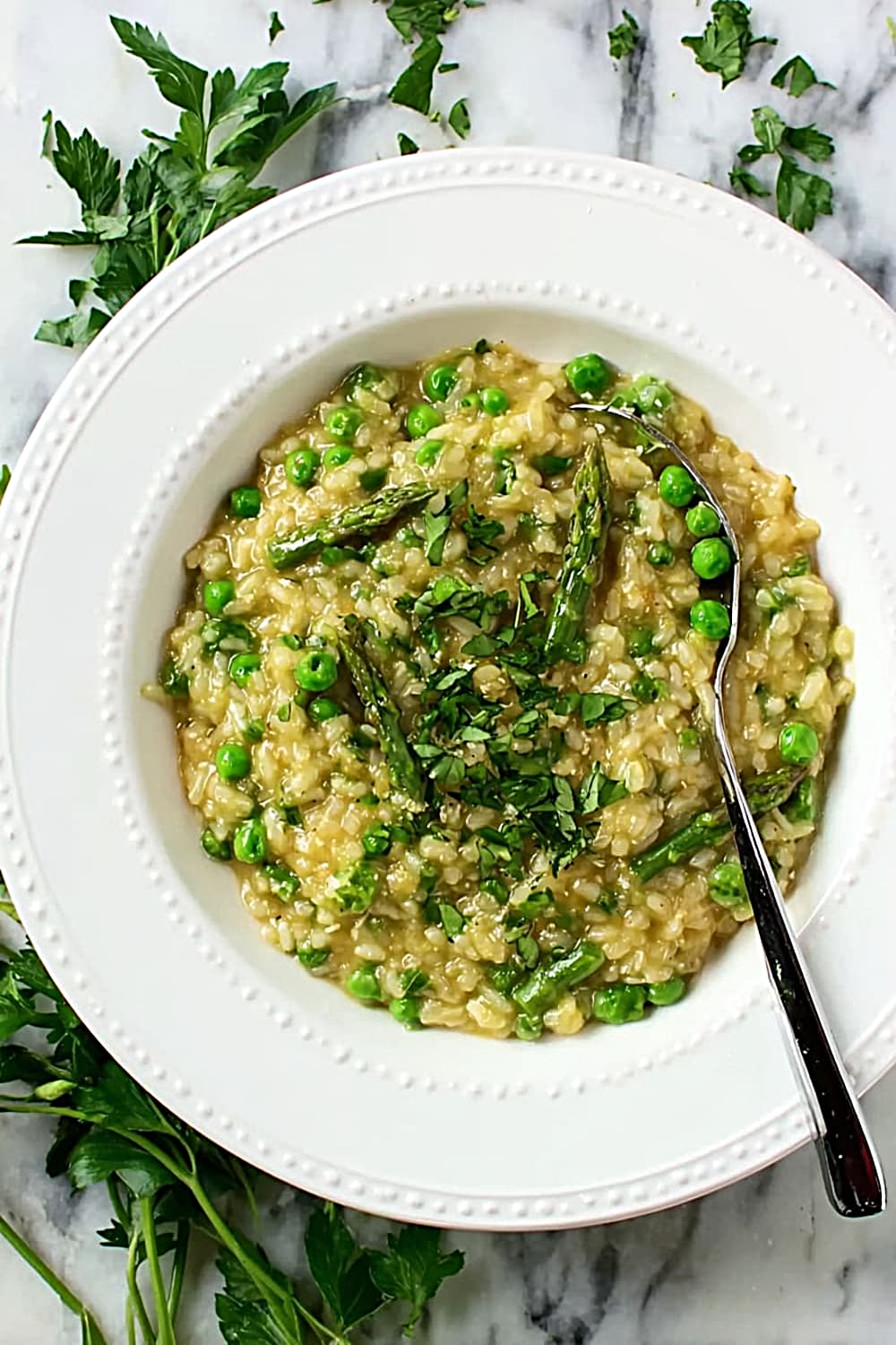 The combination of sweet English peas, tender roasted asparagus, and nutty brown arborio rice creates a symphony of flavors and textures that’ll make your taste buds sing with joy.