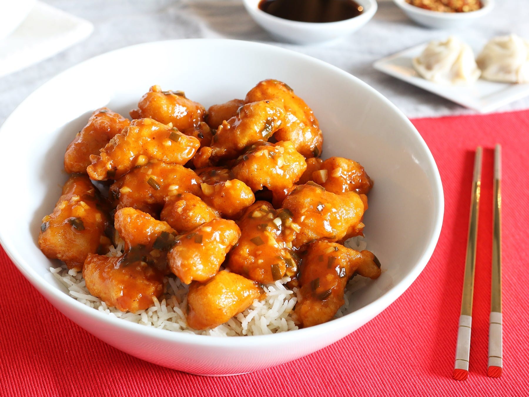 The secret sauce is what makes it spicy and rich. It has water, sugar, chili paste, vinegar, canola oil, garlic, chicken broth, corn starch, and sesame oil. These make the unique P.F. Chang’s flavors. You usually serve the dish with rice. But, you can try things like cauliflower rice for a lighter meal.