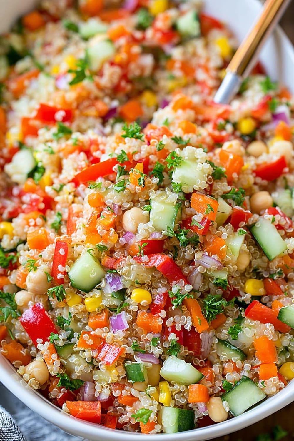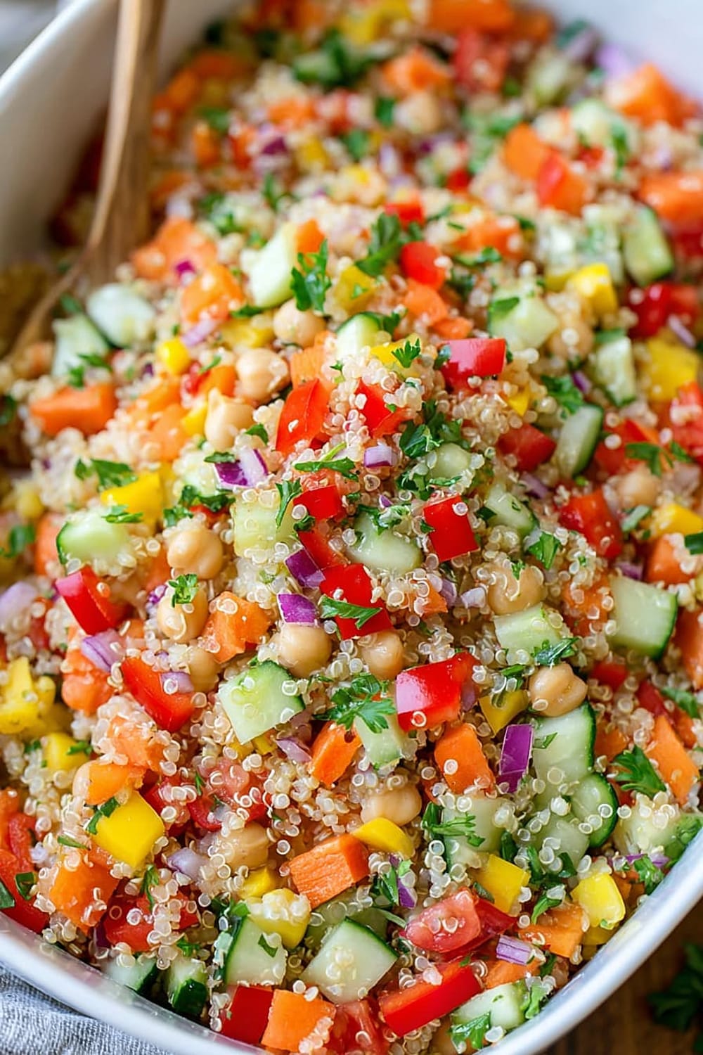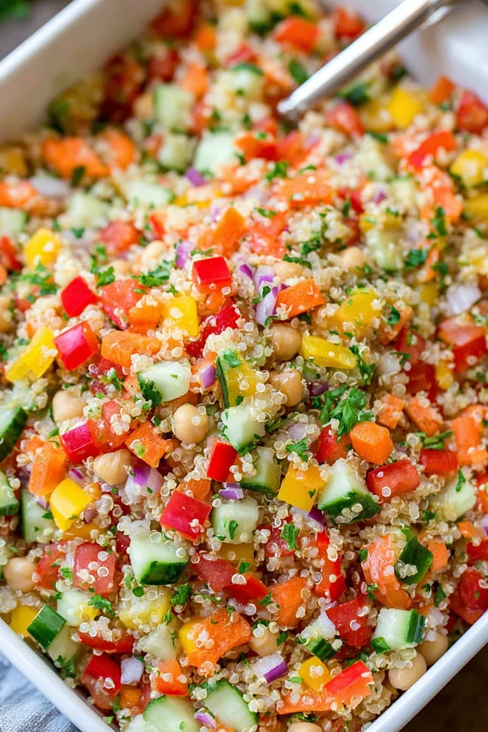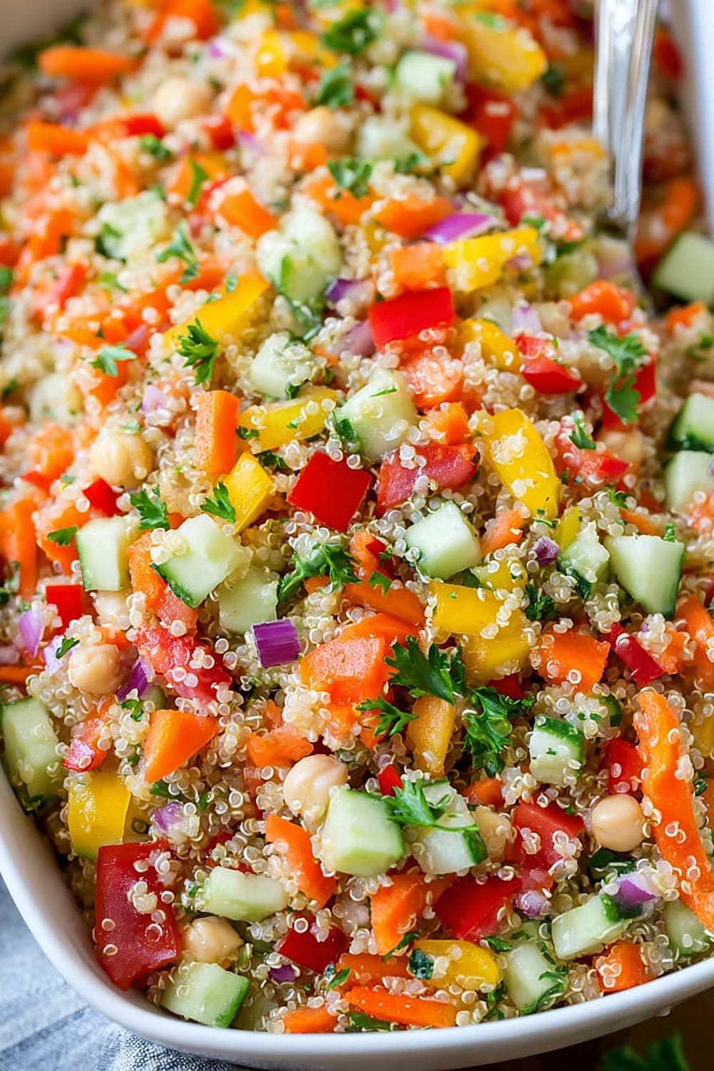 Every forkful delivers a satisfying crunch from fresh bell peppers and cucumbers, while the fluffy quinoa provides that perfect nutty base that makes this salad actually filling instead of leaving you hungry an hour later.