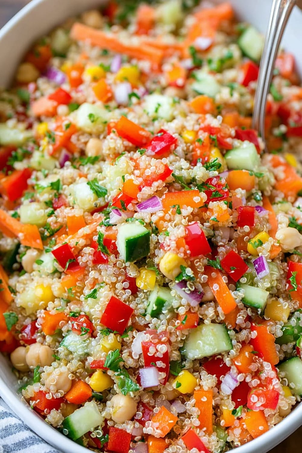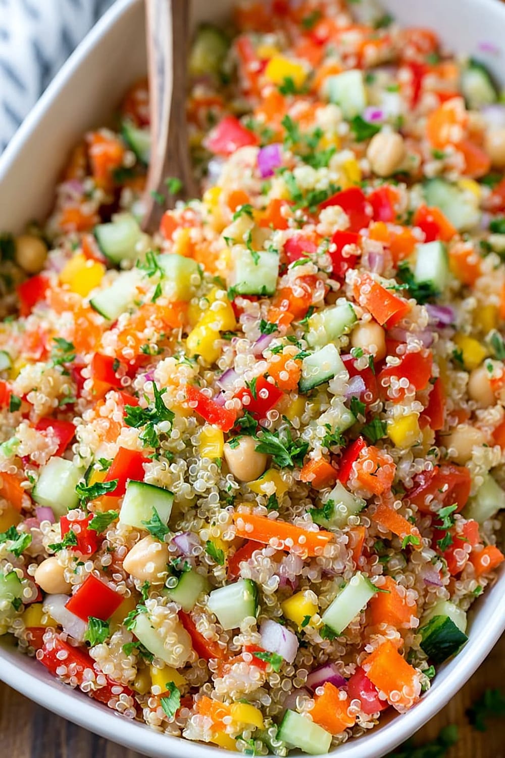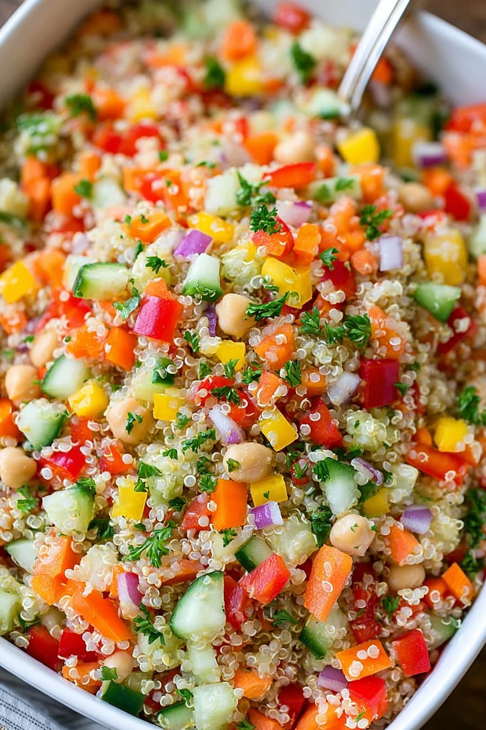 Every forkful delivers a satisfying crunch from fresh bell peppers and cucumbers, while the fluffy quinoa provides that perfect nutty base that makes this salad actually filling instead of leaving you hungry an hour later.