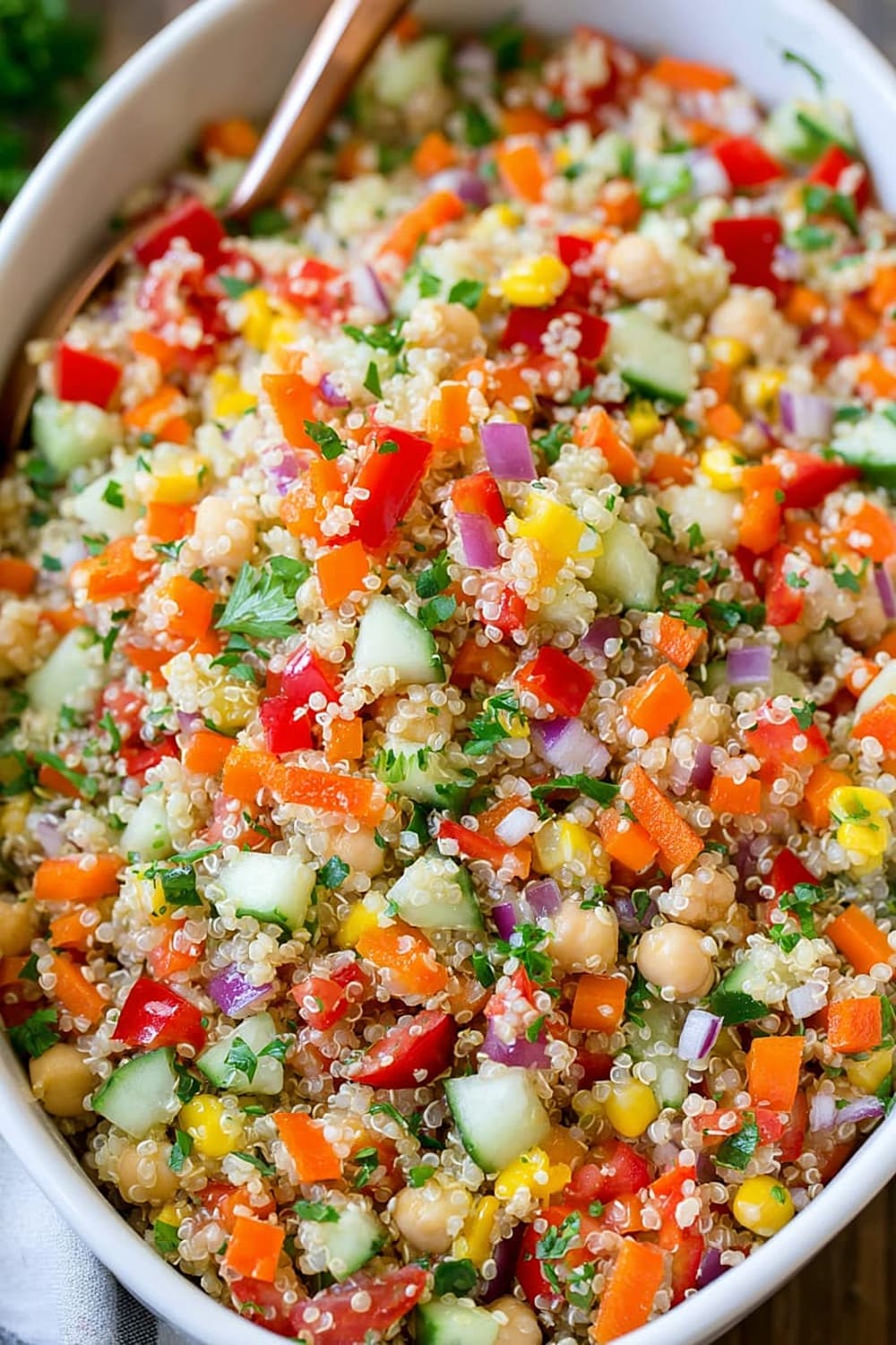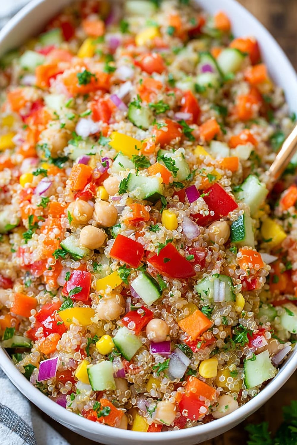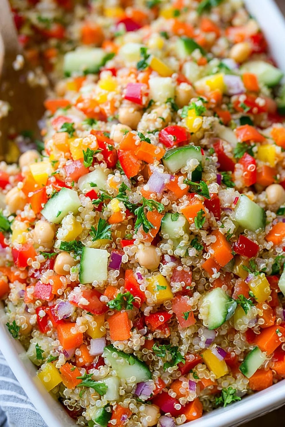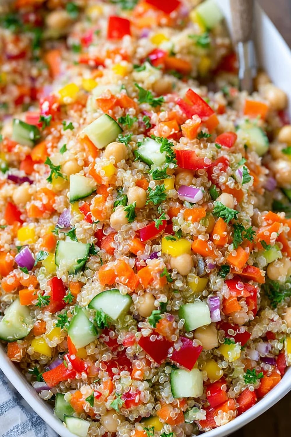 Every forkful delivers a satisfying crunch from fresh bell peppers and cucumbers, while the fluffy quinoa provides that perfect nutty base that makes this salad actually filling instead of leaving you hungry an hour later.