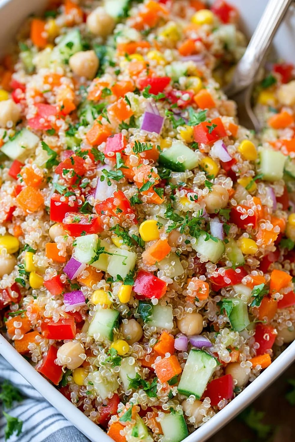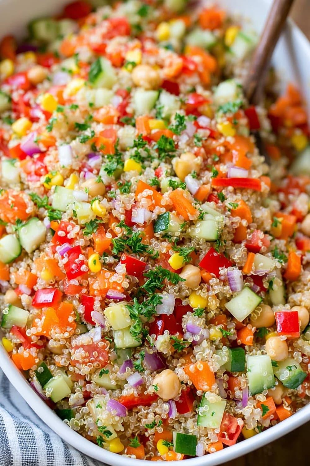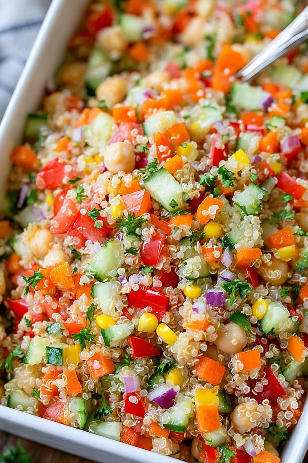 - 11 Combine the cooled quinoa with all prepared vegetables, chickpeas, and corn in a large mixing bowl. The quinoa should be completely cool to prevent wilting the fresh vegetables.
