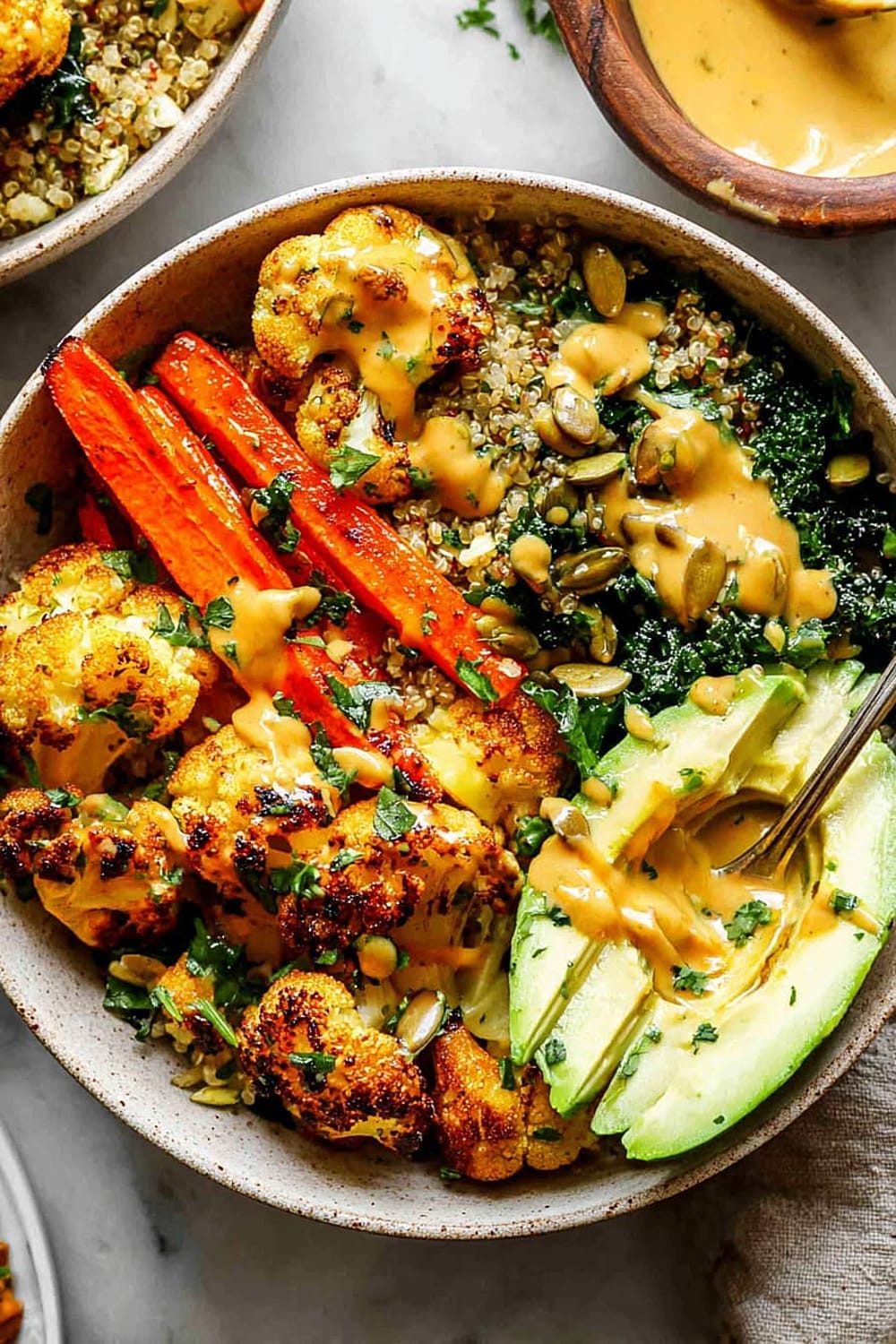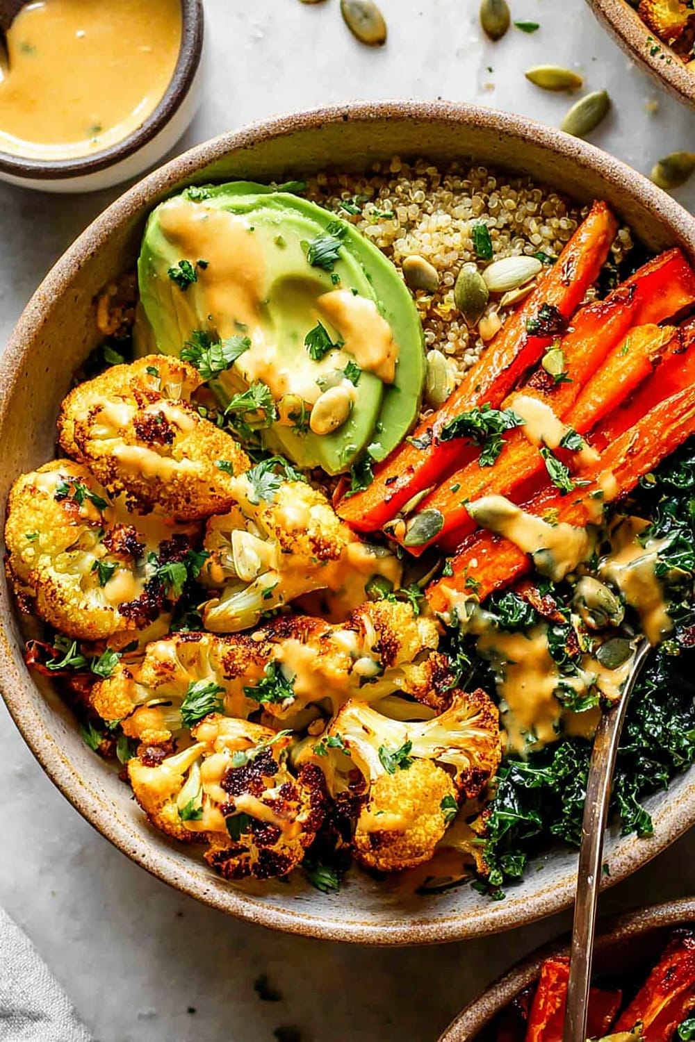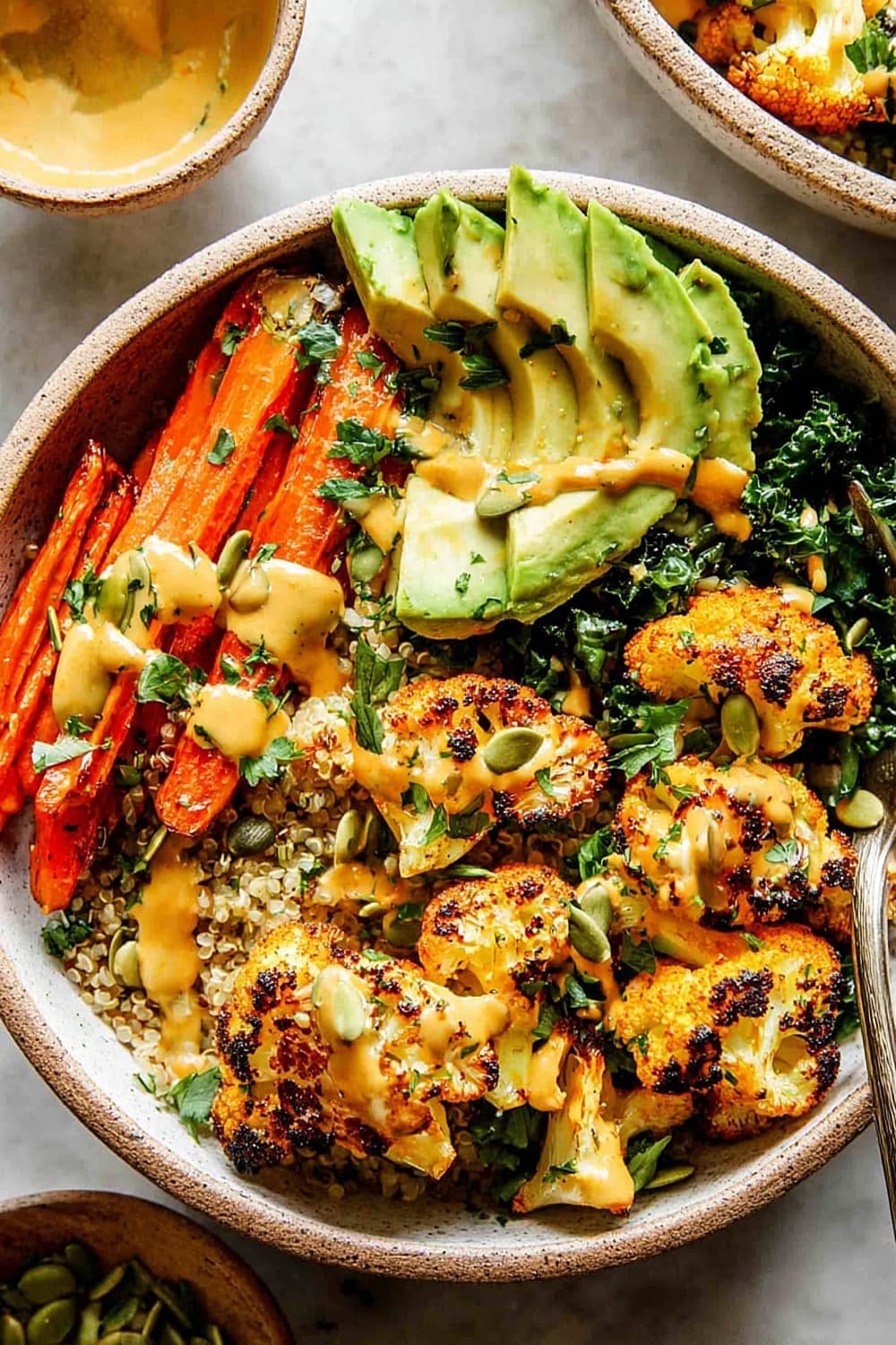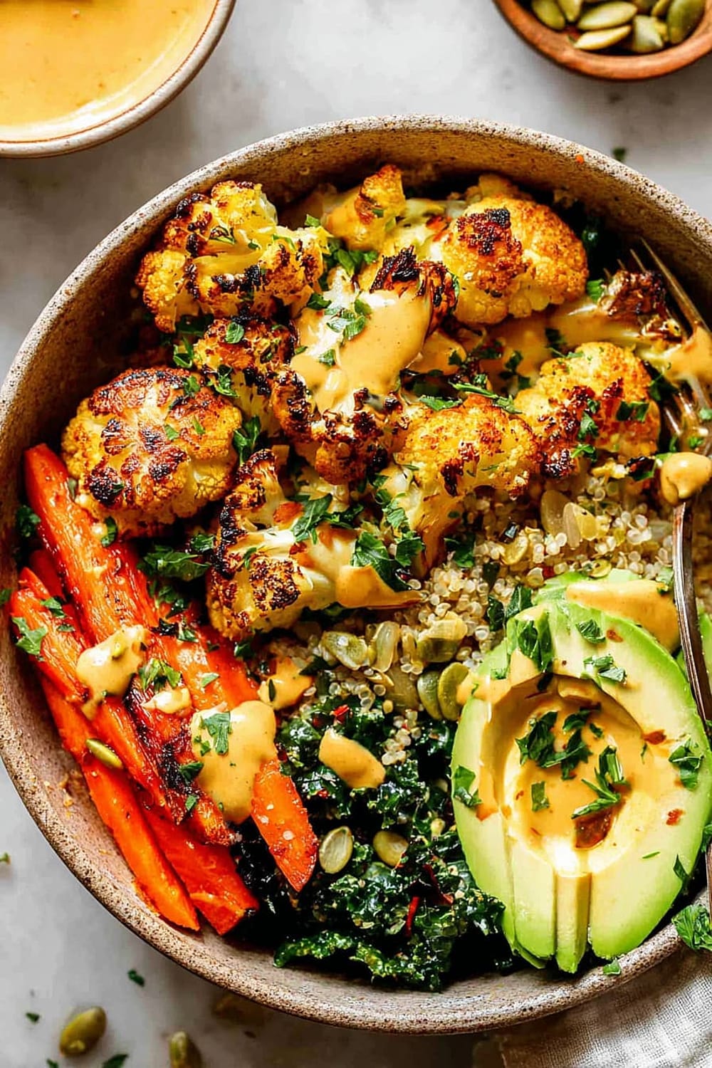 - 8 Assemble bowls by dividing the quinoa and kale mixture evenly between four serving bowls. Arrange the roasted vegetables on top, add sliced avocado, and drizzle generously with the Golden Tahini Dressing. Finish with 1 tablespoon pumpkin seeds per bowl and a sprinkle of fresh chopped parsley.