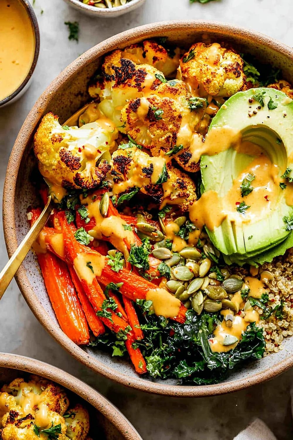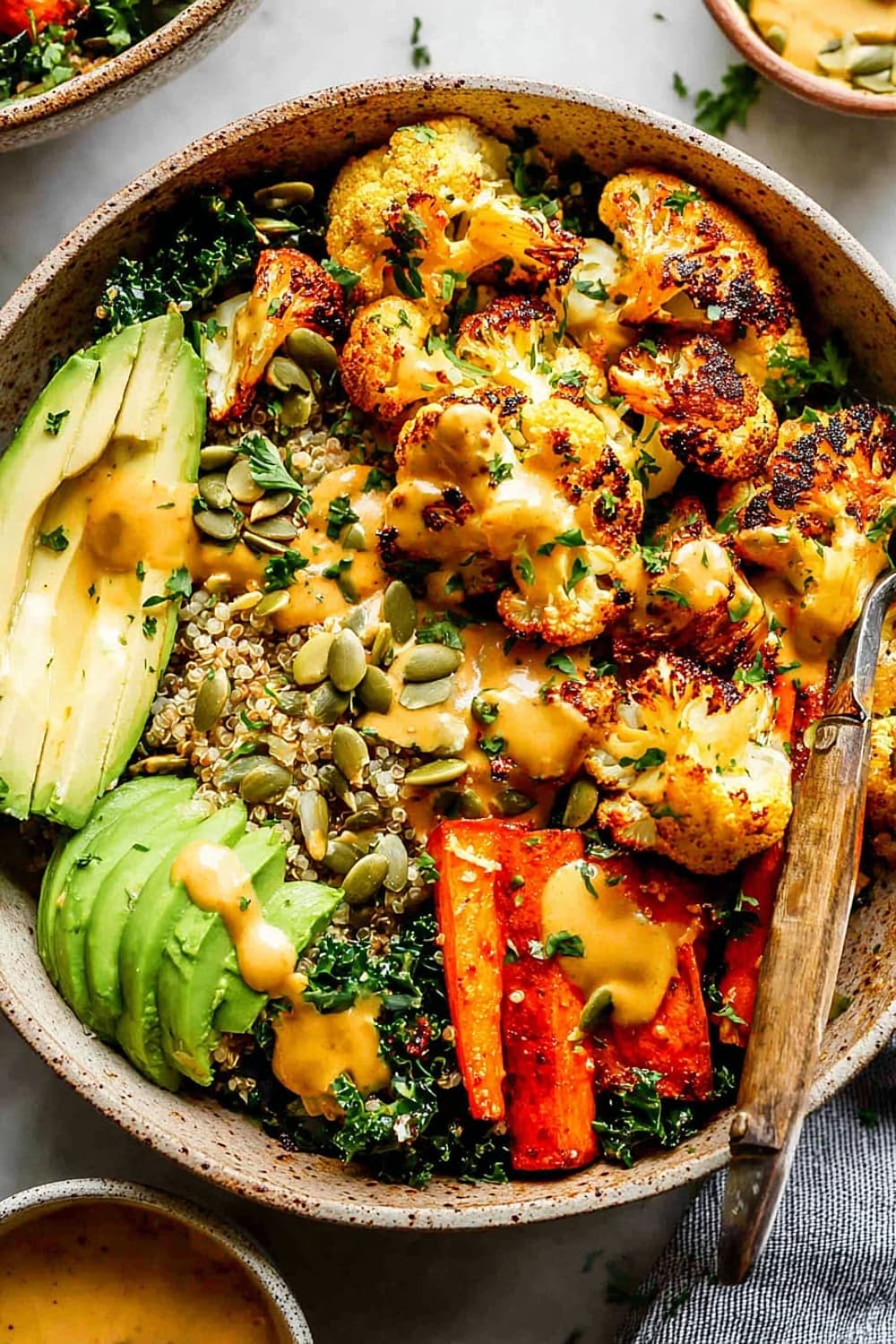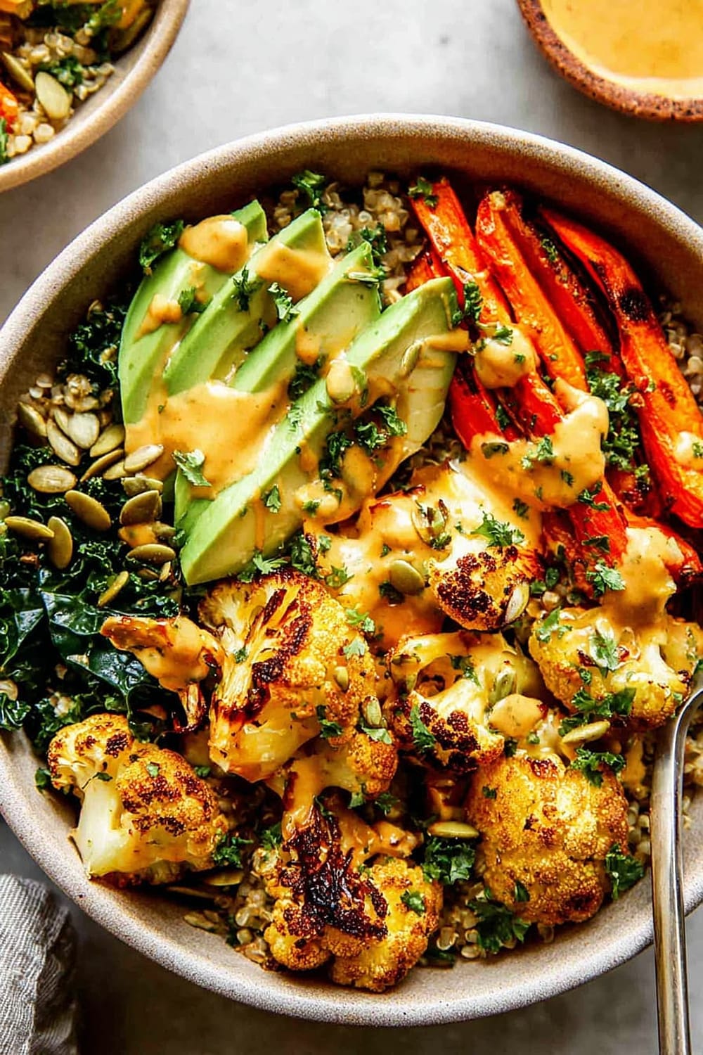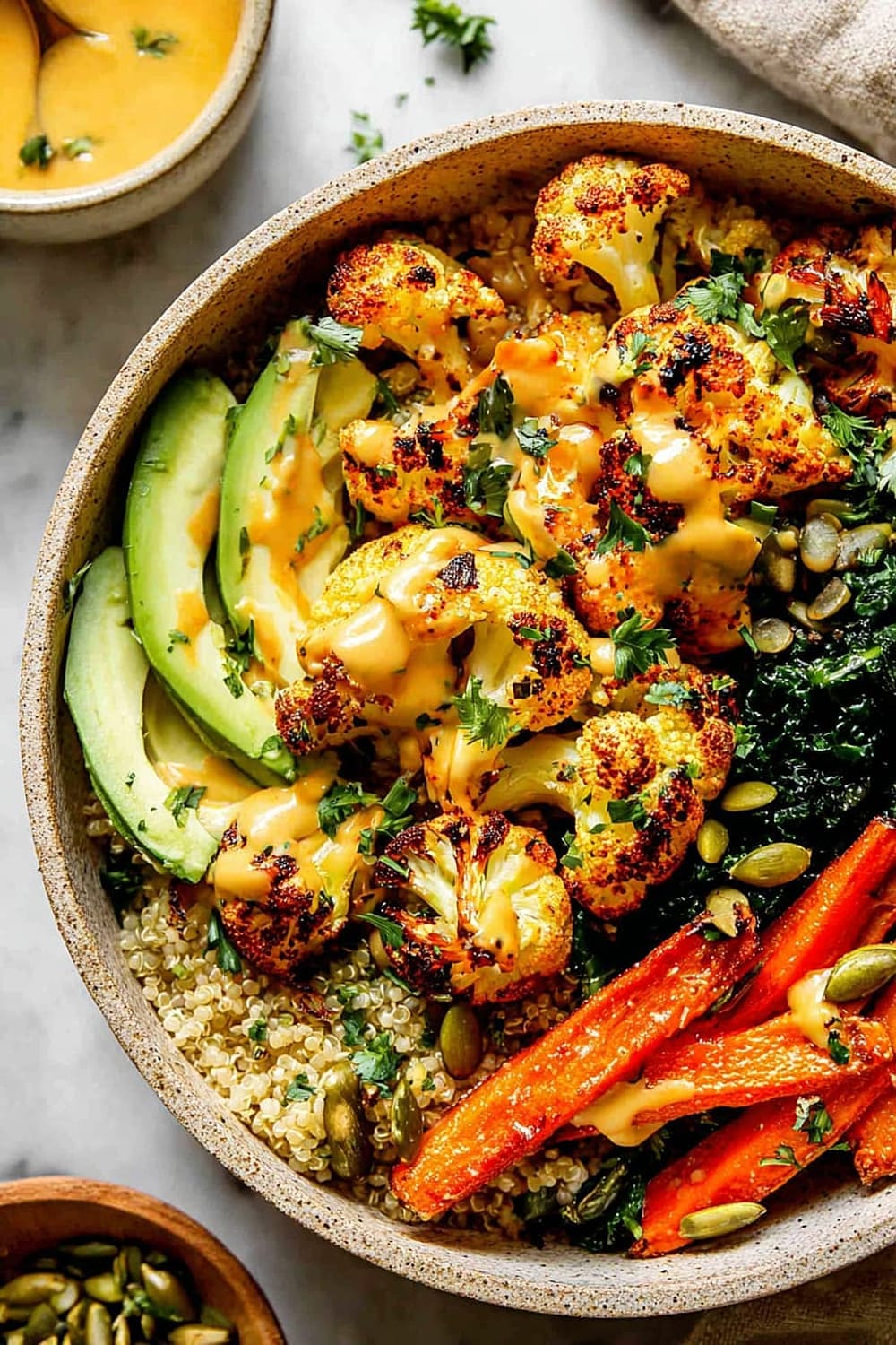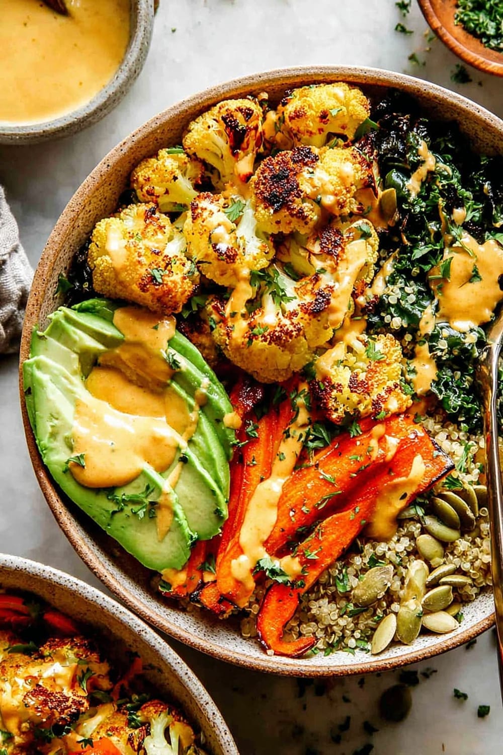 - 8 Assemble bowls by dividing the quinoa and kale mixture evenly between four serving bowls. Arrange the roasted vegetables on top, add sliced avocado, and drizzle generously with the Golden Tahini Dressing. Finish with 1 tablespoon pumpkin seeds per bowl and a sprinkle of fresh chopped parsley.