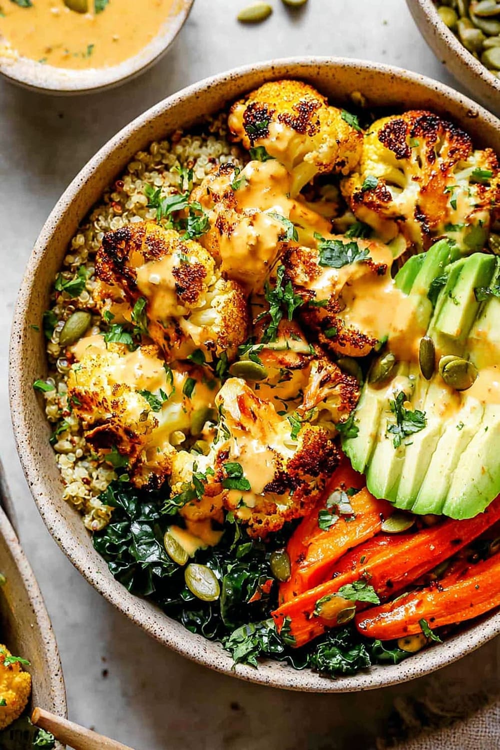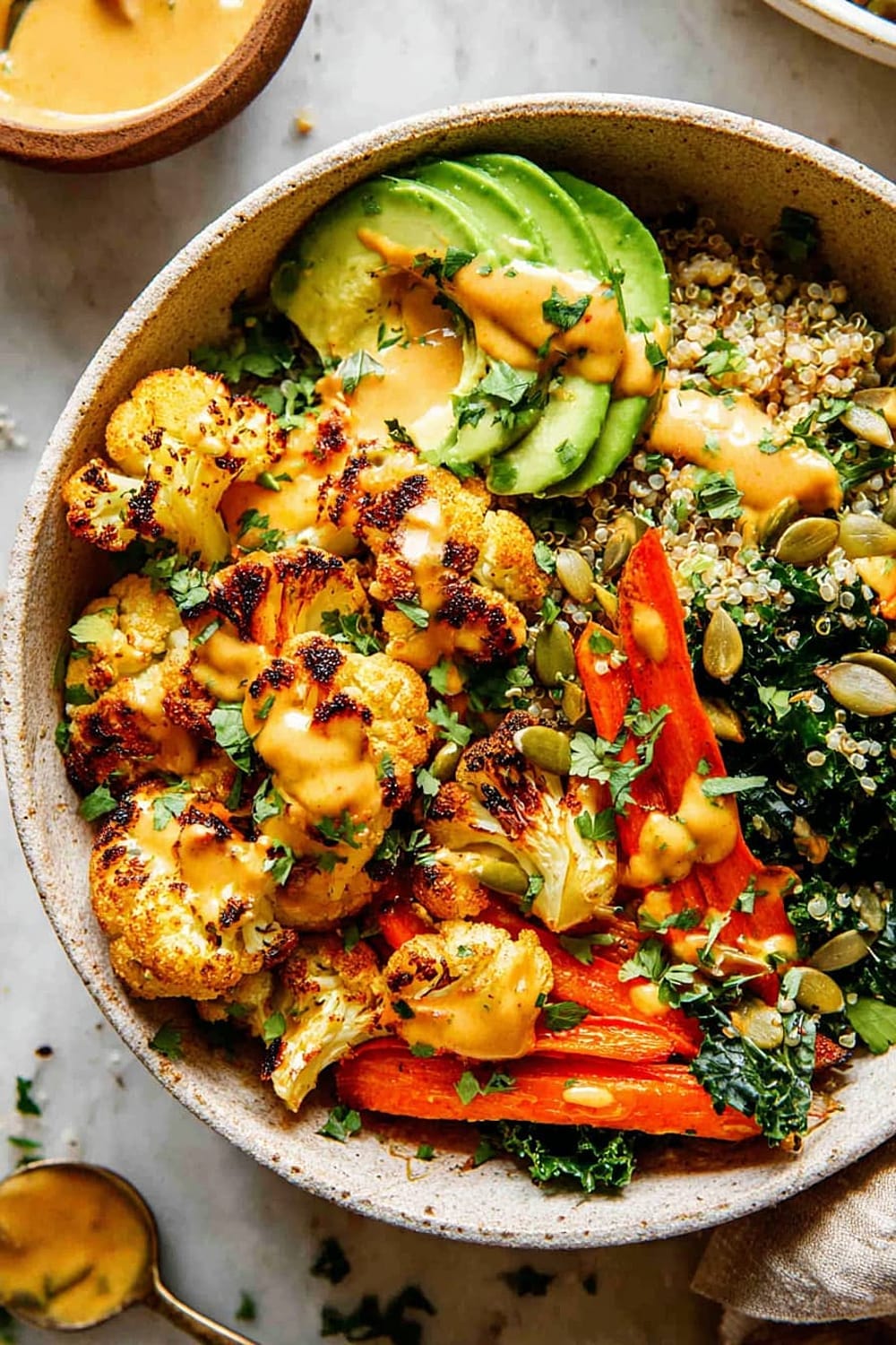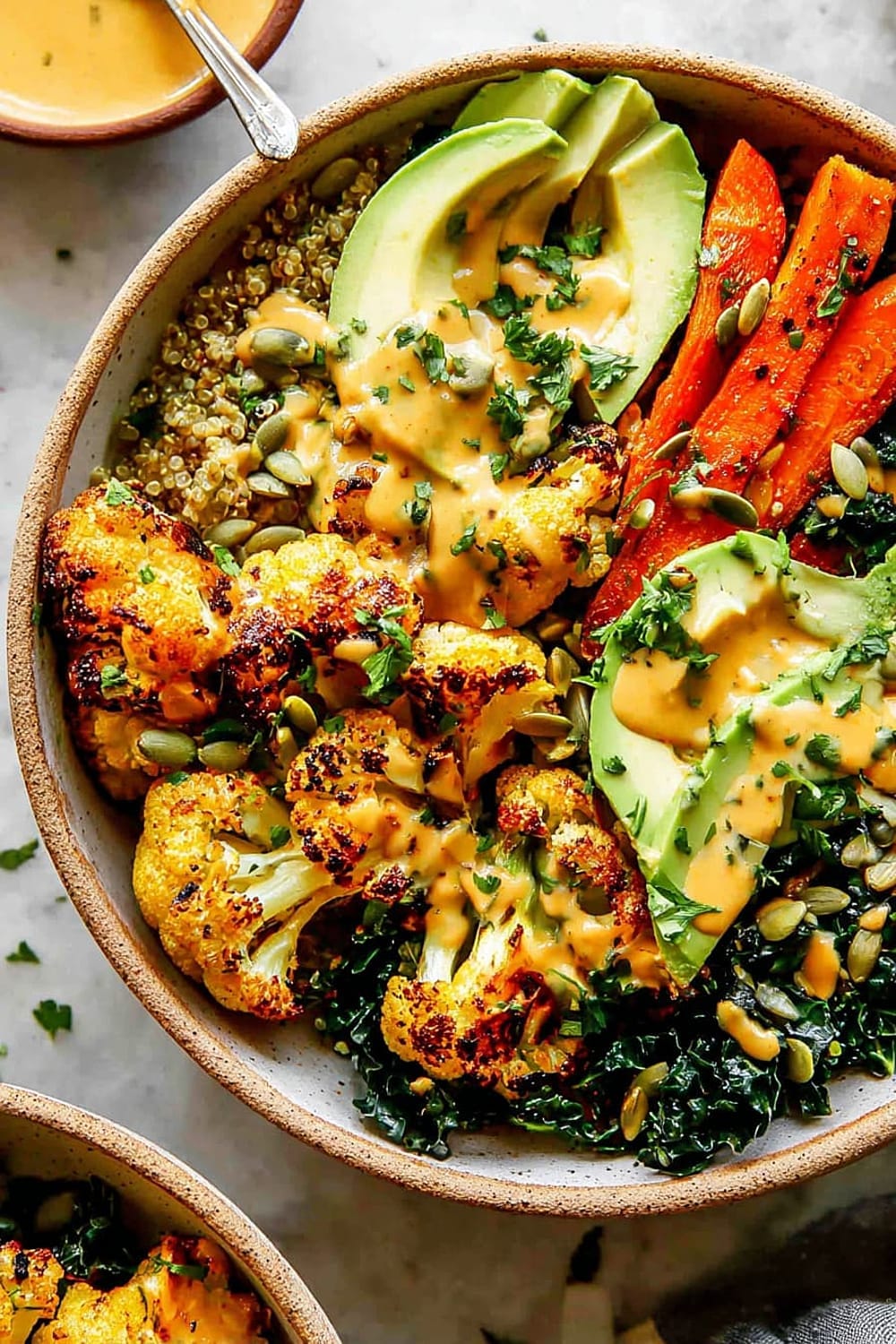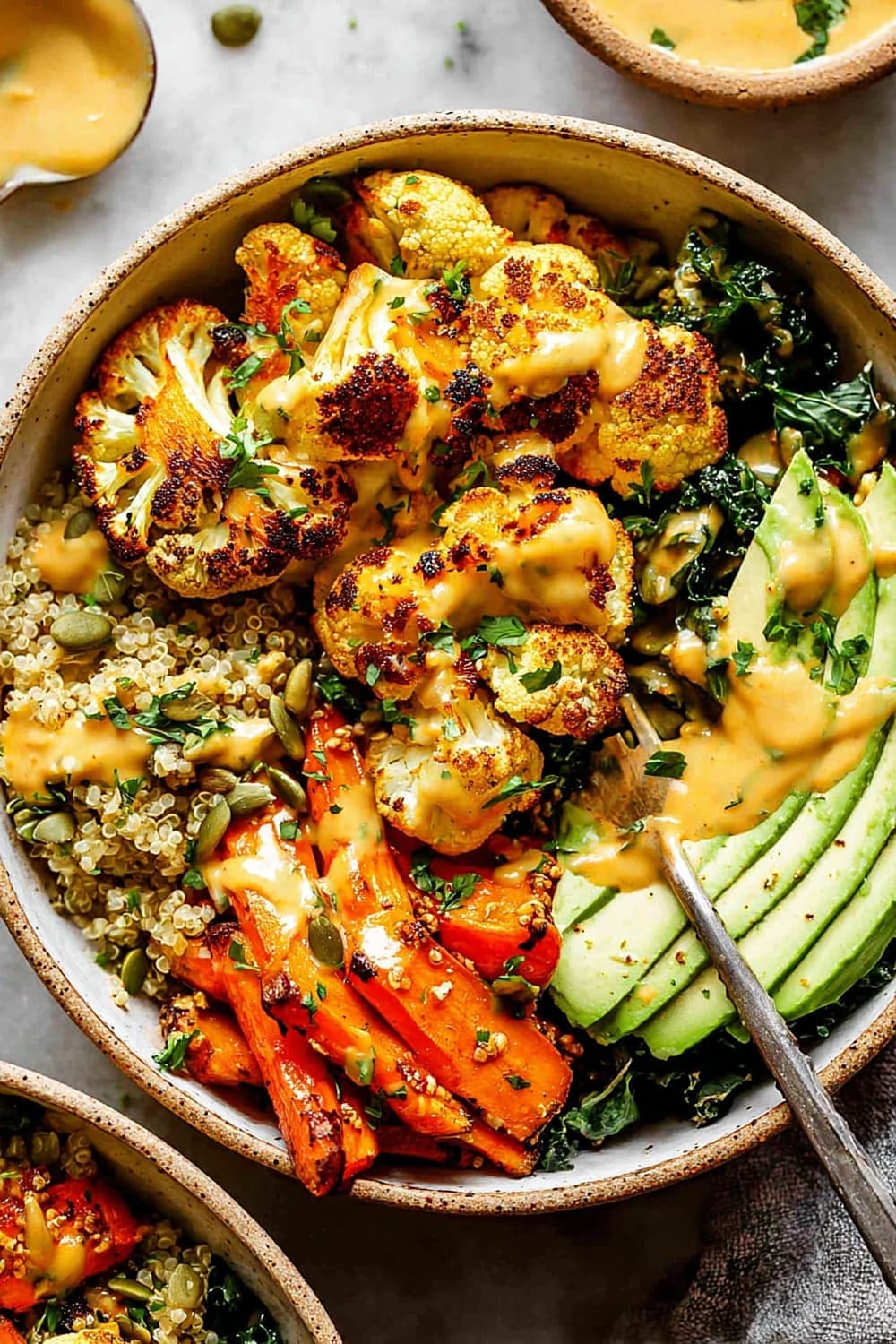 - 8 Assemble bowls by dividing the quinoa and kale mixture evenly between four serving bowls. Arrange the roasted vegetables on top, add sliced avocado, and drizzle generously with the Golden Tahini Dressing. Finish with 1 tablespoon pumpkin seeds per bowl and a sprinkle of fresh chopped parsley.